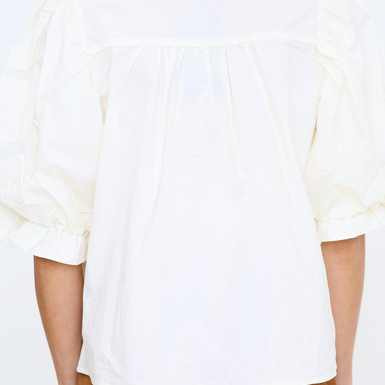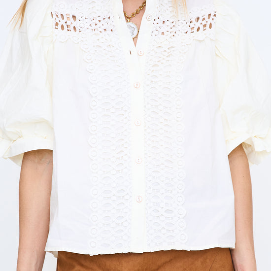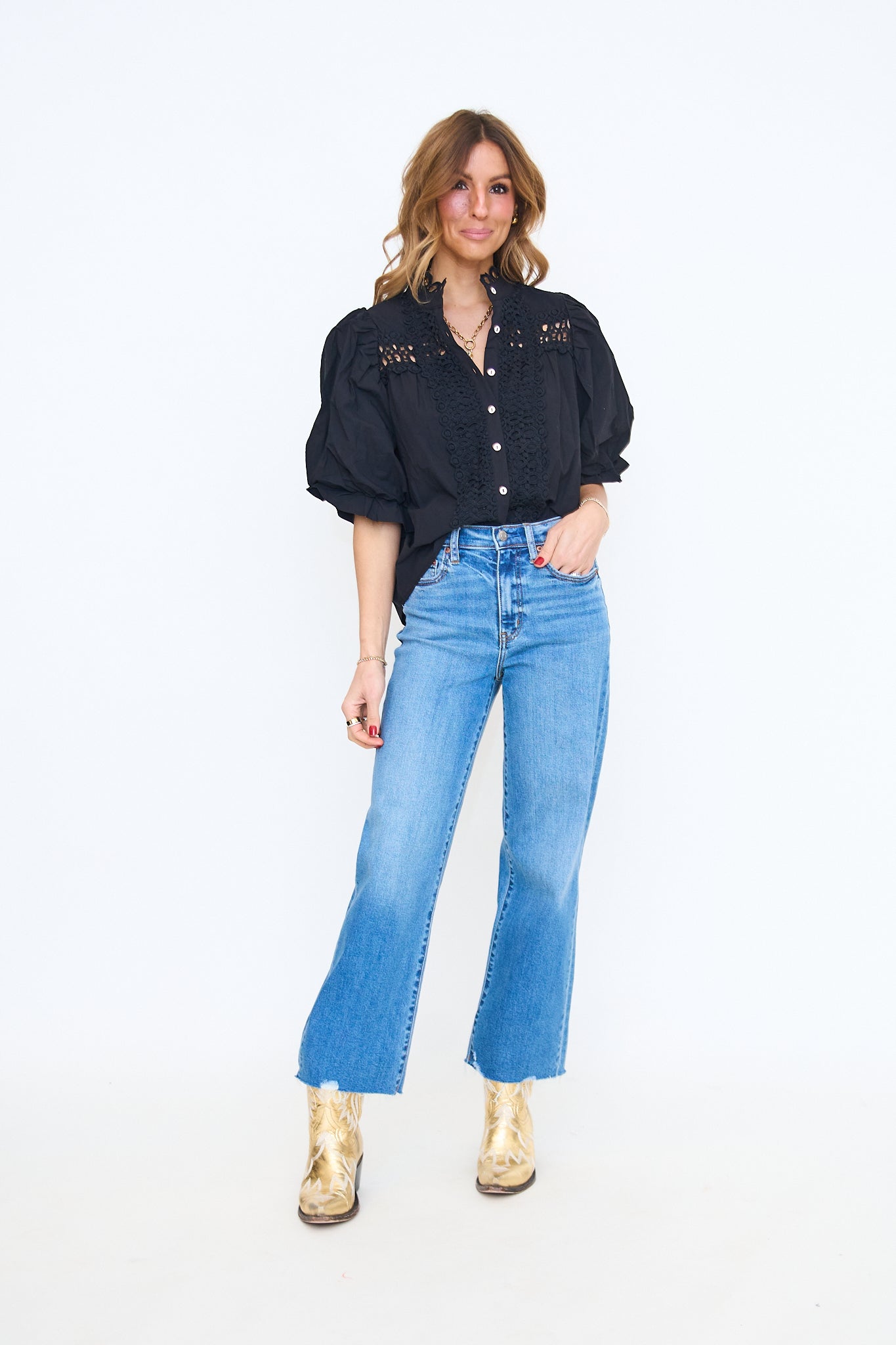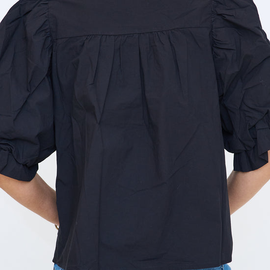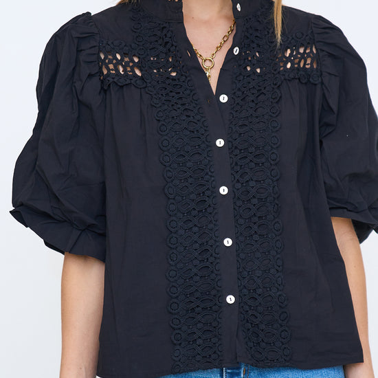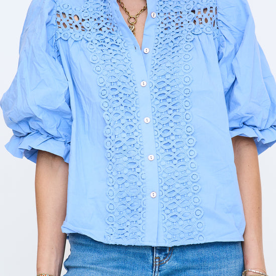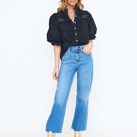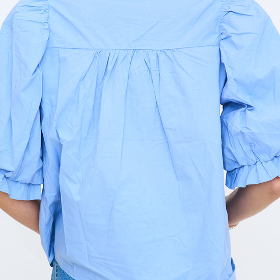 Trim Detail Button Down Blouse with 3/4 Length Gathered Balloon Sleeves