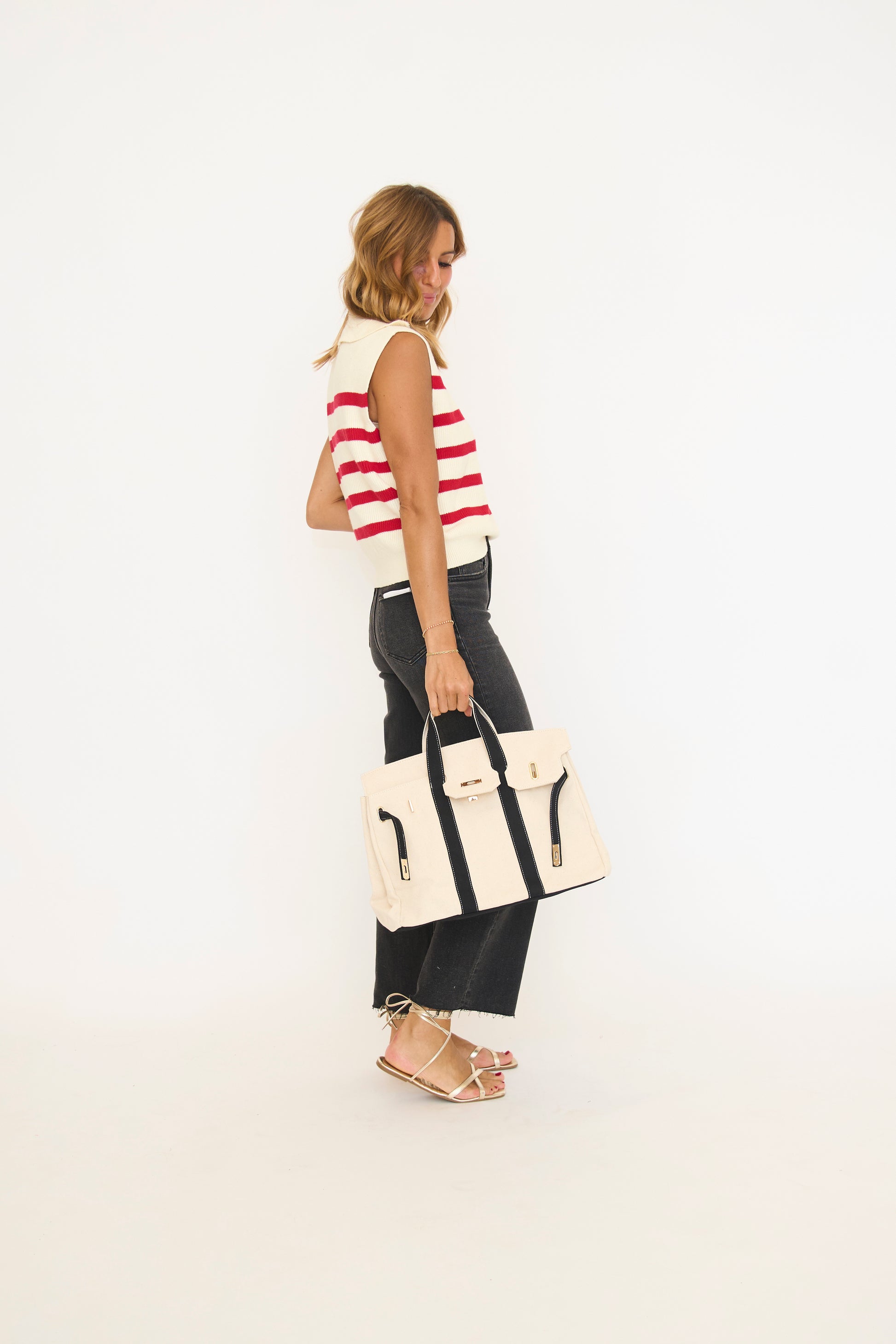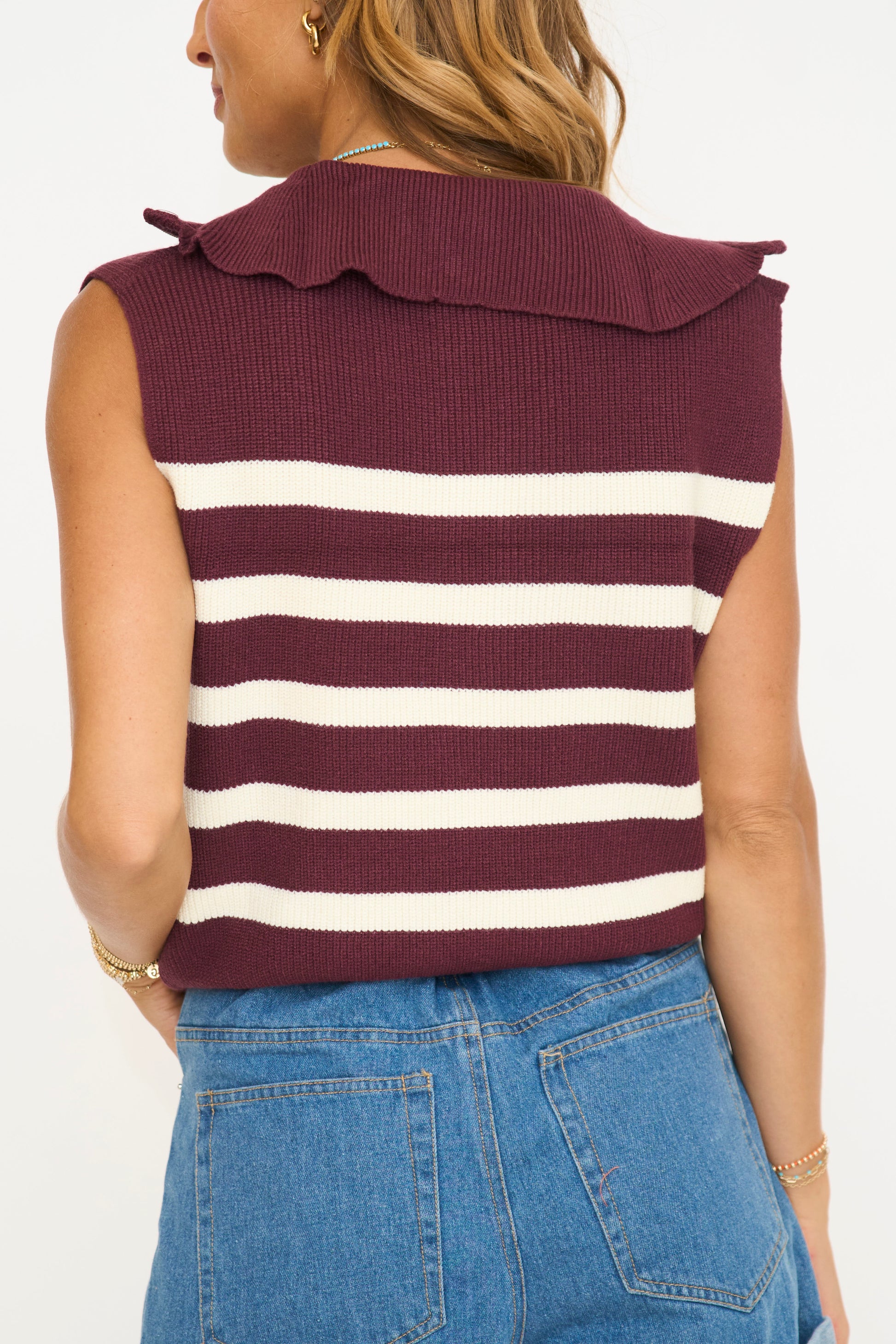 This striped knit cropped sweater vest is ideal for layering. Perfect for casual outings, it's comfortable and versatile. Pair it with high-waisted jeans or skirts for a chic look. Transition seamlessly from day to night with this fashionable piece.