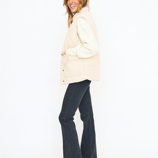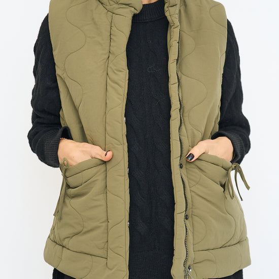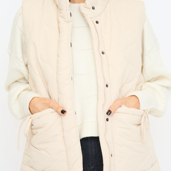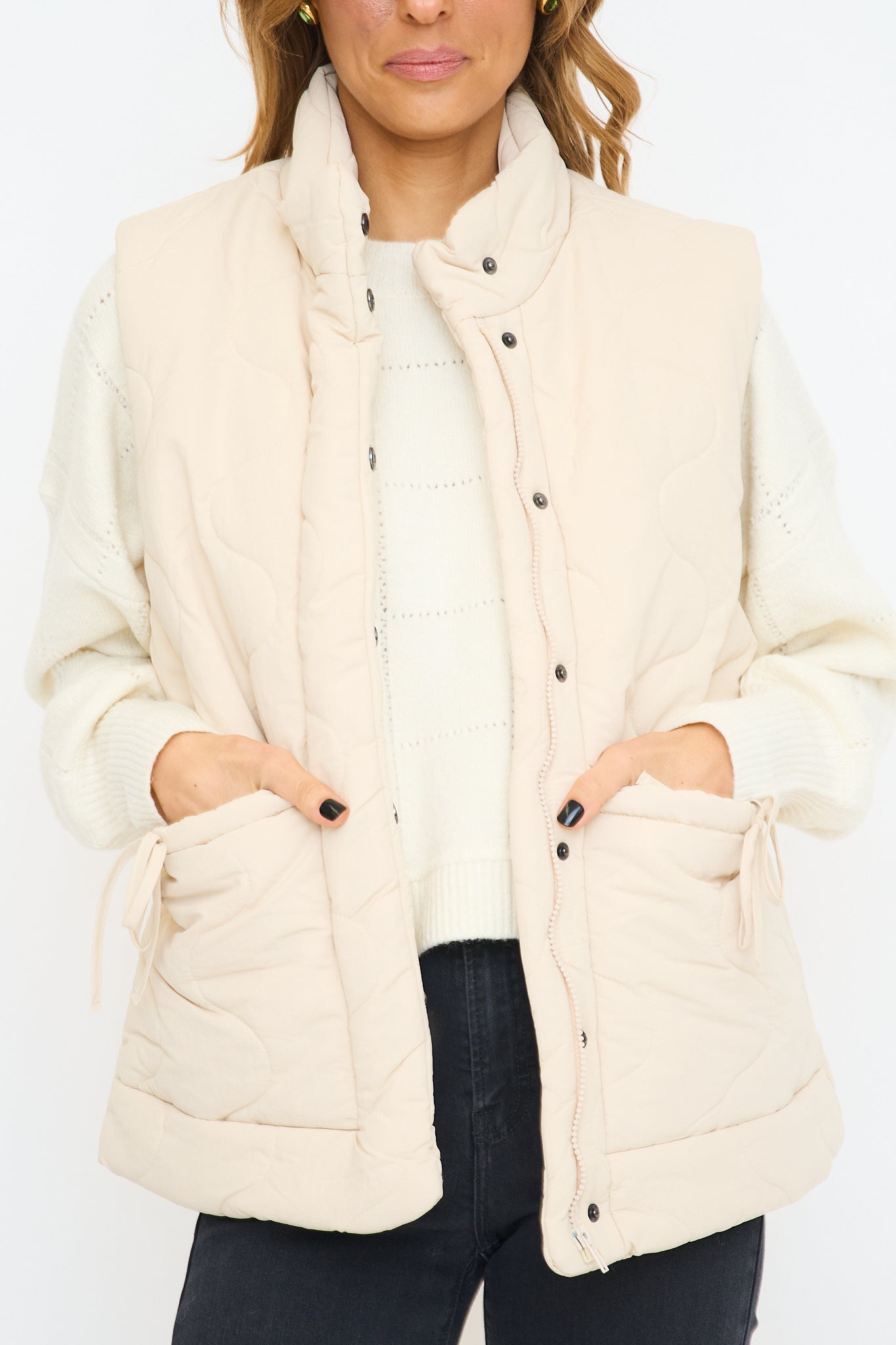 Embrace cooler days with this sleeveless puffer jacket, featuring distinctive wave quilting and drawstring ties at the waist for an adjustable fit. Ideal for layering over a long-sleeve tee or under a coat for extra warmth.