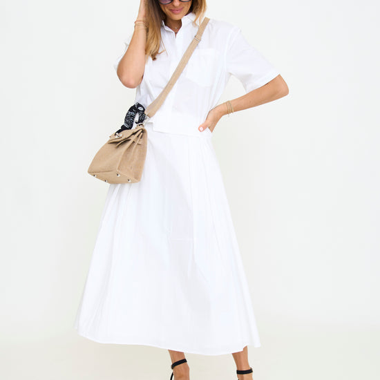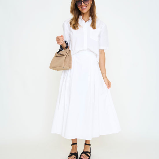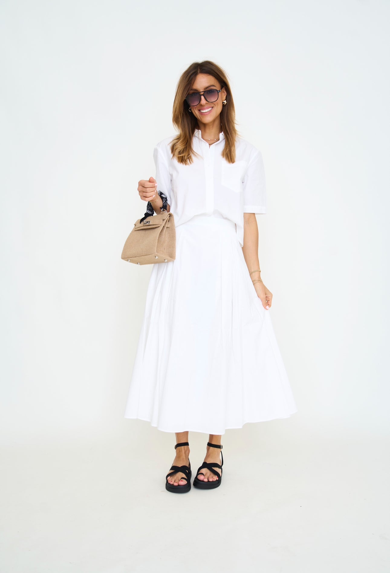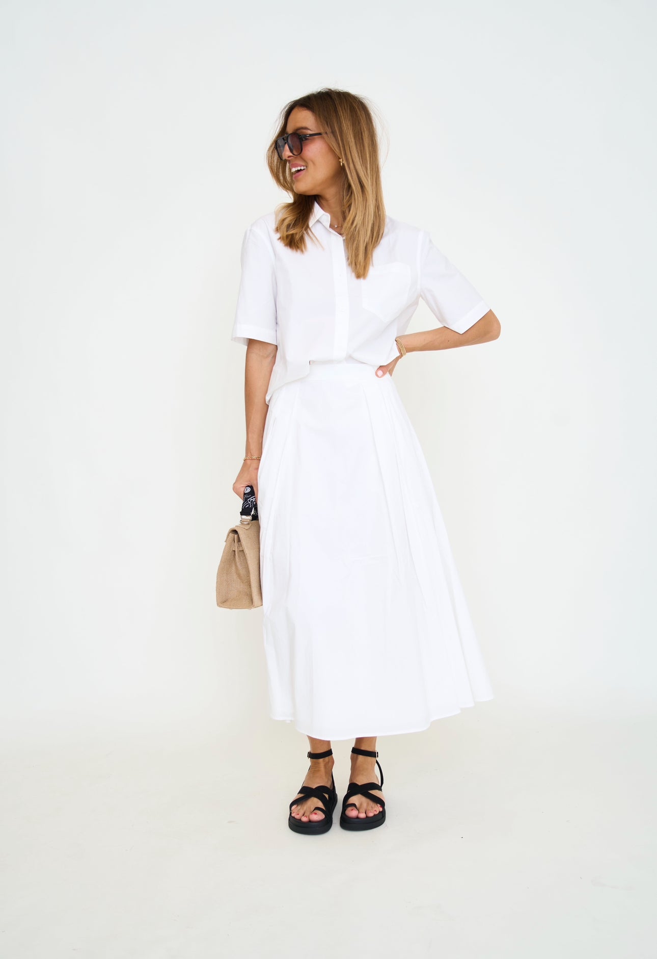 This midi length skirt features a fully lined interior, hidden zipper, and pleated detail for a flattering fit. With its high rise design, this cotton poplin skirt is a must-have for all of your Spring outfits! Try it with the coordinating IRENE POPLIN SHIRT for an easy and chic warm weather style.