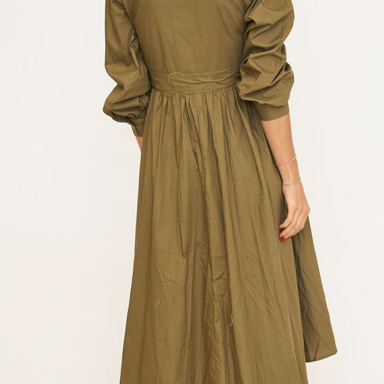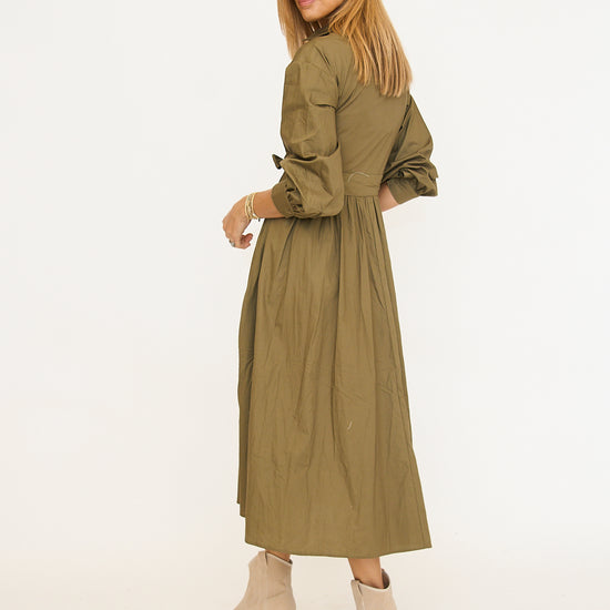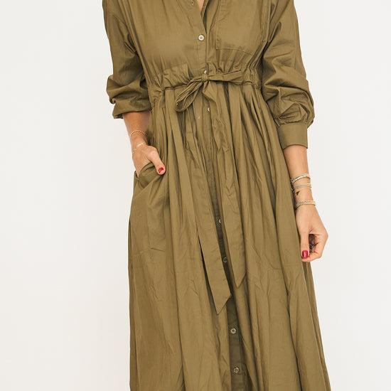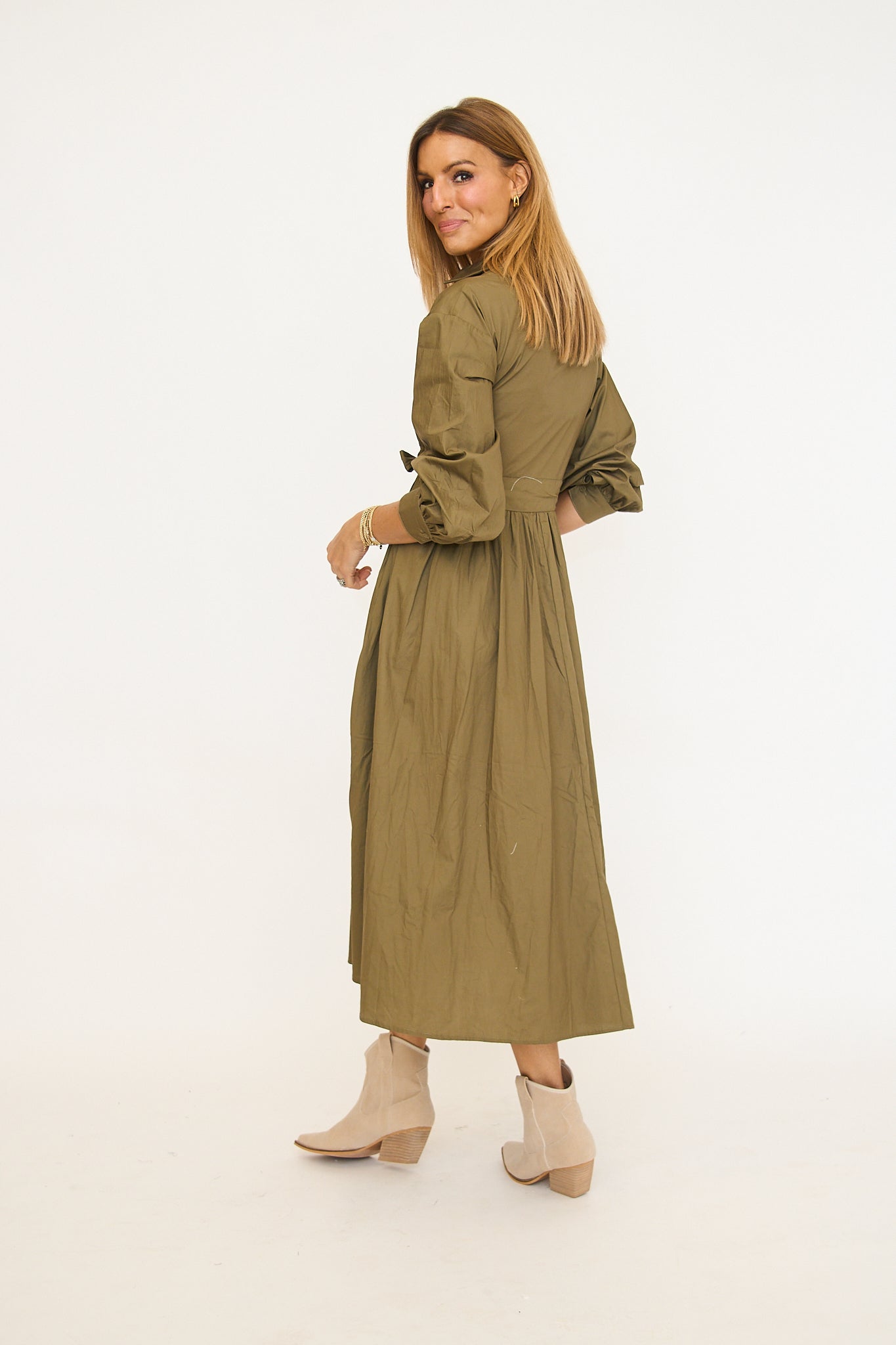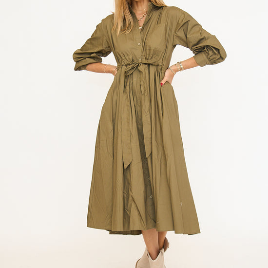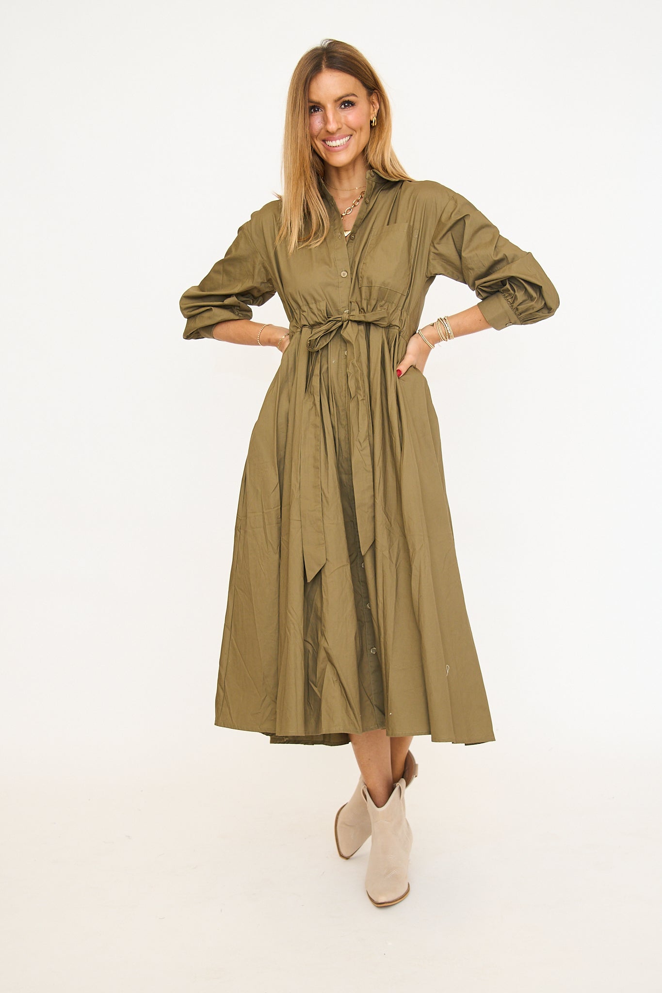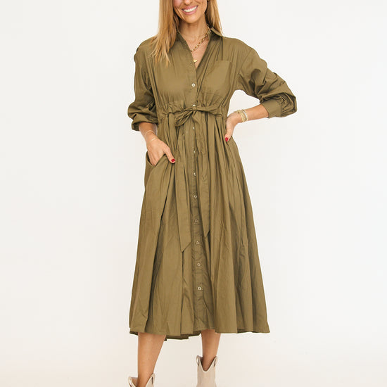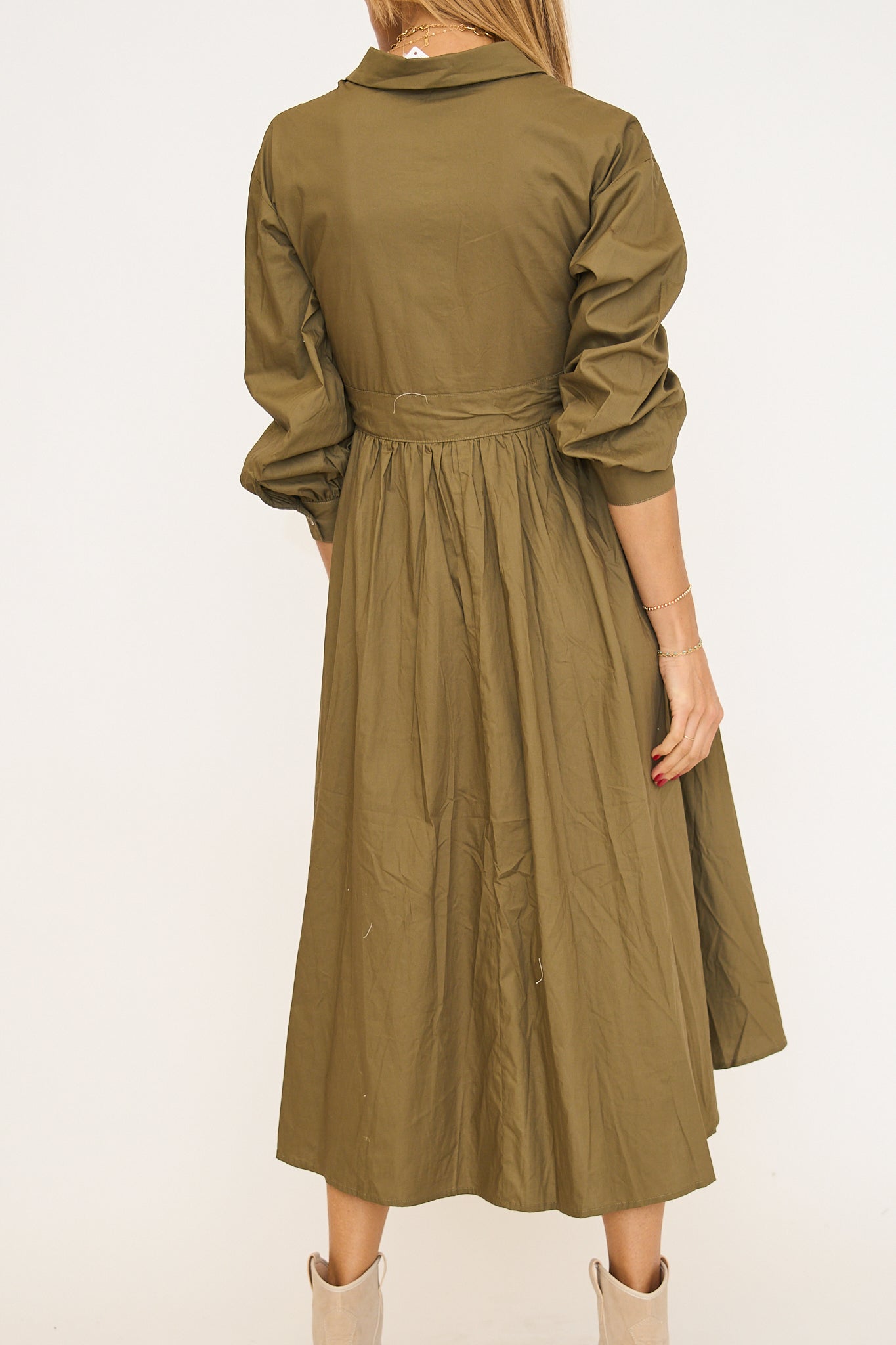 Long sleeves button down midi dress with side pockets, waist tie, front pleat accent.