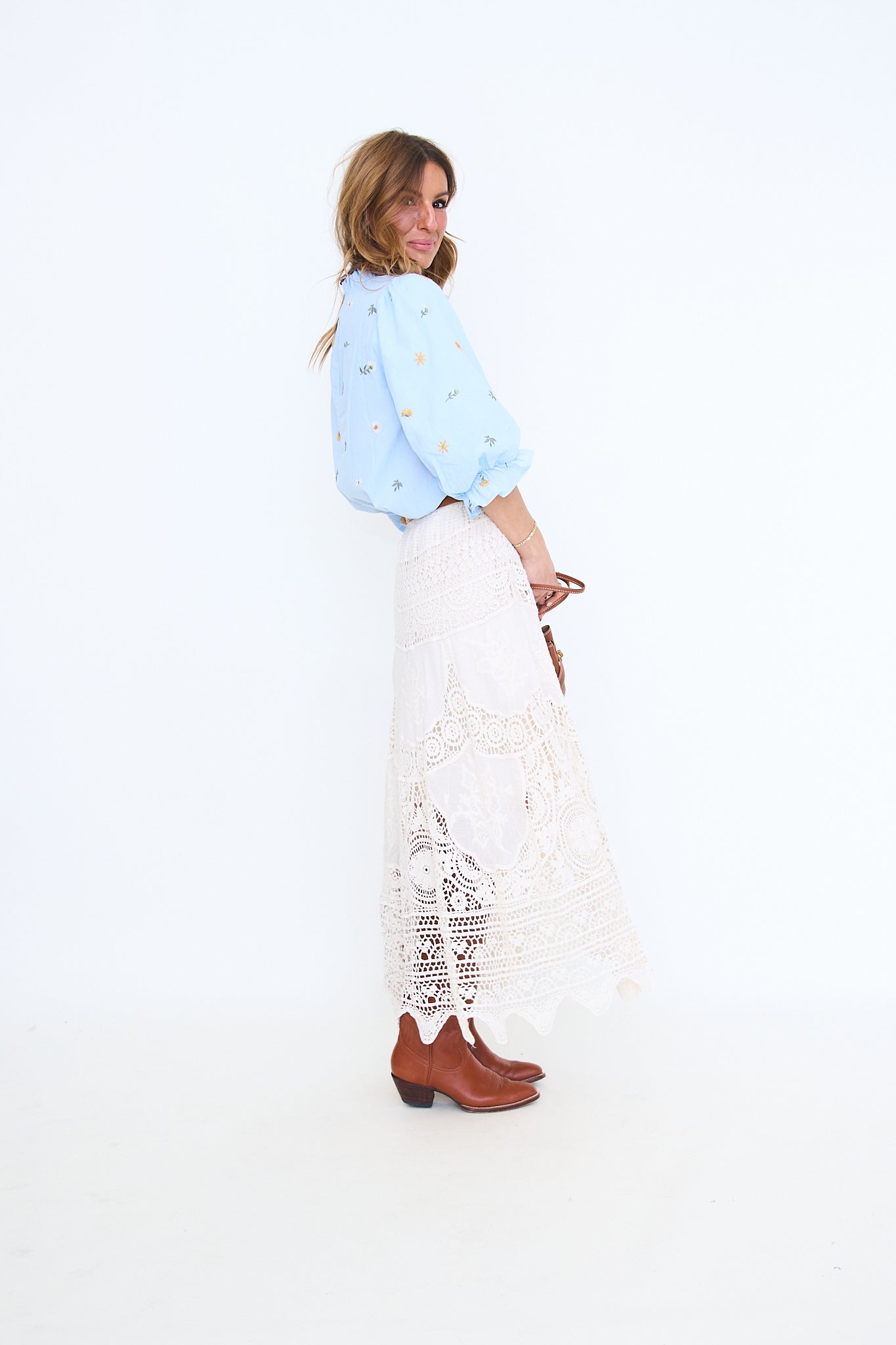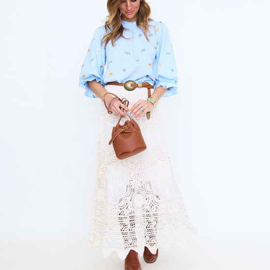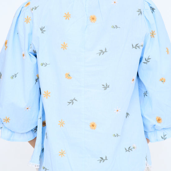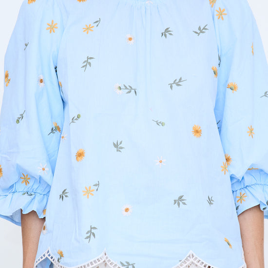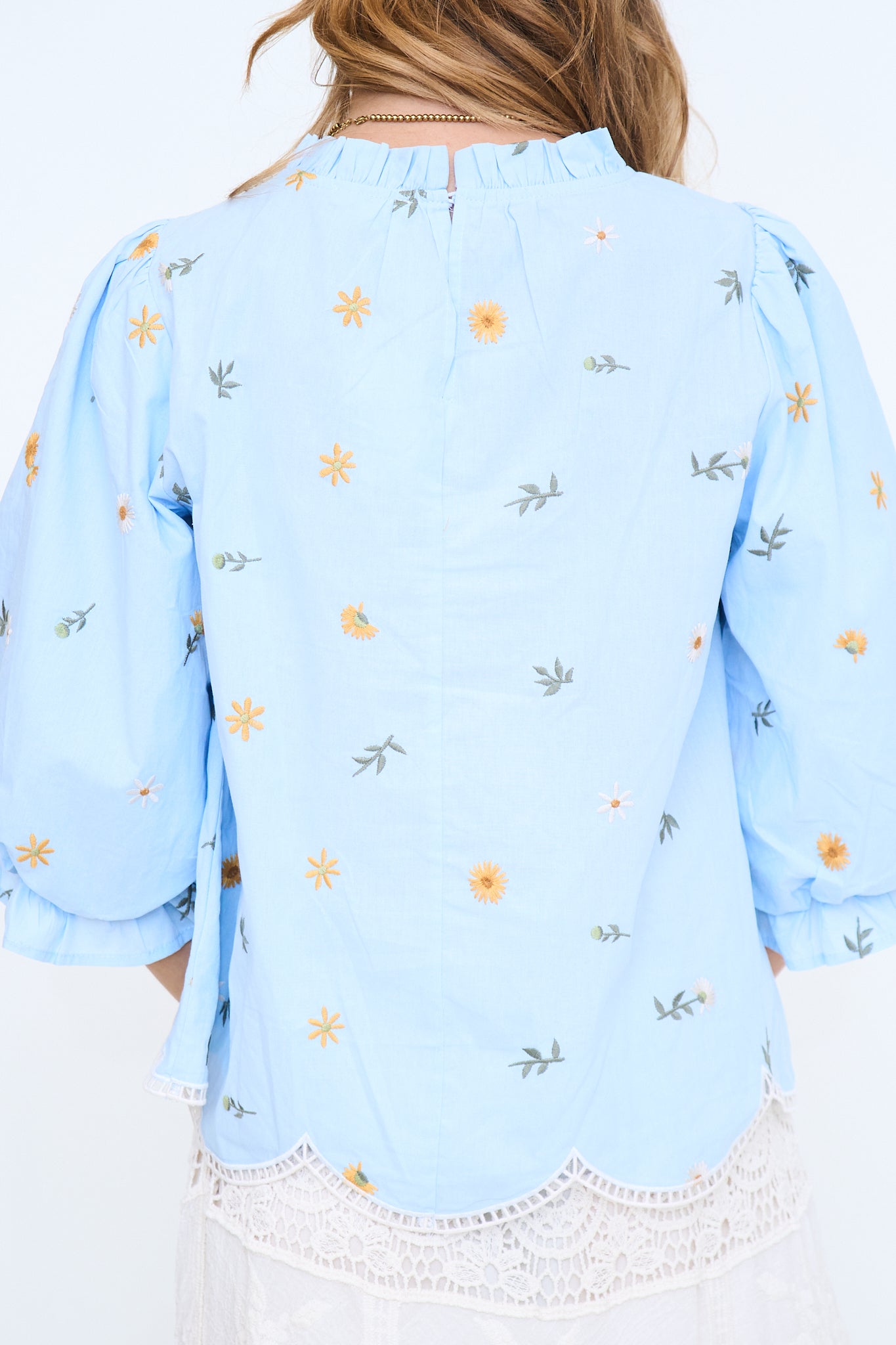 3/4 puff sleeve floral embroidered top with scallop hem, ruffled neckline, ladder lace trimmed hem, button closure back.