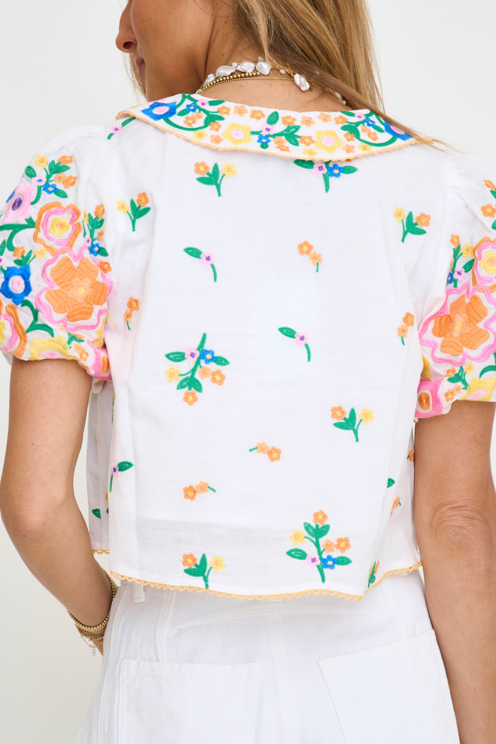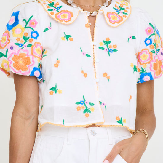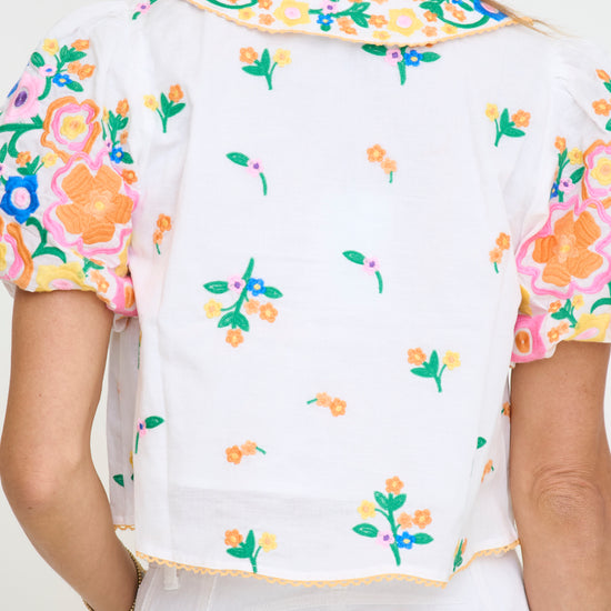 Peter pan collared top with colorful embroidery all over