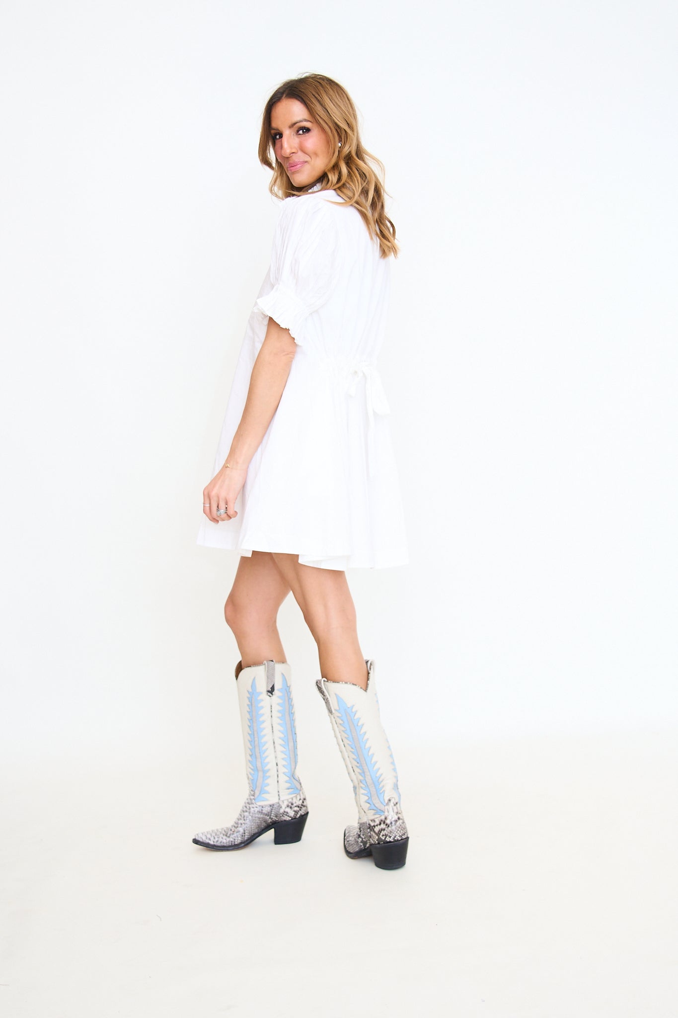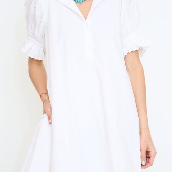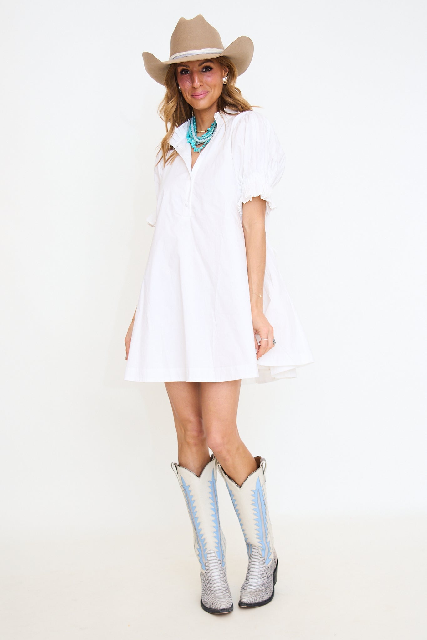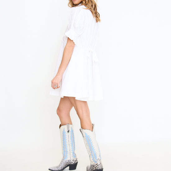 White cotton poplin shirt dress combines a charming ruffle neckline with a flattering tie back design. Swingy style with side pockets.