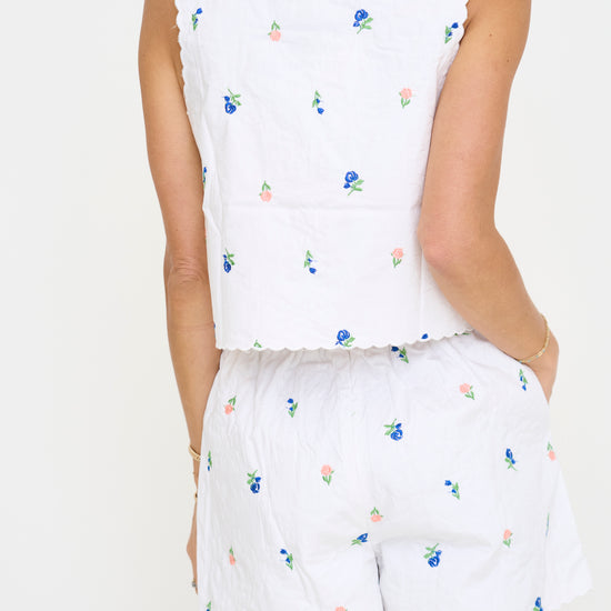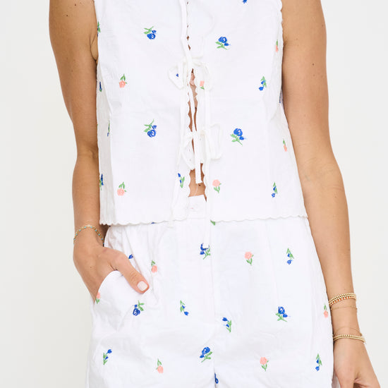 FLORAL EMBROIDERY QUILTED VEST AND SHORTS SET