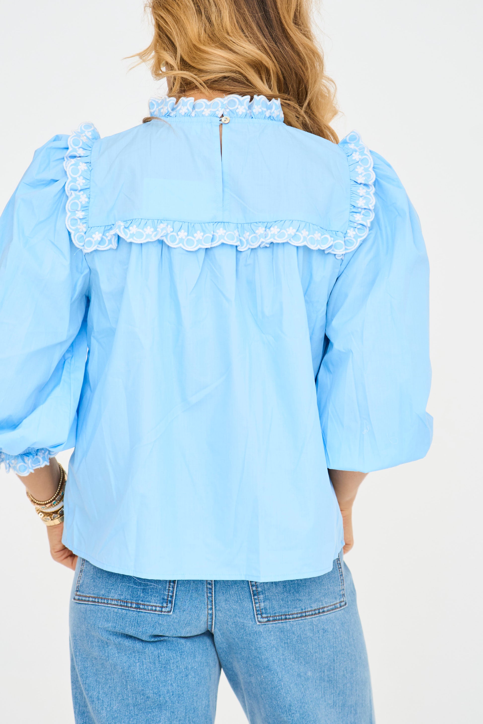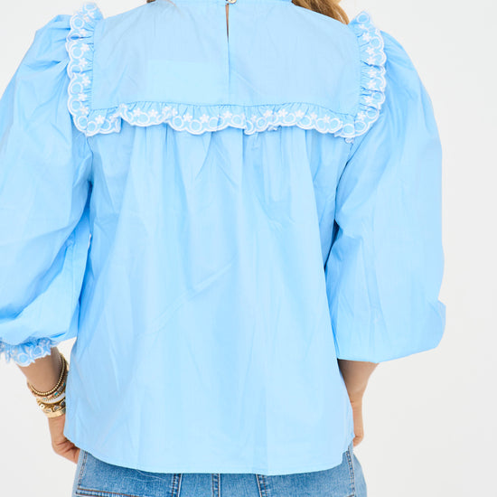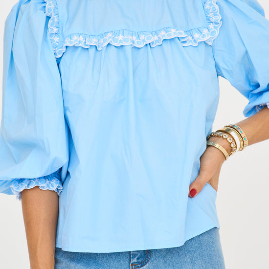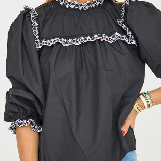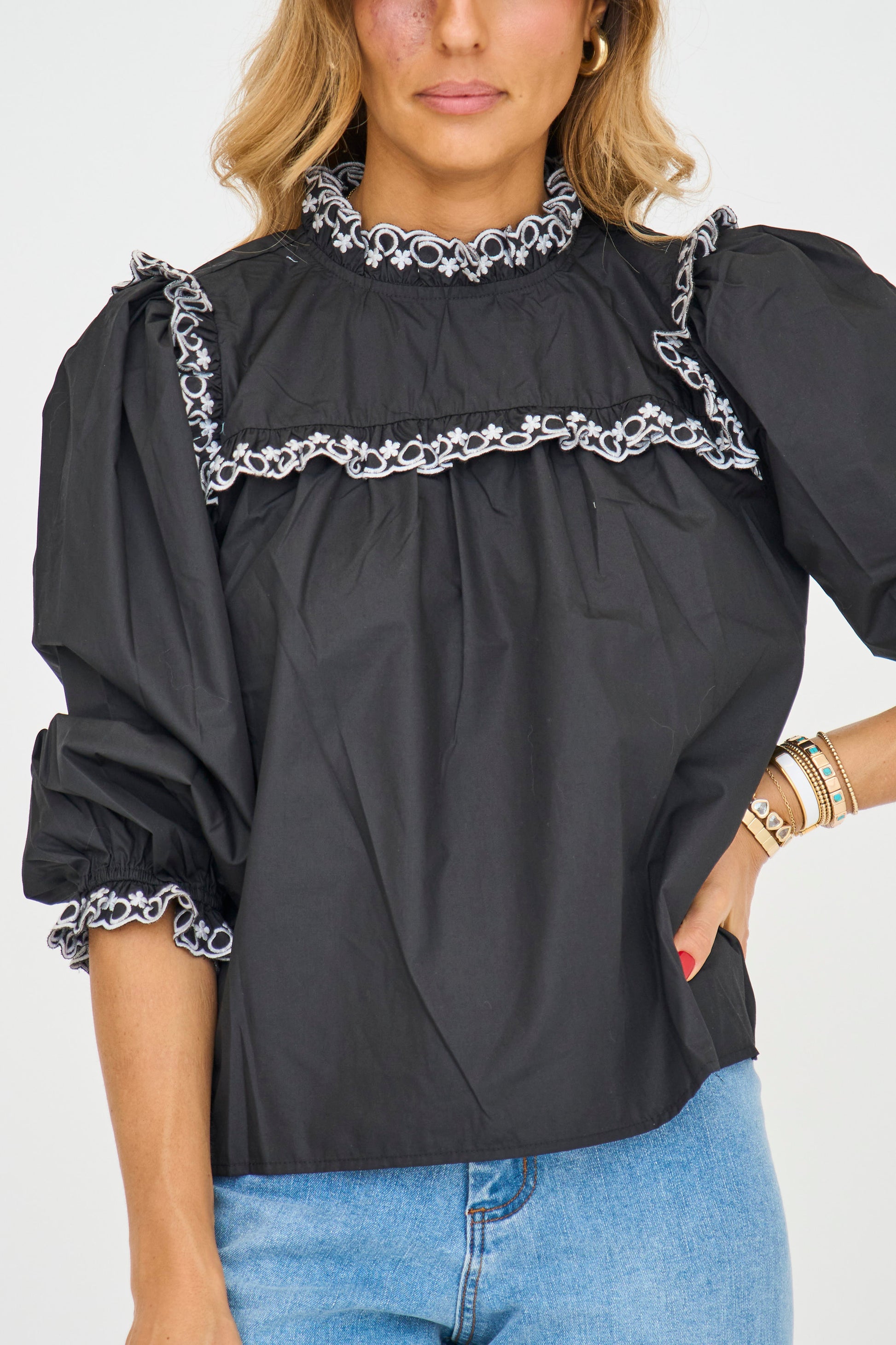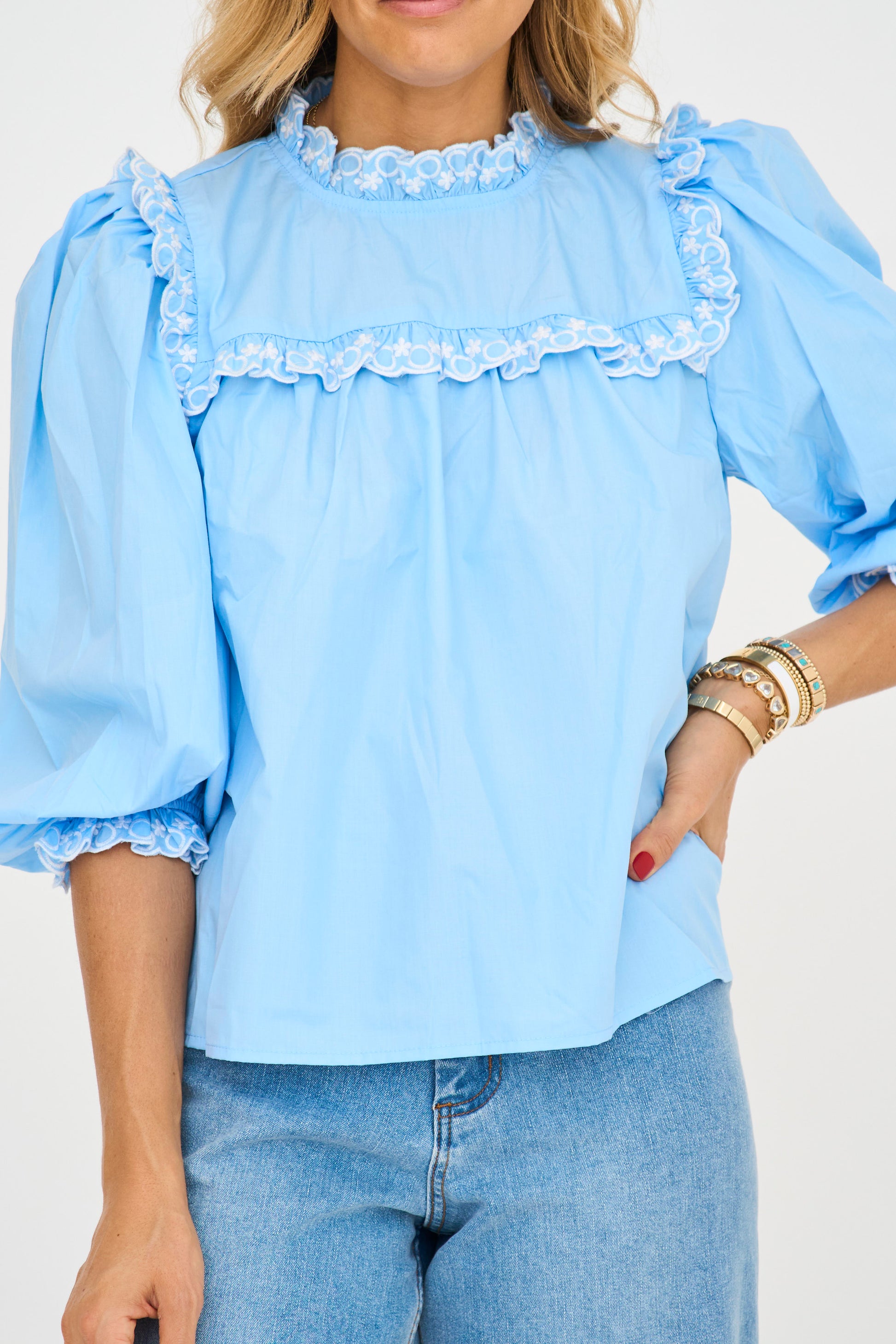 Solid top with frilled big collared neckline, back key hole, three quarter poet sleeves, and embroidered at the sleeve ends and collared neckline. - Non-sheer, lightweight. -