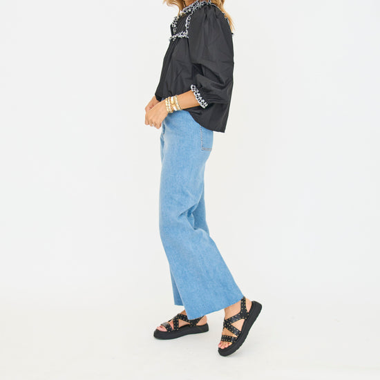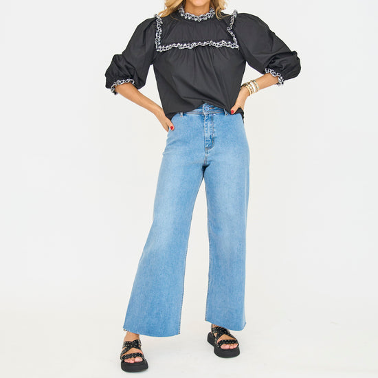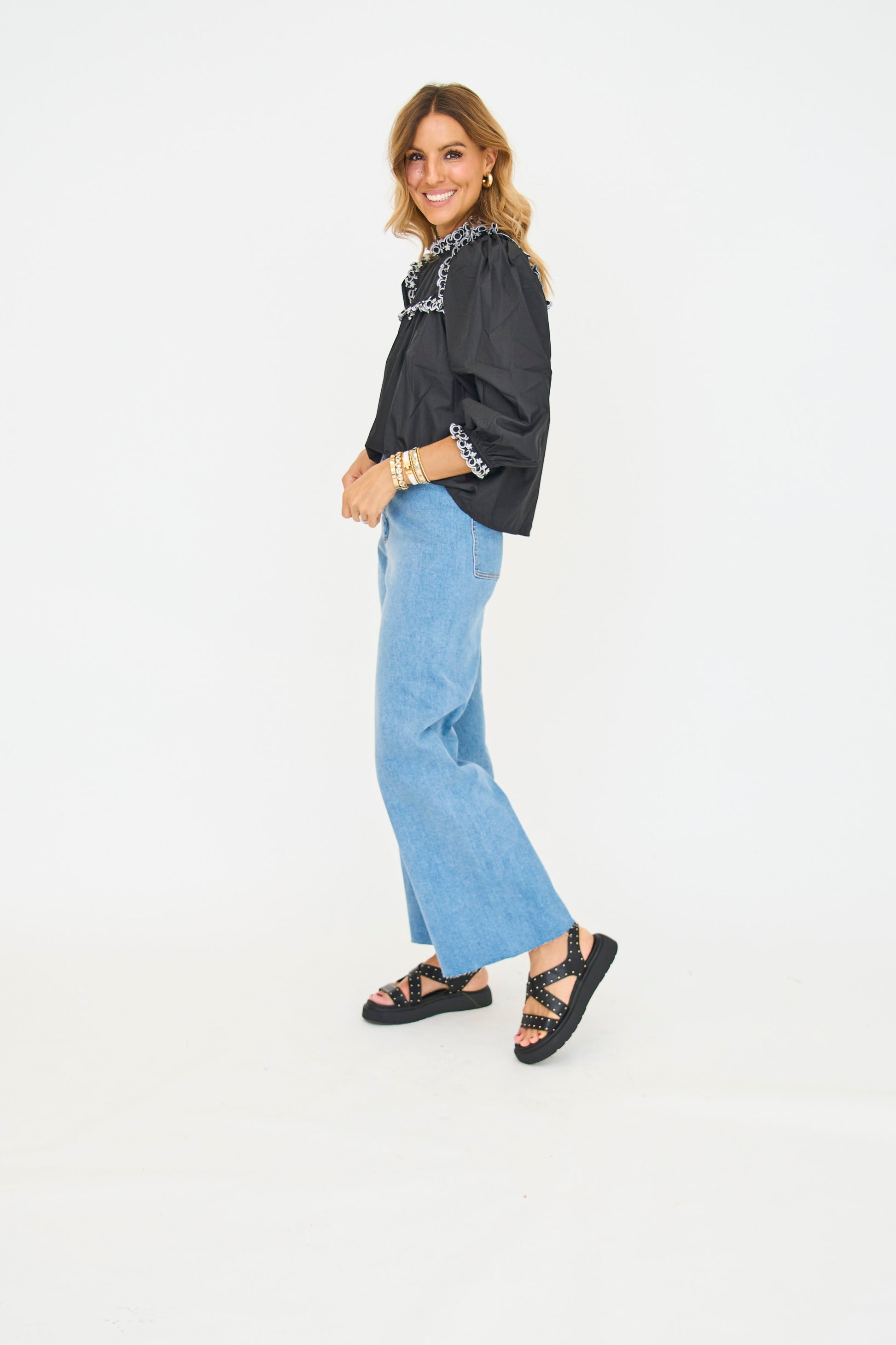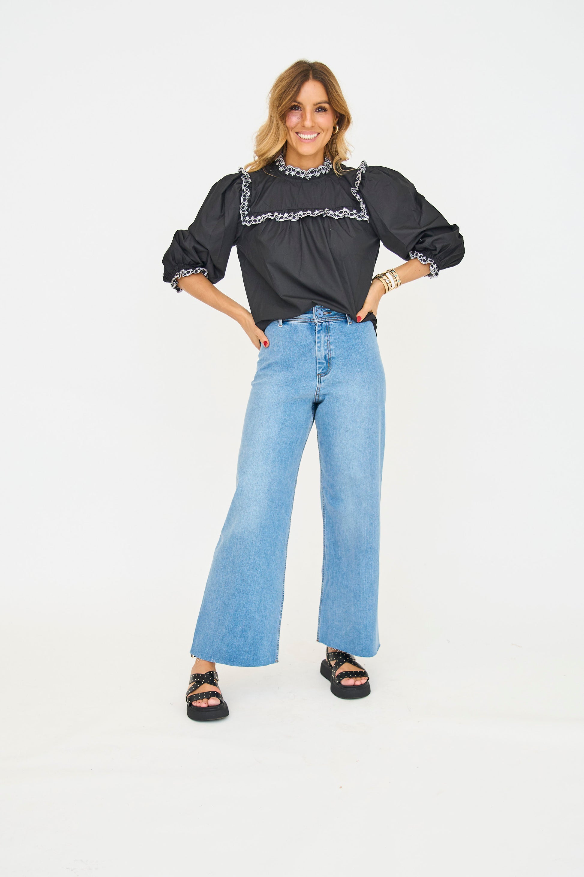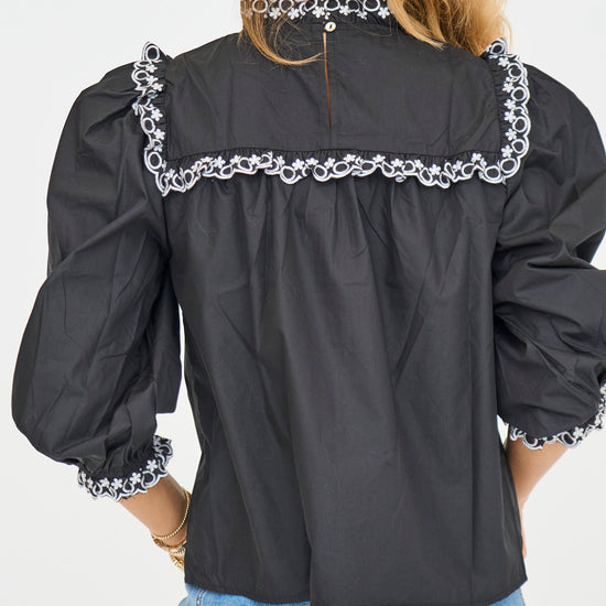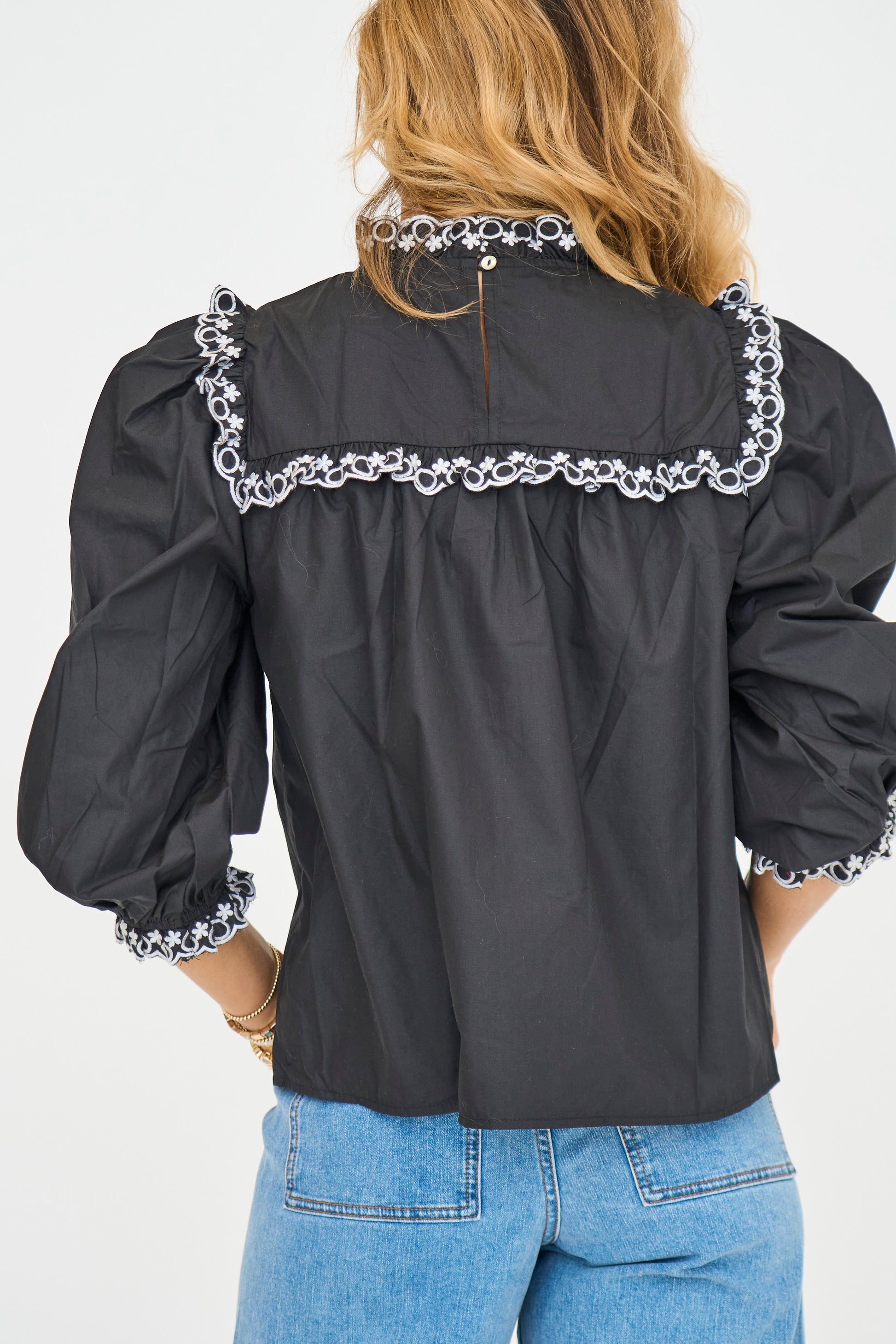 Solid top with frilled big collared neckline, back key hole, three quarter poet sleeves, and embroidered at the sleeve ends and collared neckline. - Non-sheer, lightweight. -