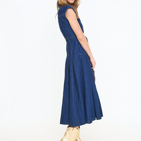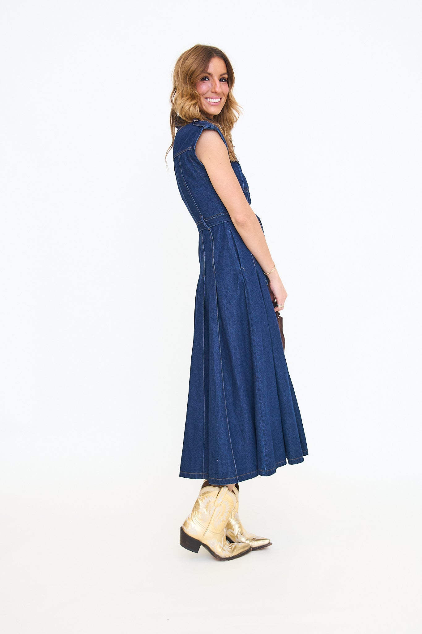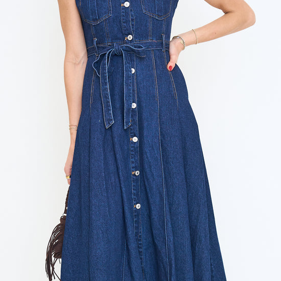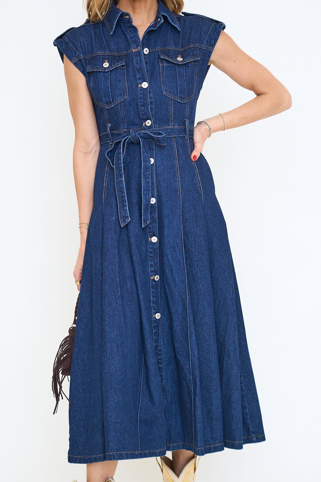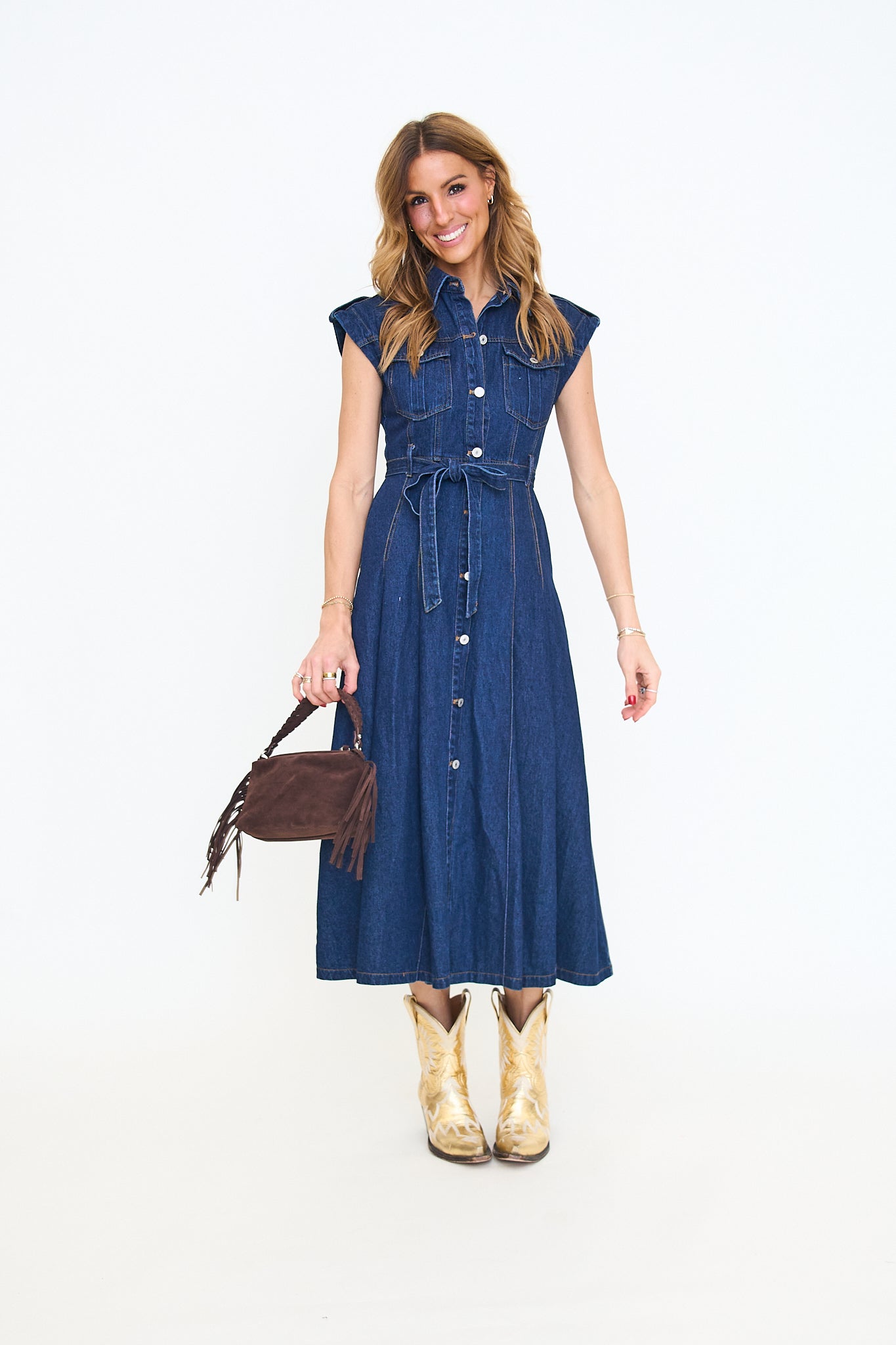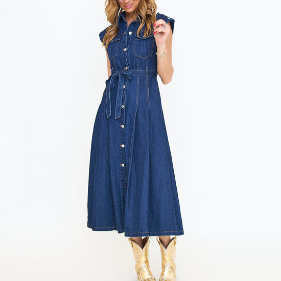 Belted denim short sleeve button down midi dress