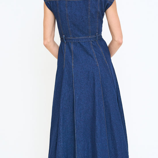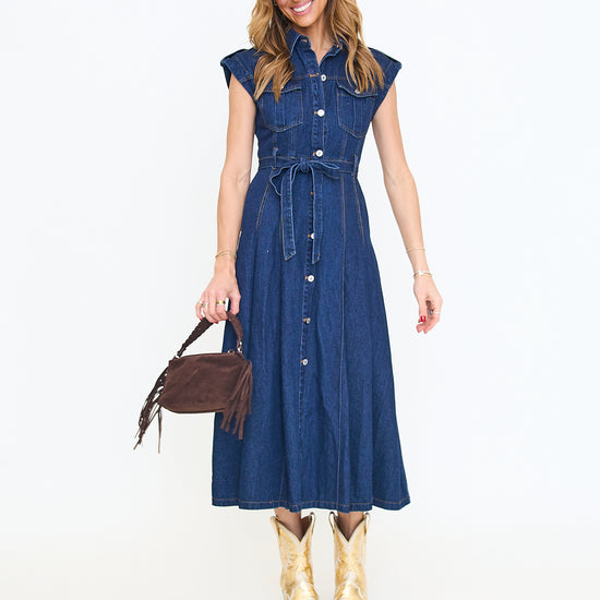 Belted Denim Short Sleeve Button Down Midi Dress