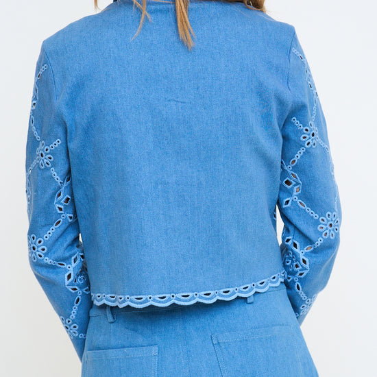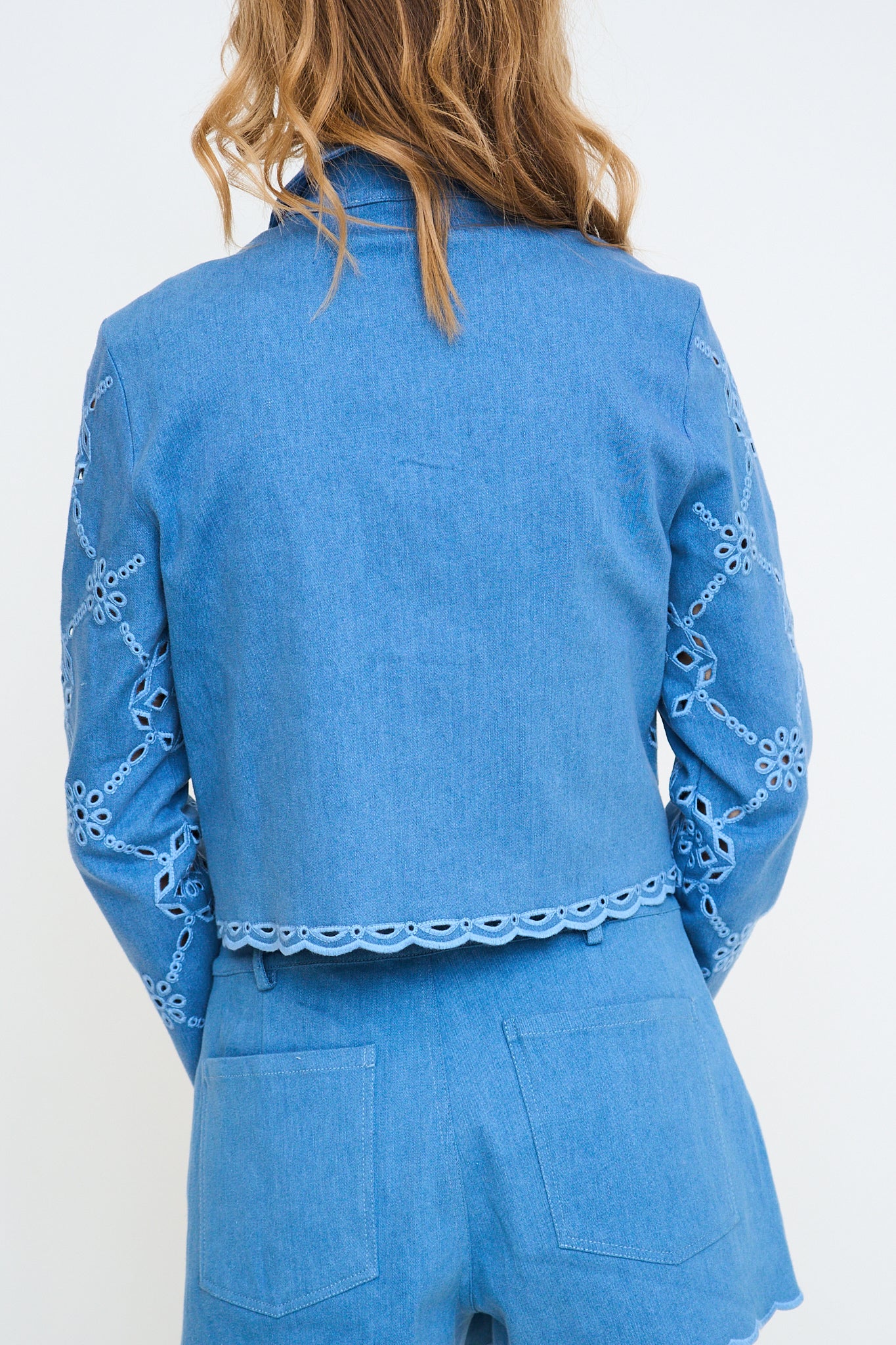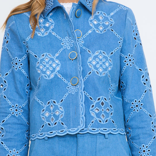 Embroidered Scalloped Trim Button Up Jacket offers a soft, breathable feel with a touch of stretch for all day comfort. Designed with a relaxed fit and all-over motif print, it's an easy staple for everyday wear.