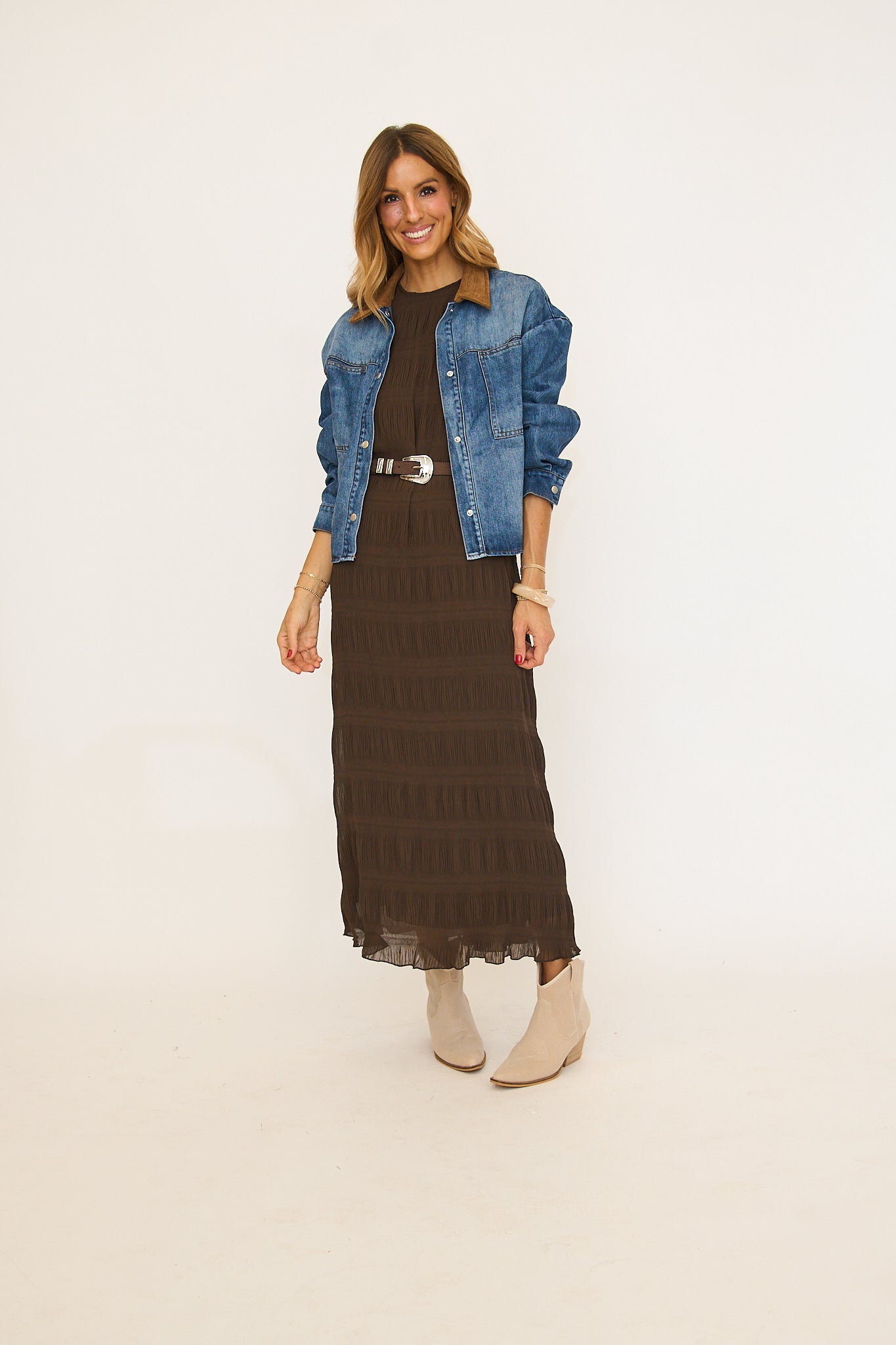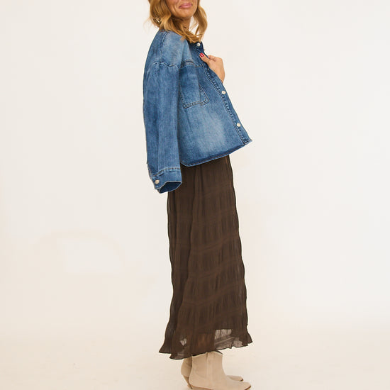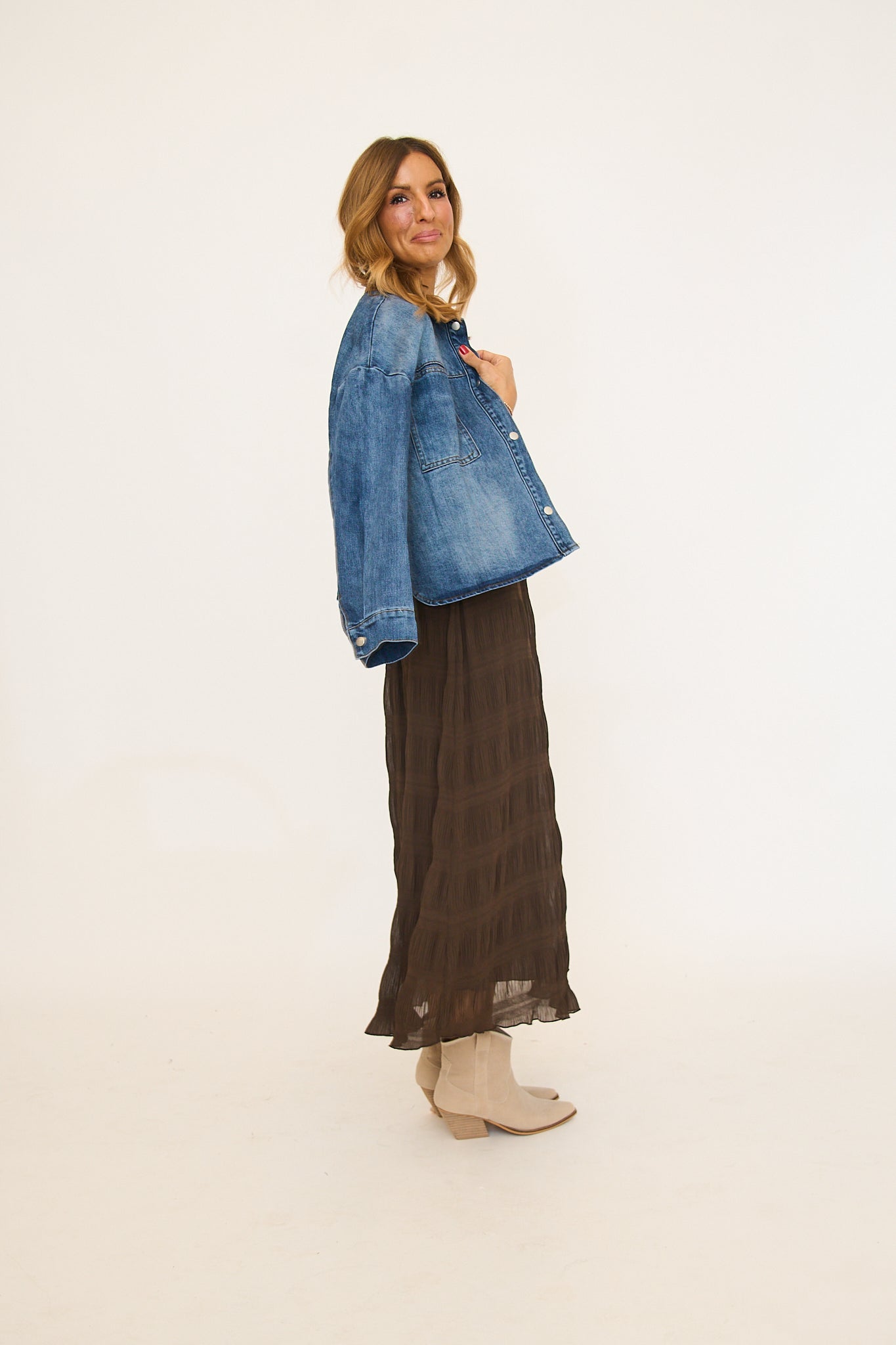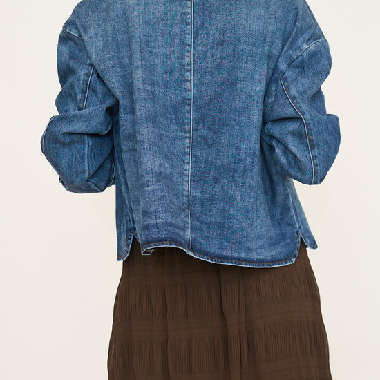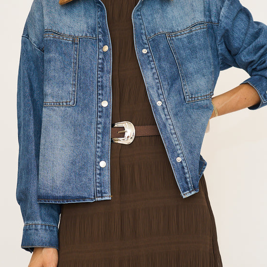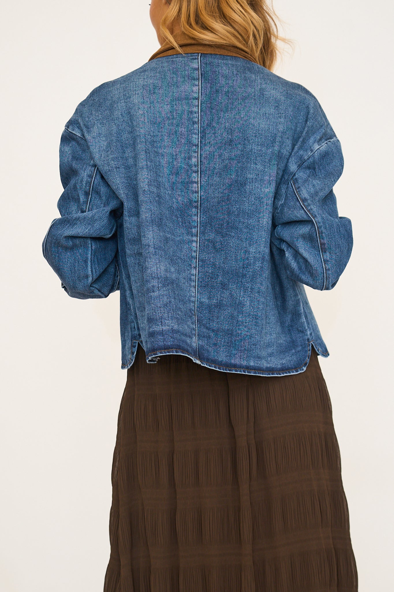 Our Leila Denim Jacket features a button down and a contrasting collar detail in a cognac suede.