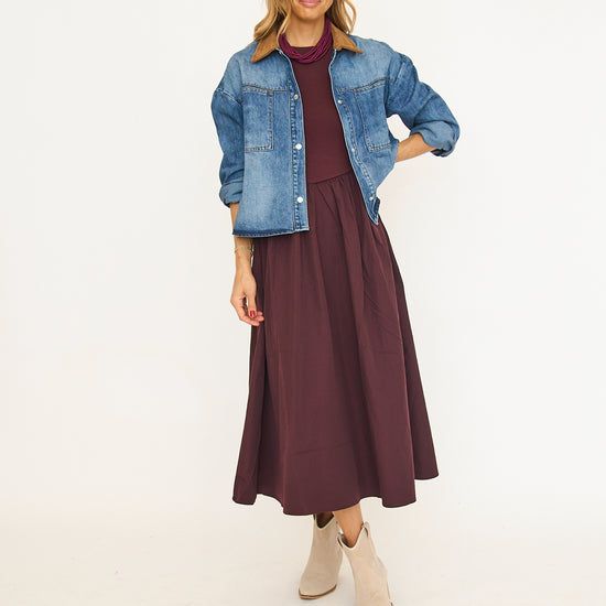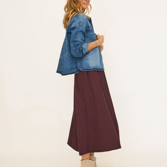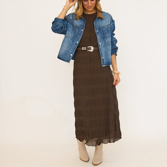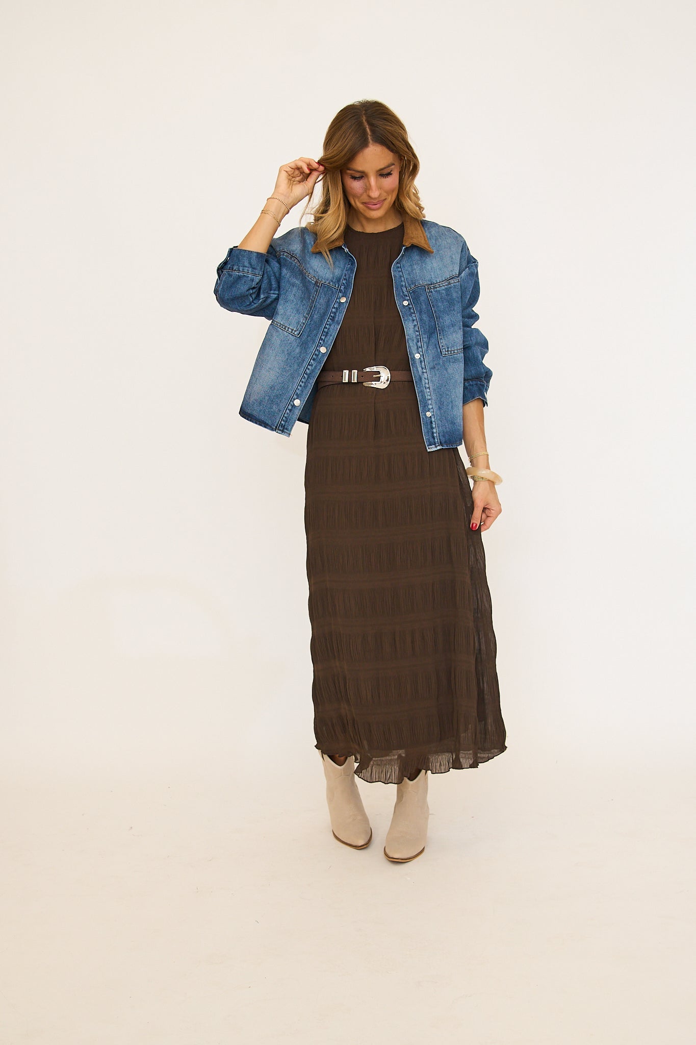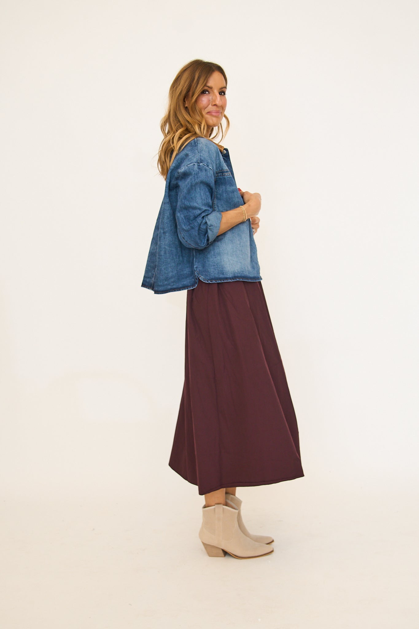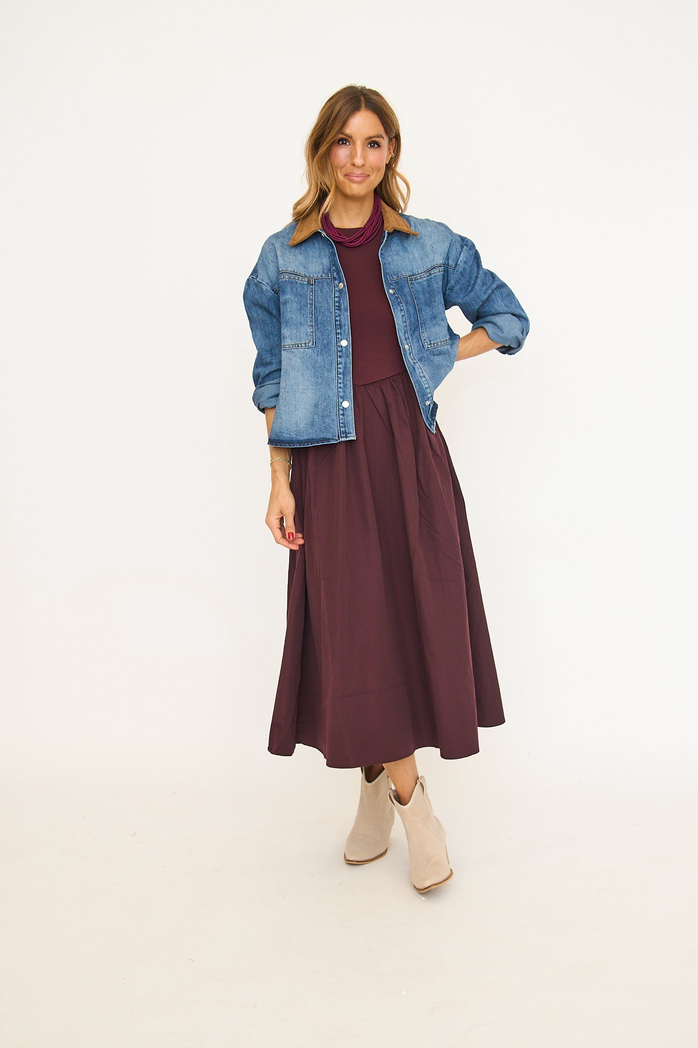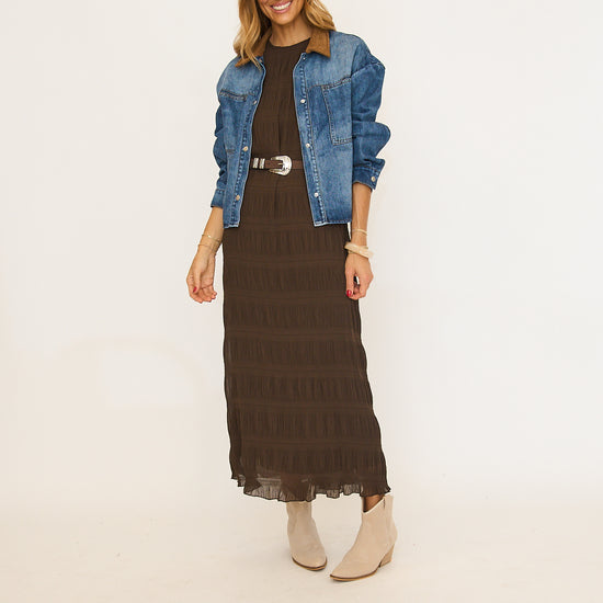 Our Leila Denim Jacket features a button down and a contrasting collar detail in a cognac suede.