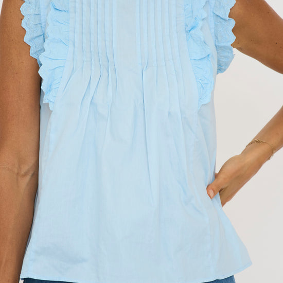 Sleeveless cotton top featuring ruffled lace detail, pintucks, and a keyhole opening at the back.