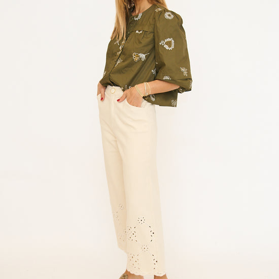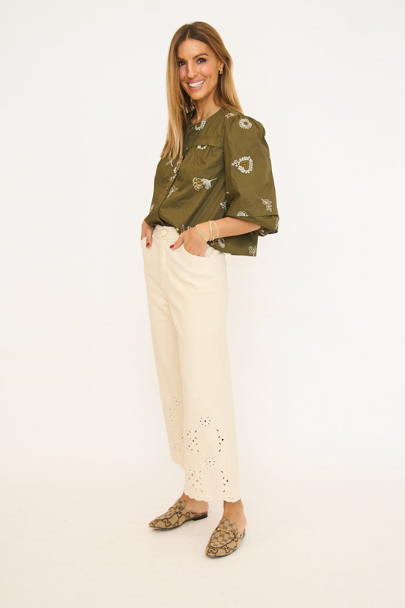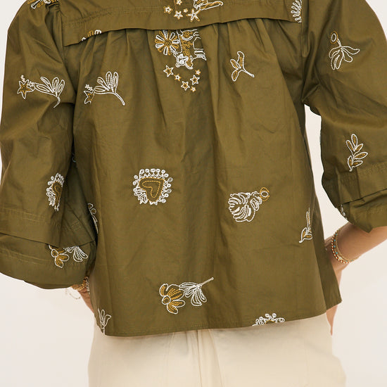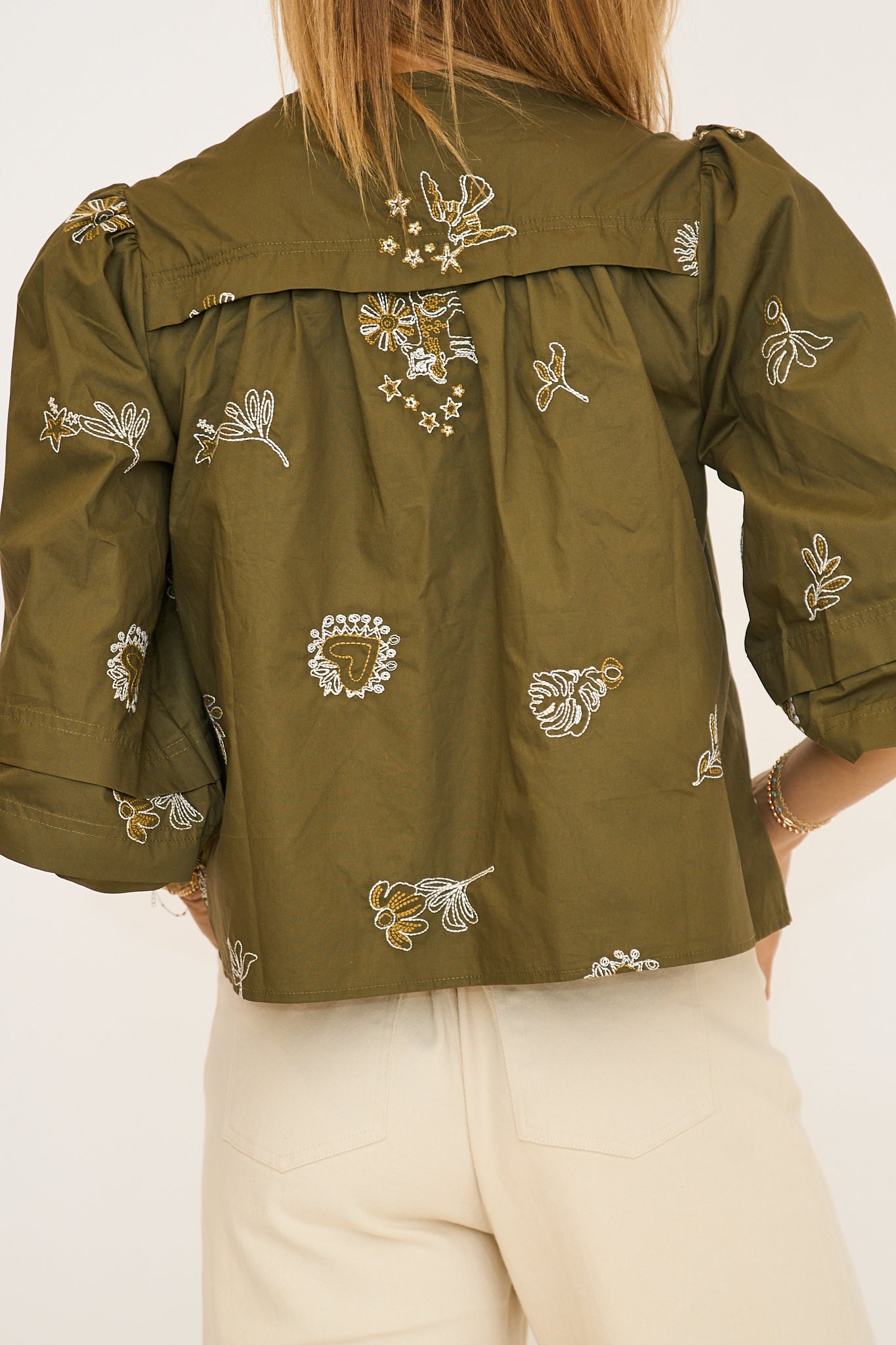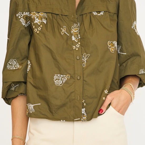 Discover bohemian elegance in this olive green button-down featuring delicate white embroidered florals and charming bubble sleeves. The relaxed fit and gathered yoke detail create feminine appeal while the earthy tone adds versatility to your wardrobe. Perfect with high-waisted jeans for casual weekends or tucked into midi skirts for elevated boho styling.