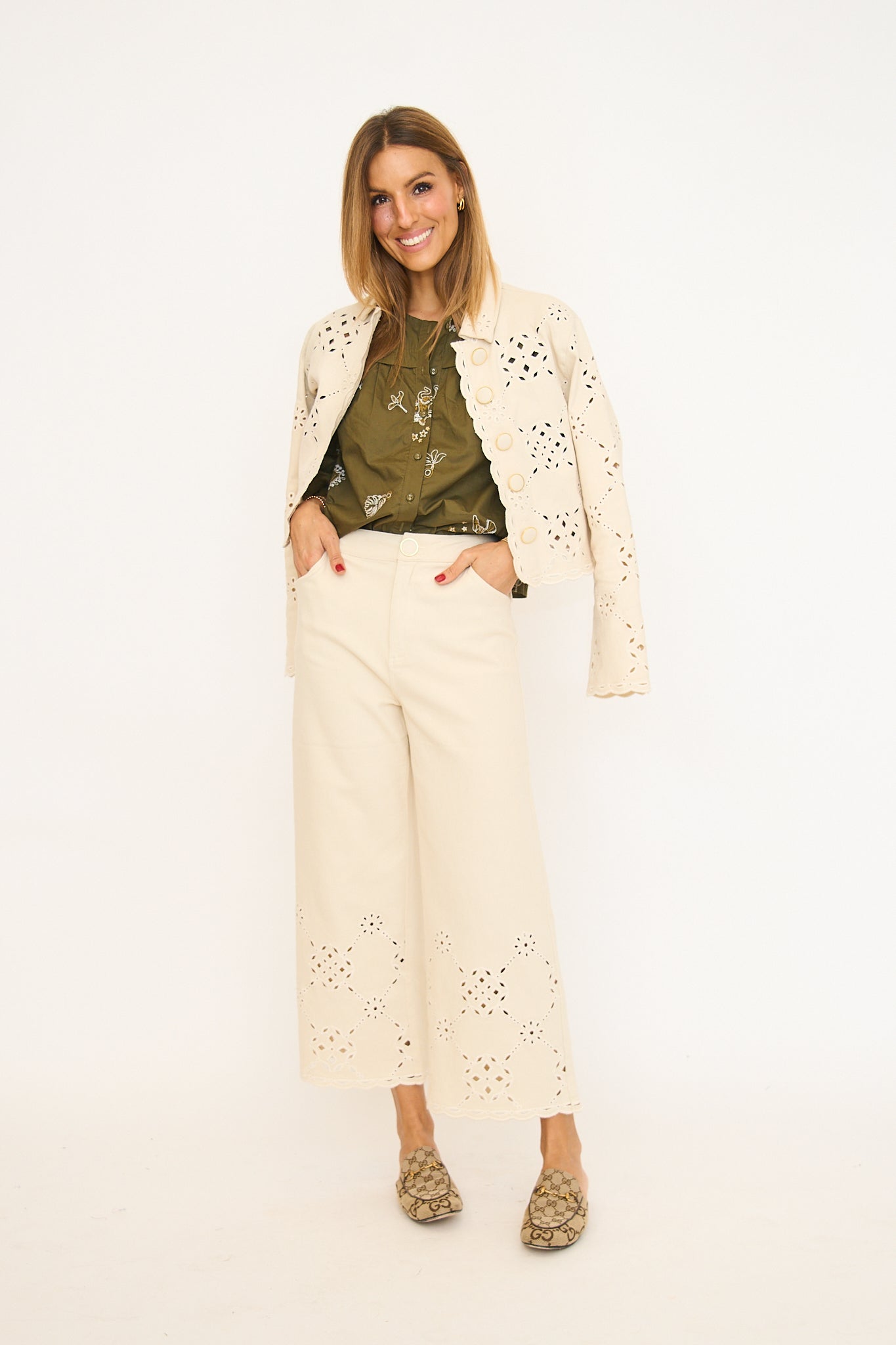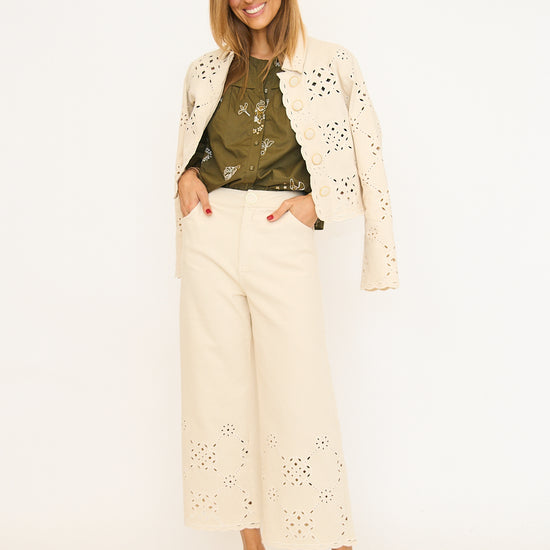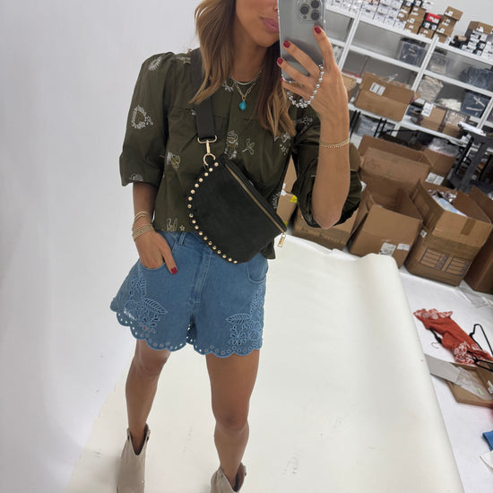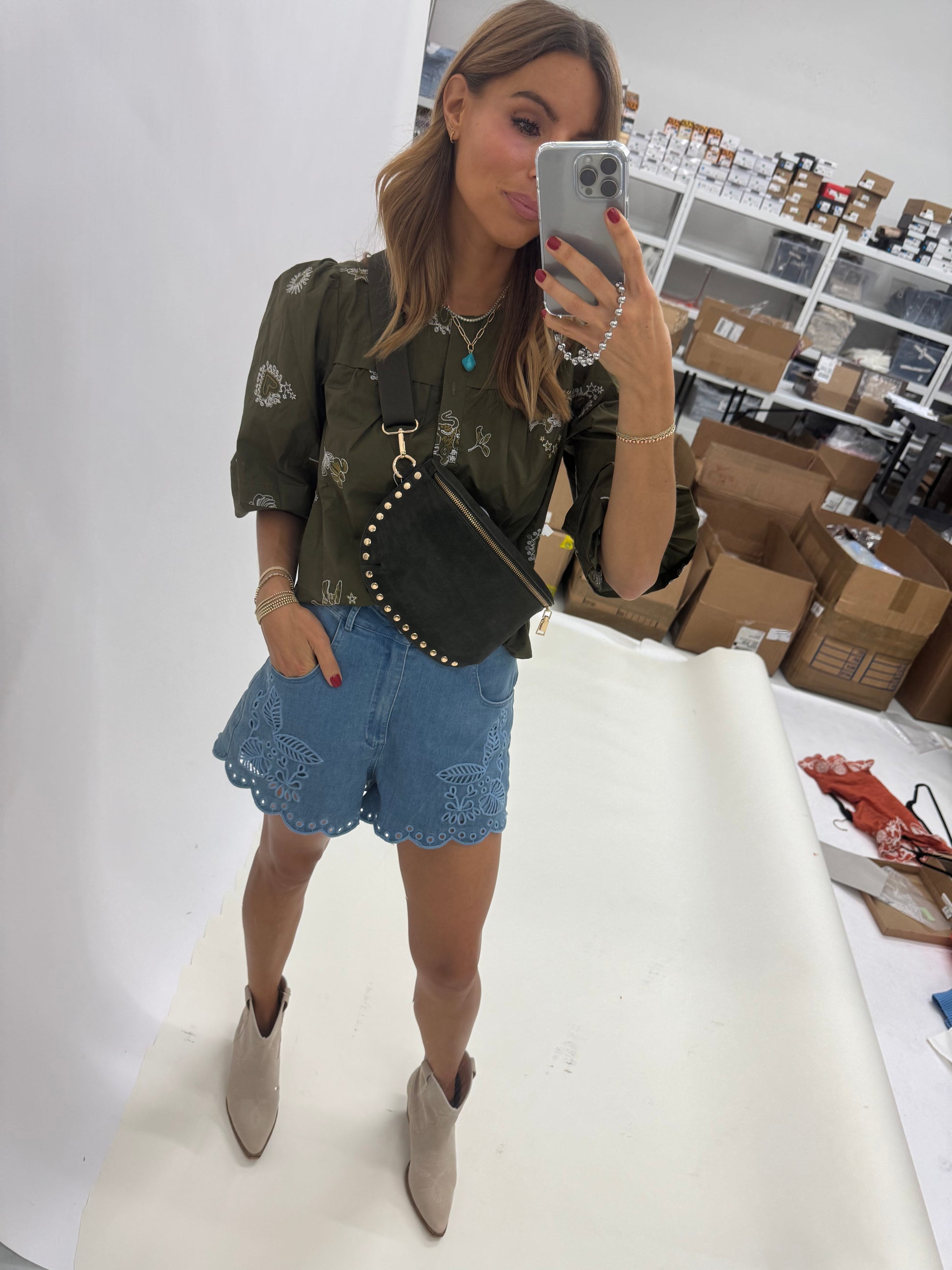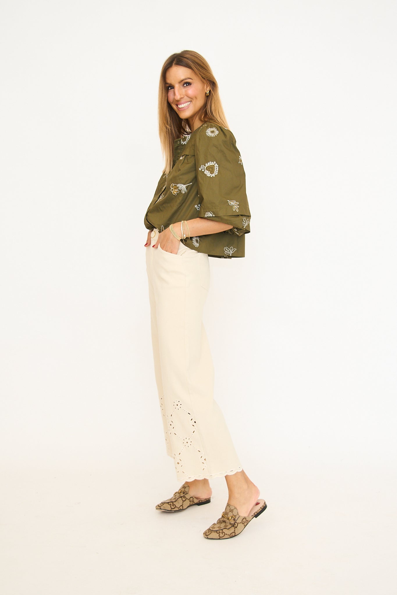 Discover bohemian elegance in this olive green button-down featuring delicate white embroidered florals and charming bubble sleeves. The relaxed fit and gathered yoke detail create feminine appeal while the earthy tone adds versatility to your wardrobe. Perfect with high-waisted jeans for casual weekends or tucked into midi skirts for elevated boho styling.