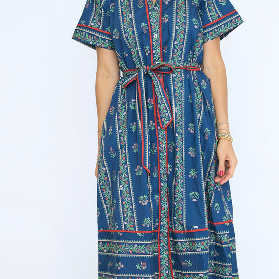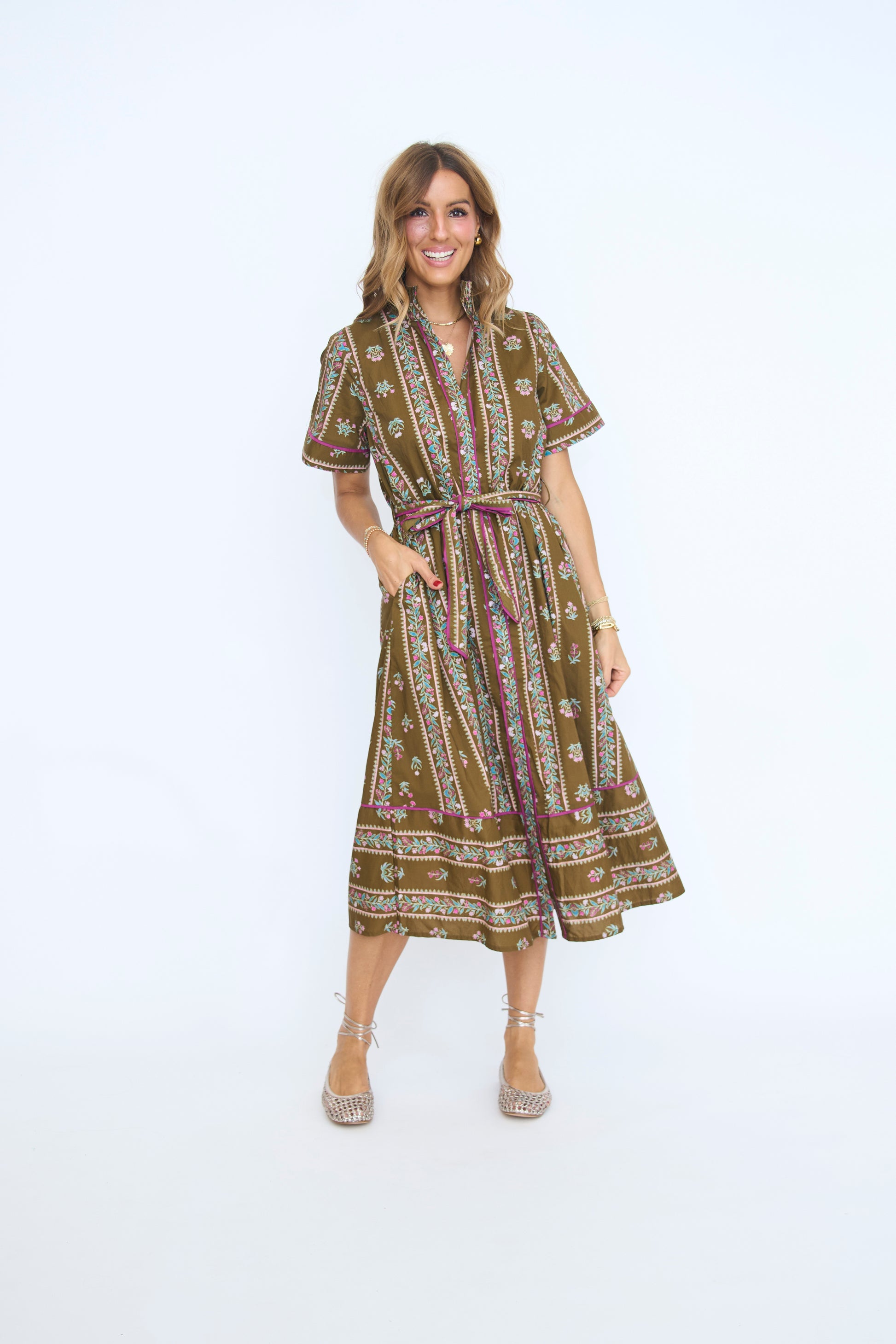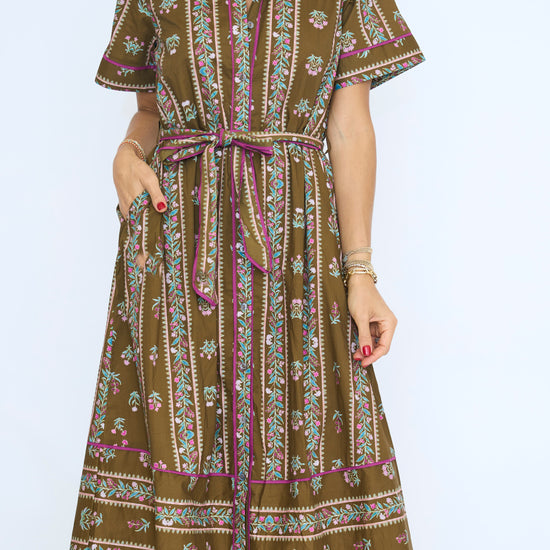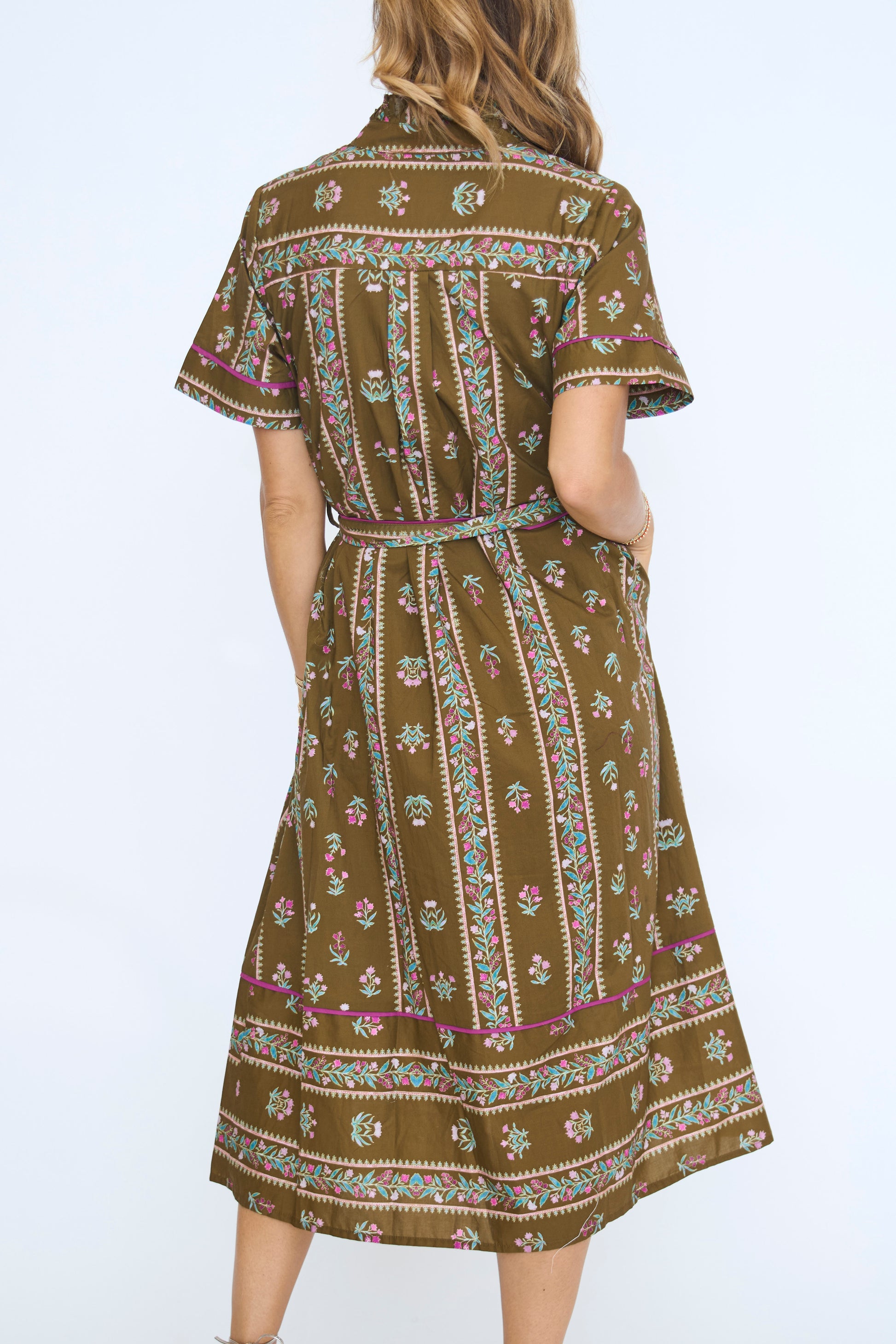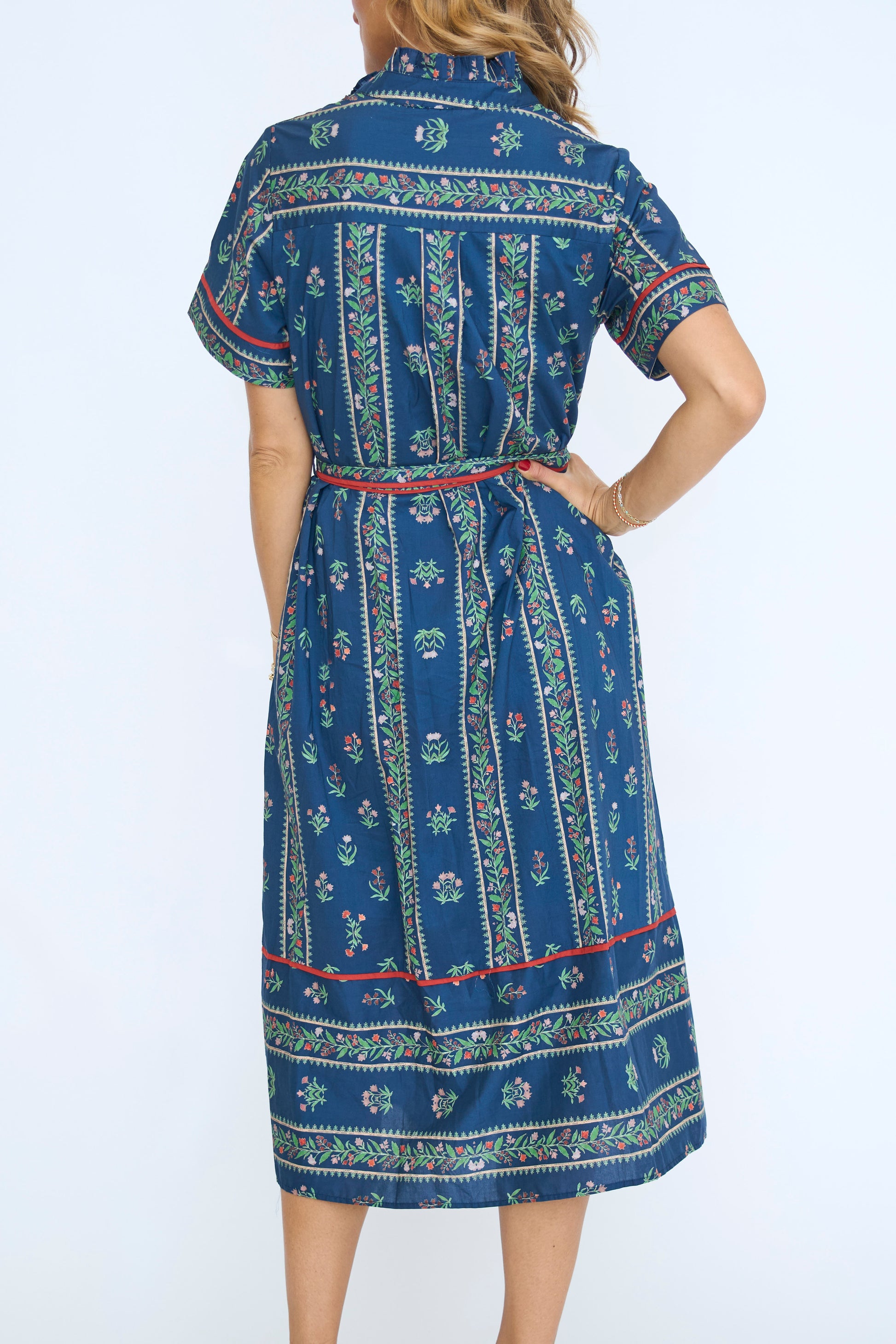 Linear floral pattern short short sleeve pleated ruffle neck band button closure shirt midi shirt featuring contrast accent inset detail. Removable belt. Side pockets. Lined. Woven. Non-sheer. Lightweight.