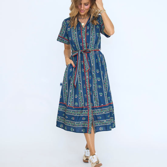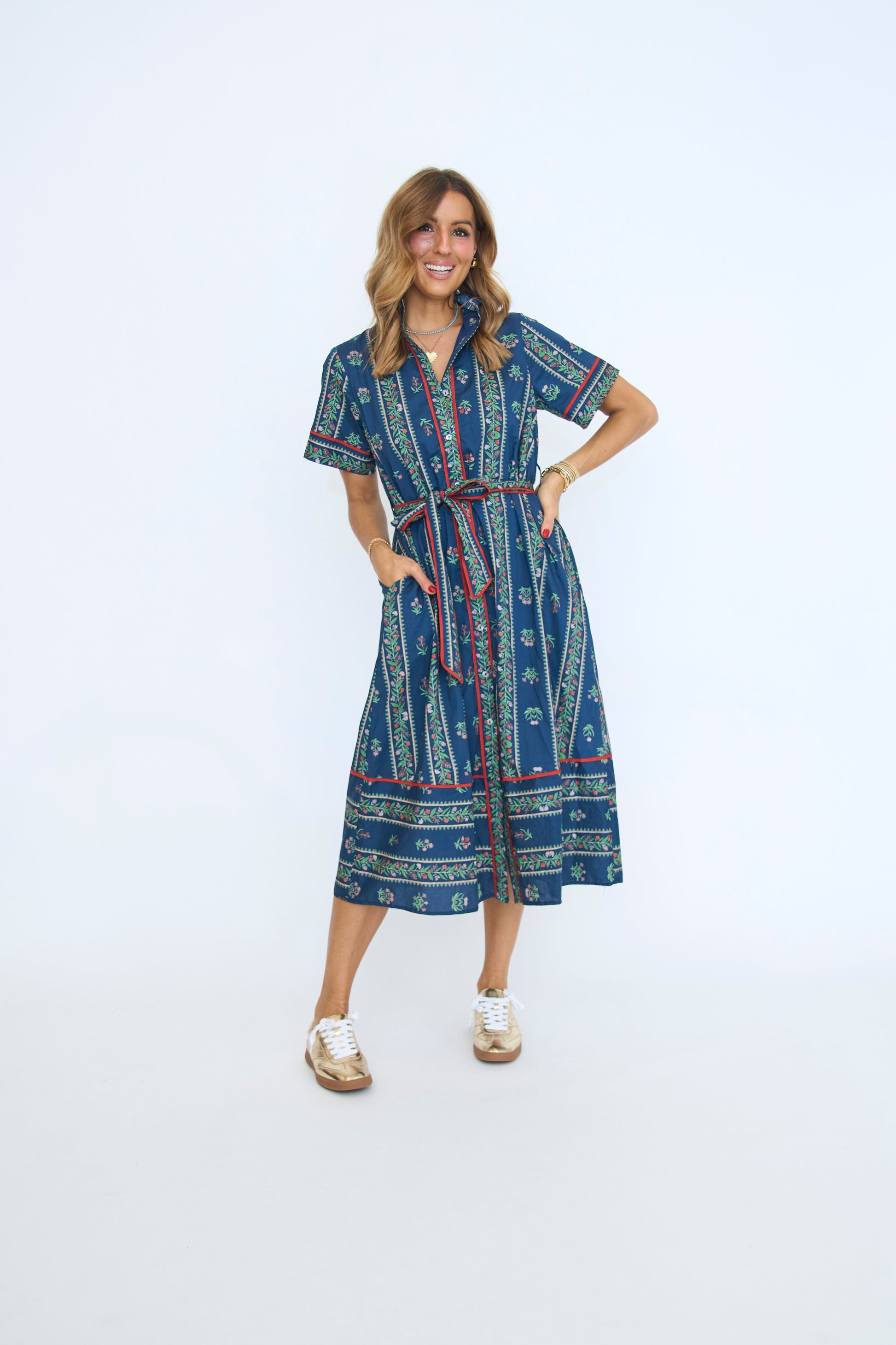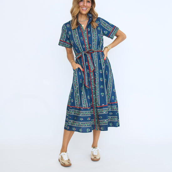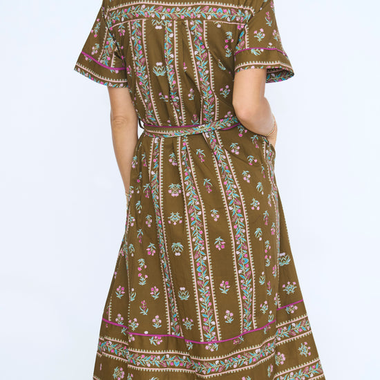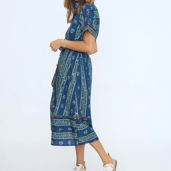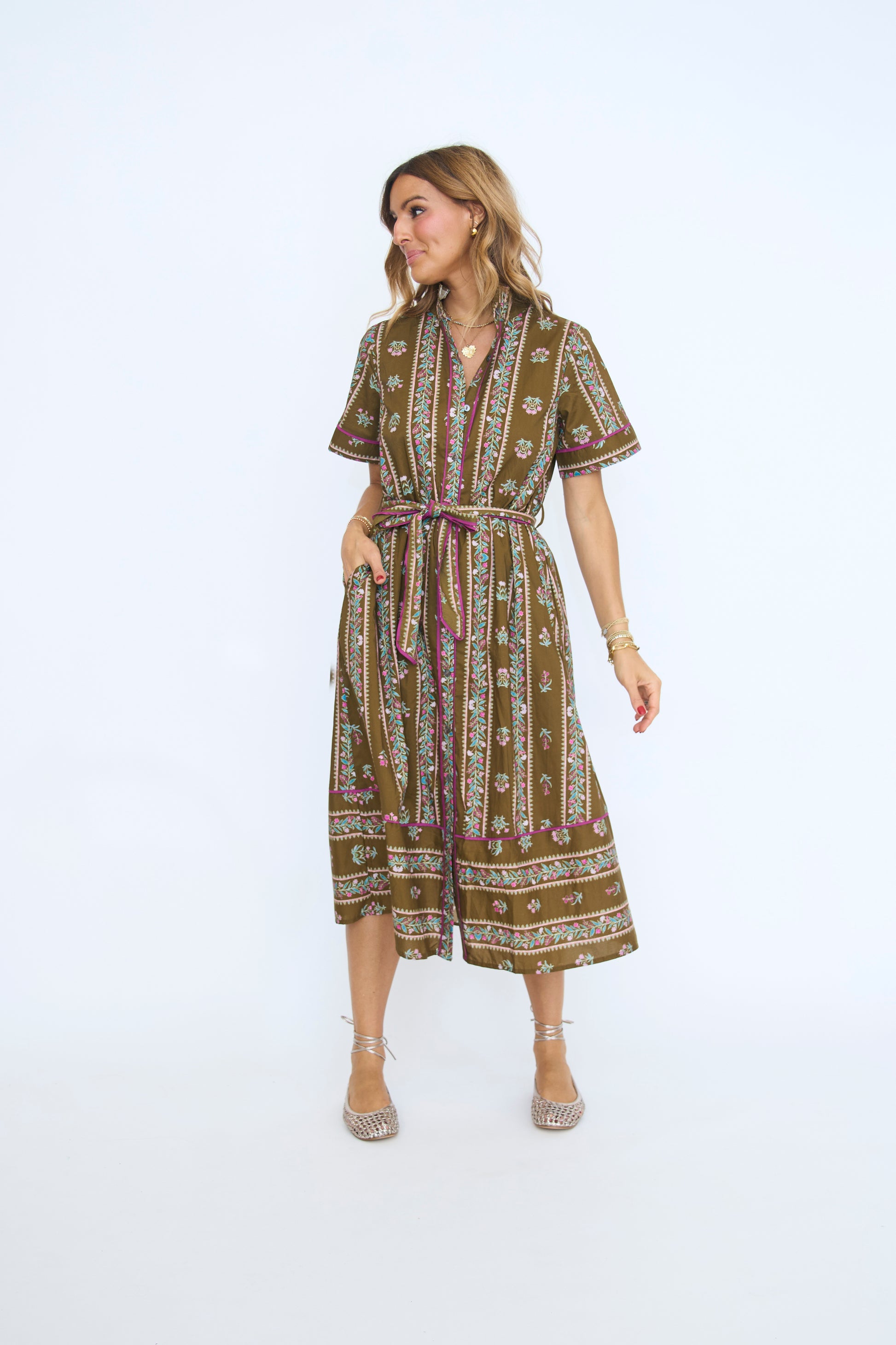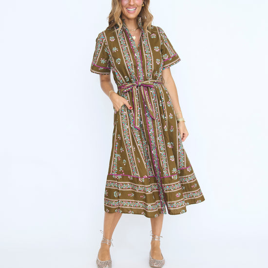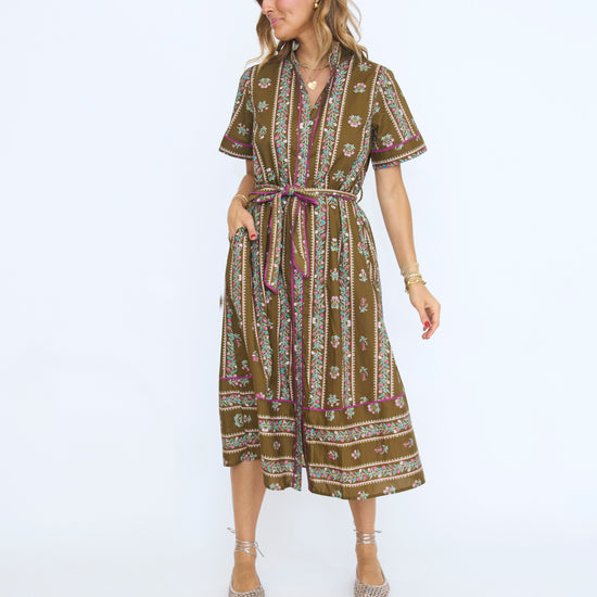 Linear floral pattern short short sleeve pleated ruffle neck band button closure shirt midi shirt featuring contrast accent inset detail. Removable belt. Side pockets. Lined. Woven. Non-sheer. Lightweight.