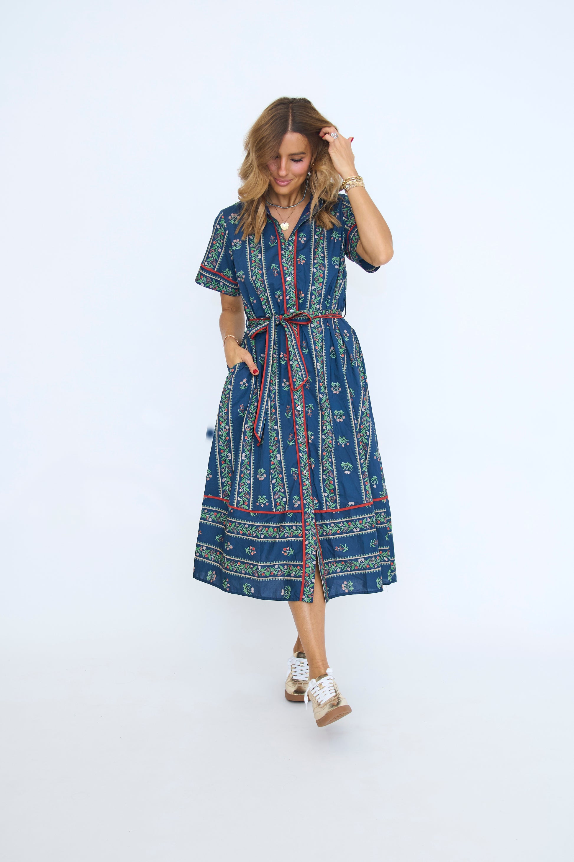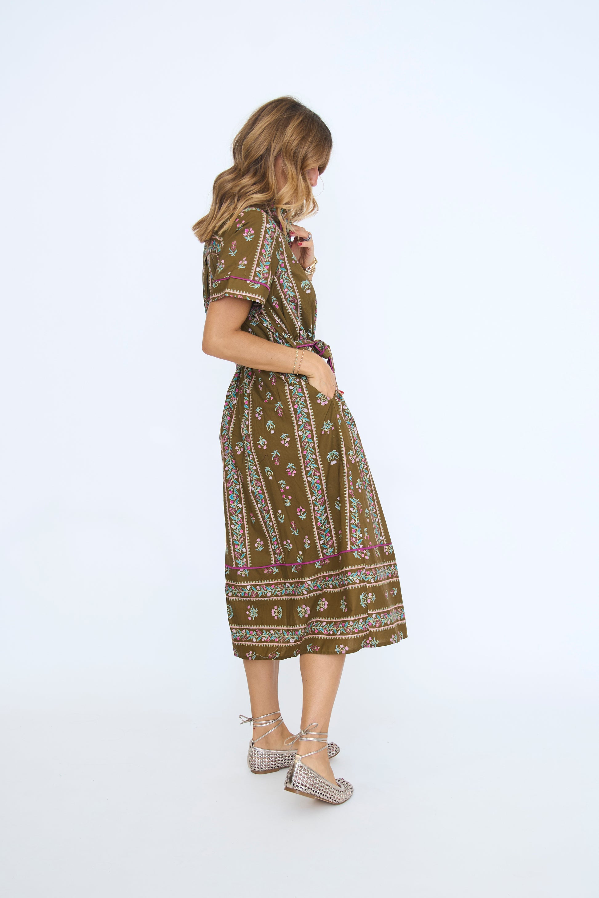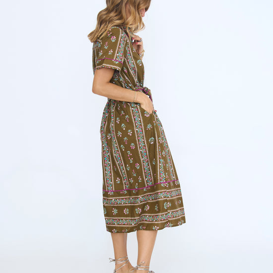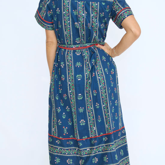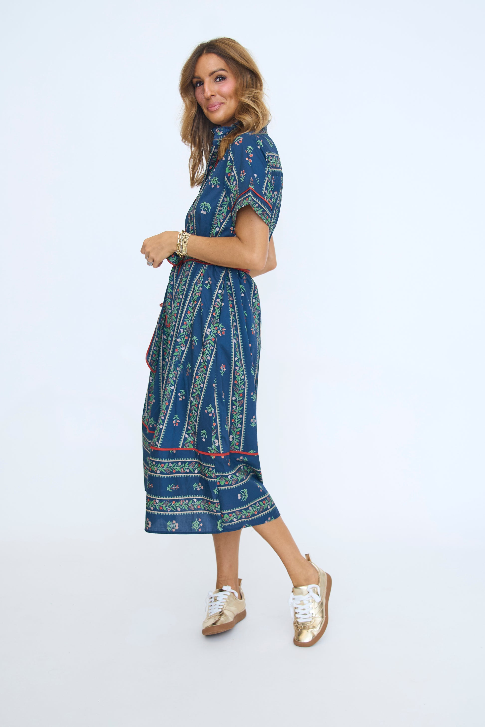 Linear floral pattern short short sleeve pleated ruffle neck band button closure shirt midi shirt featuring contrast accent inset detail. Removable belt. Side pockets. Lined. Woven. Non-sheer. Lightweight.