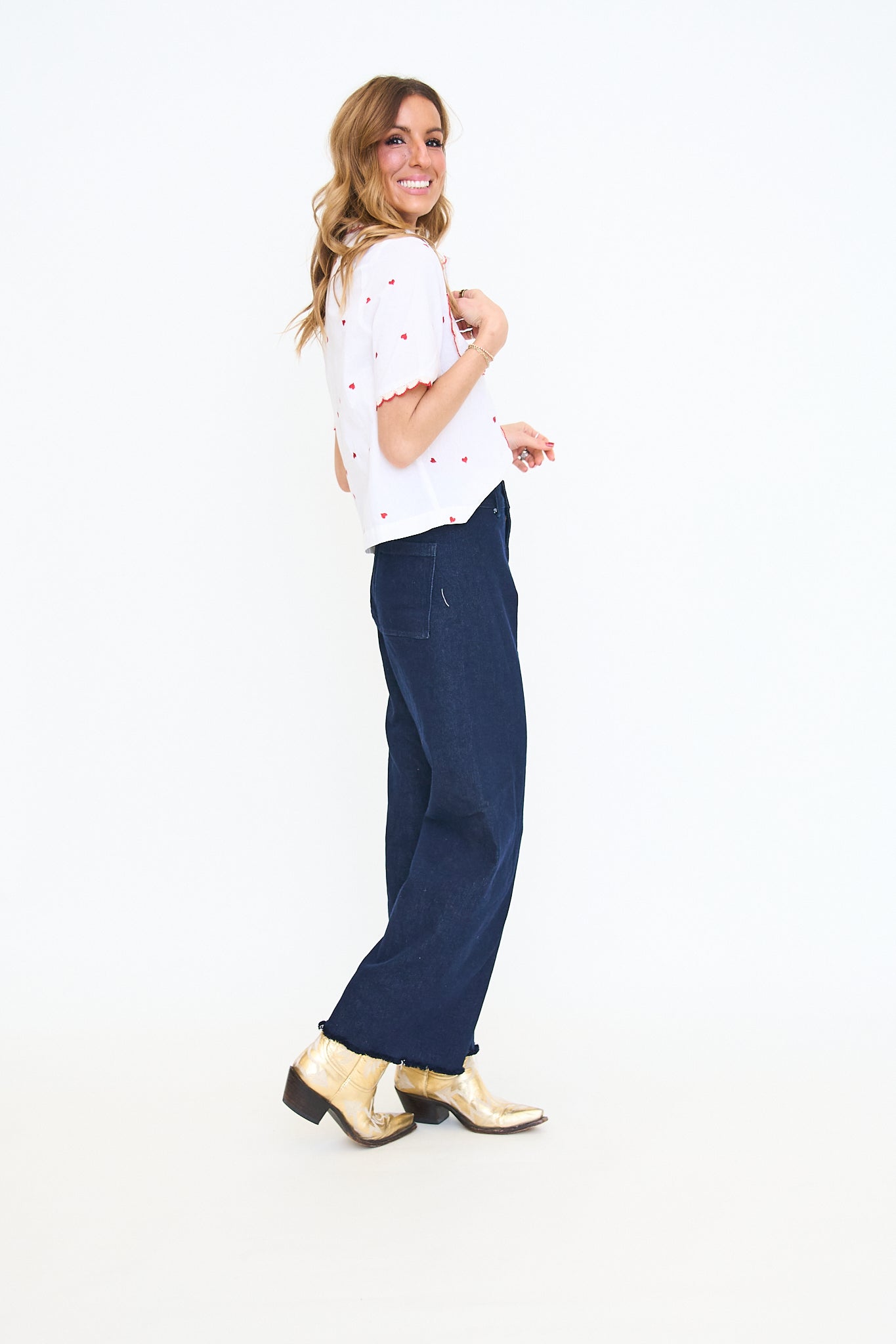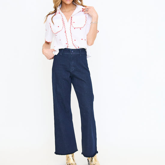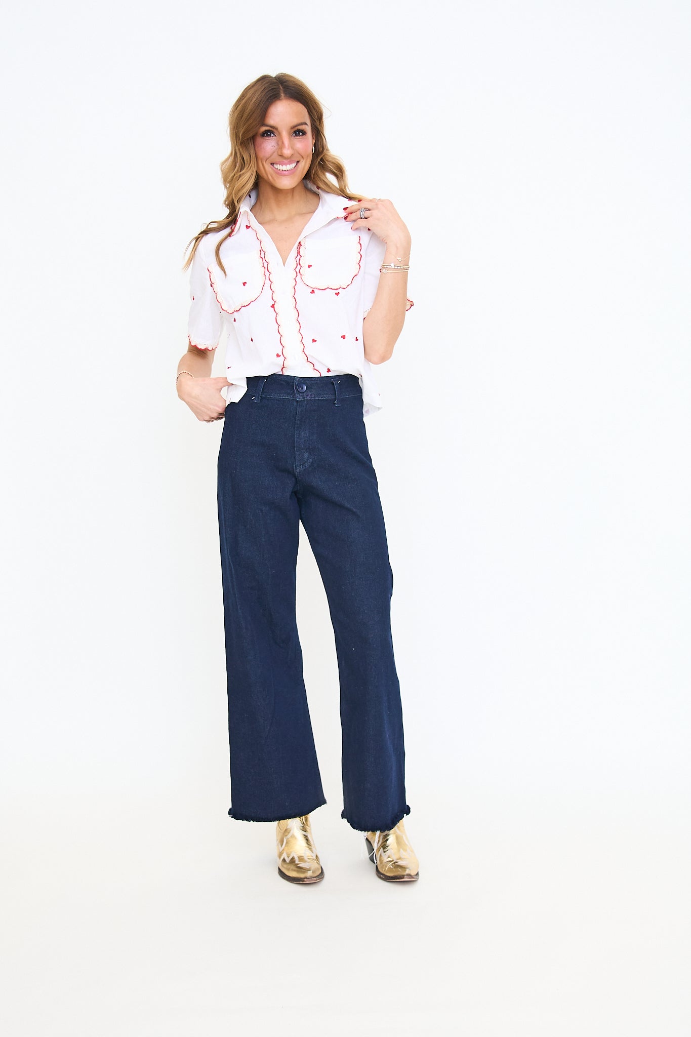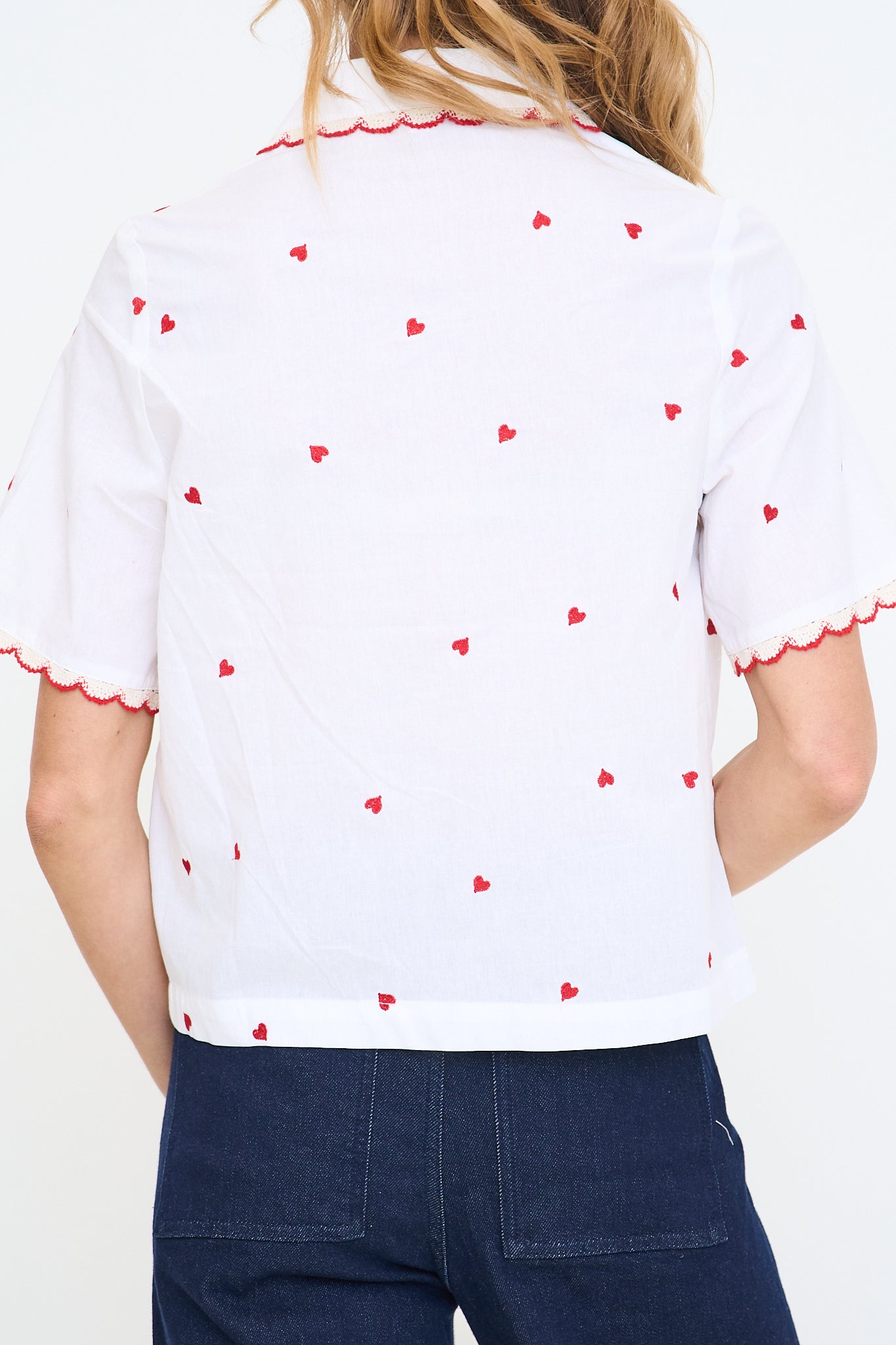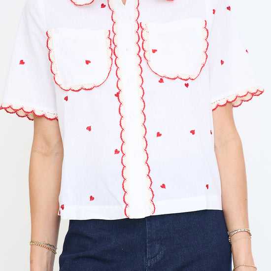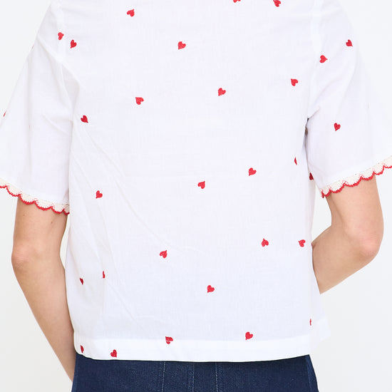- Red heart embroidery on a white woven shirt