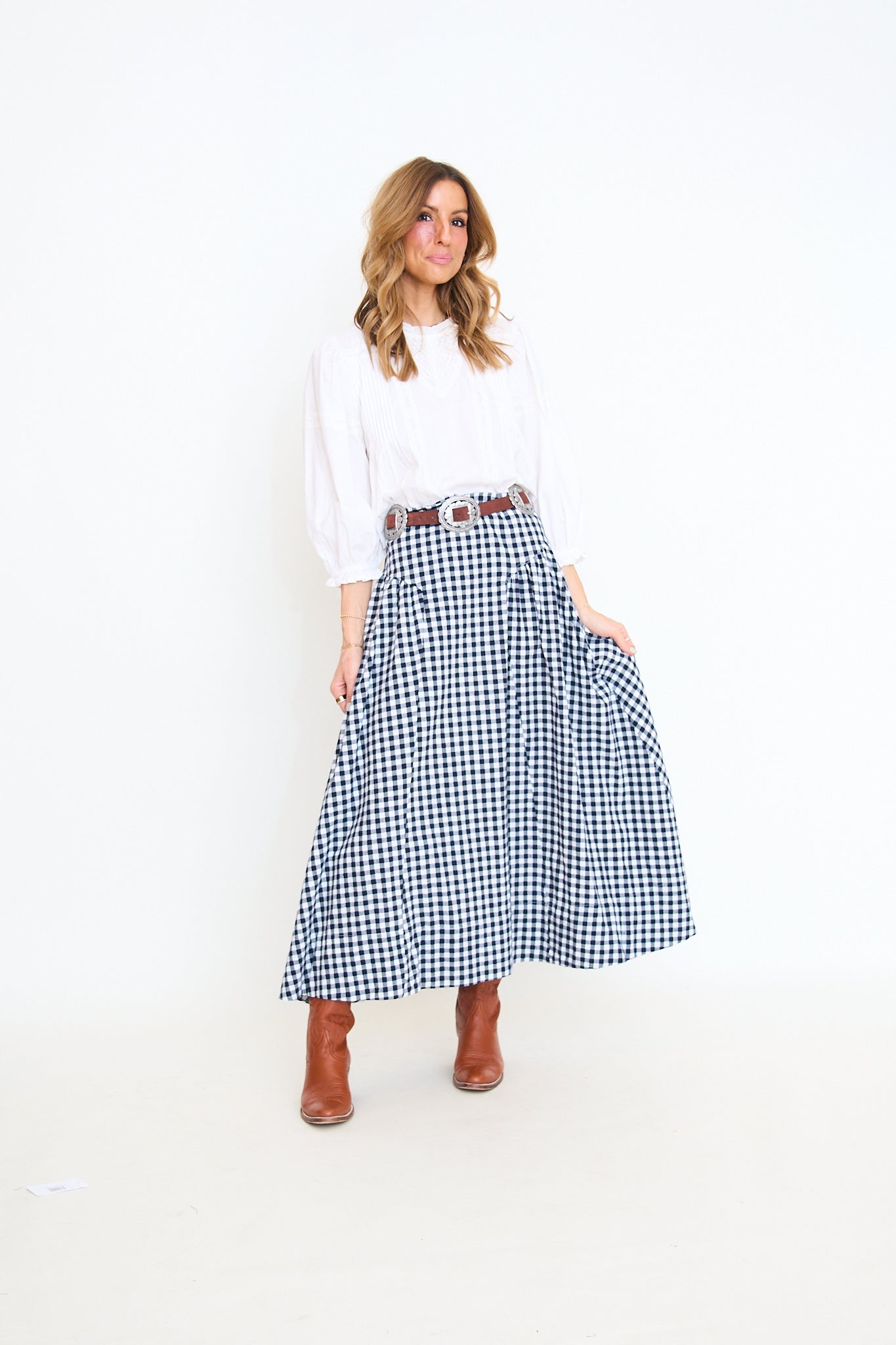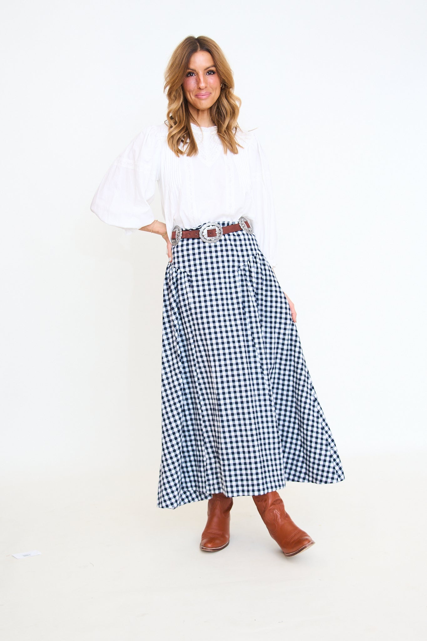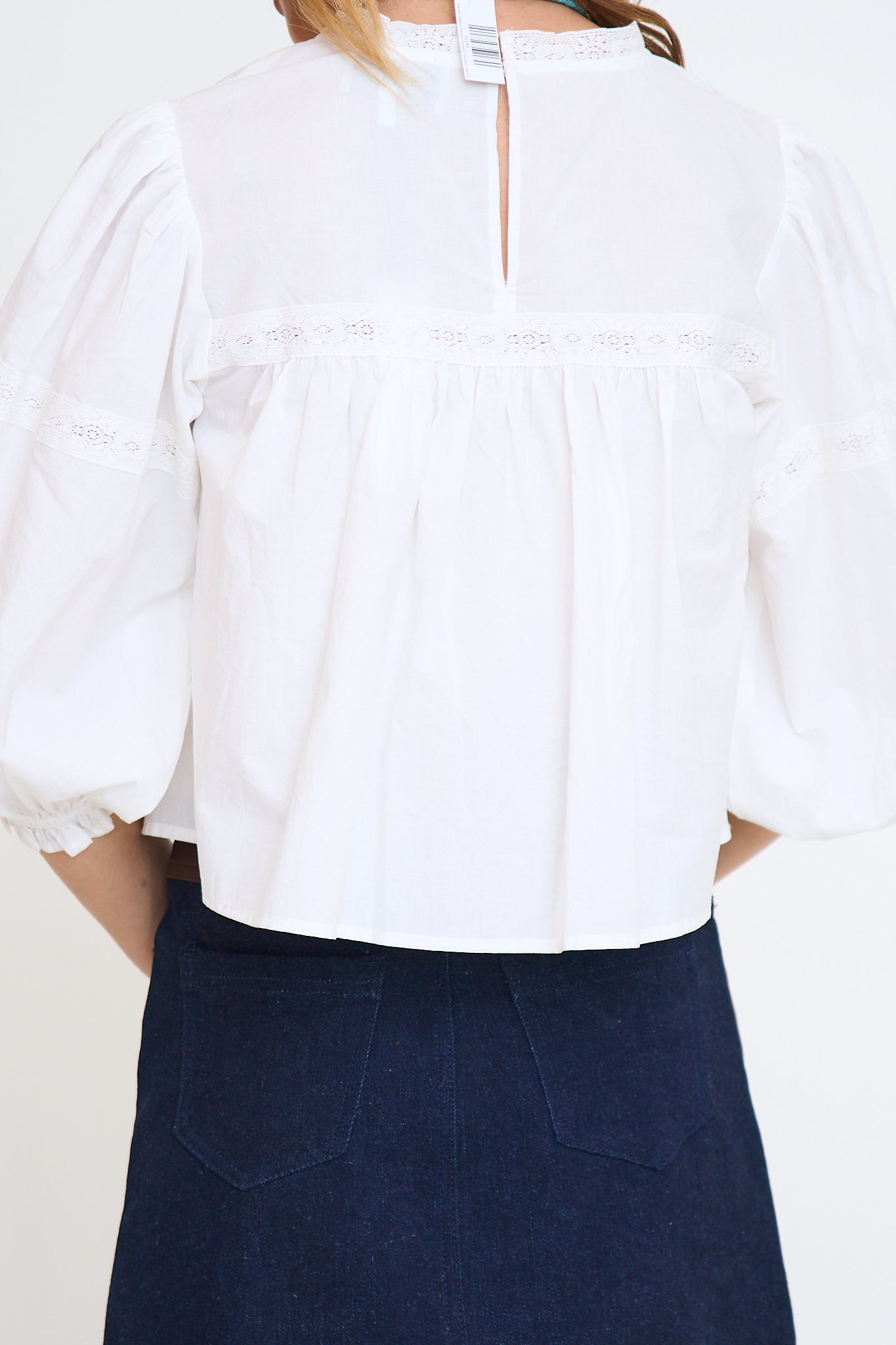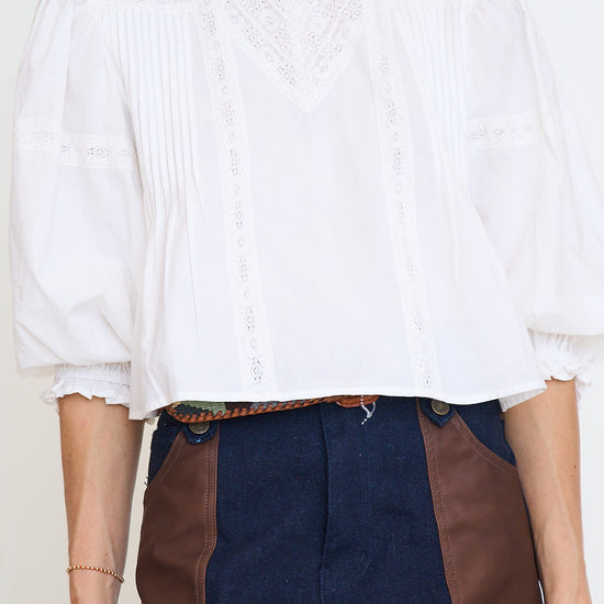 Lace trim cotton blouse featuring delicate lace inserts, front pintuck detailing, and softly gathered balloon sleeves with buttoned cuffs. Finished with a back keyhole closure.
