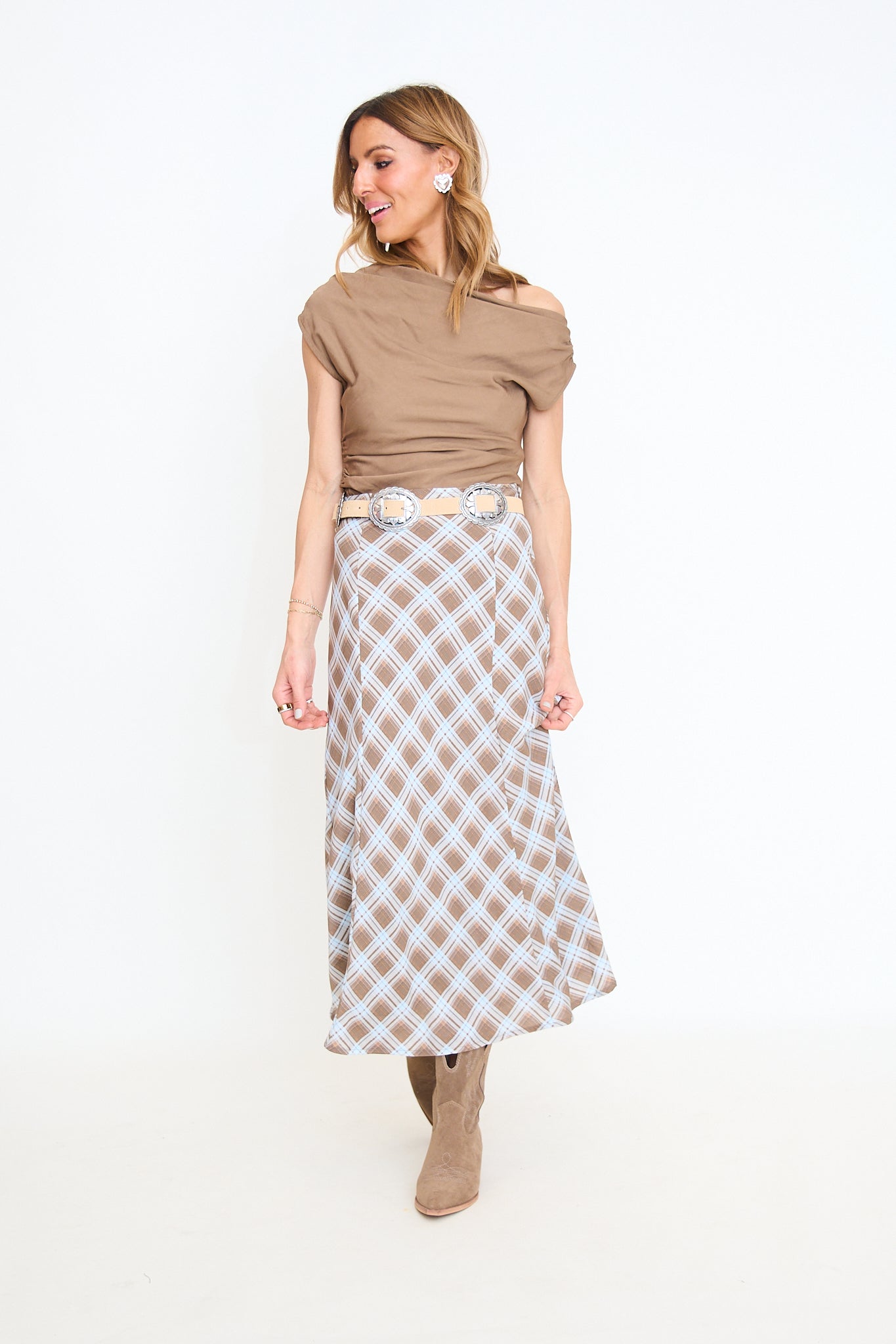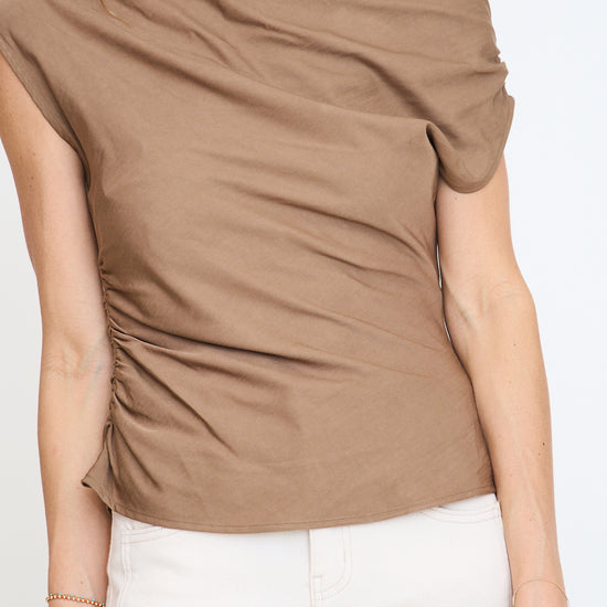 Asymmetric one shoulder draped neckline top with gathered side ruching.