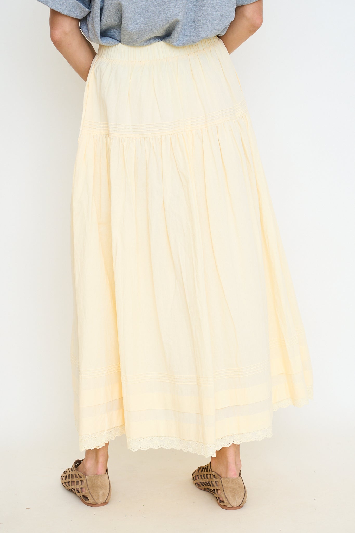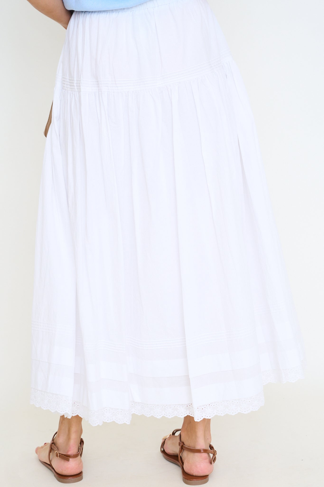 Solid poplin elastic waistband tiered pintuck detail with eyelet lace trim hem midi skirt. Lining.