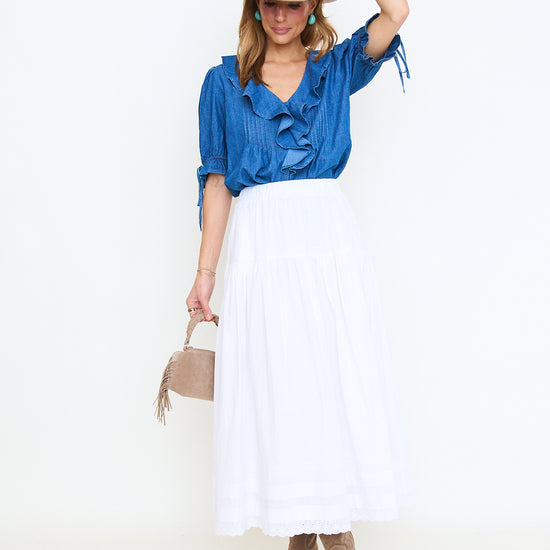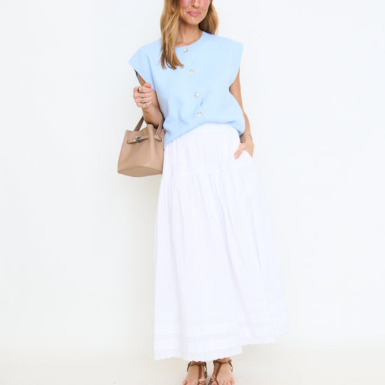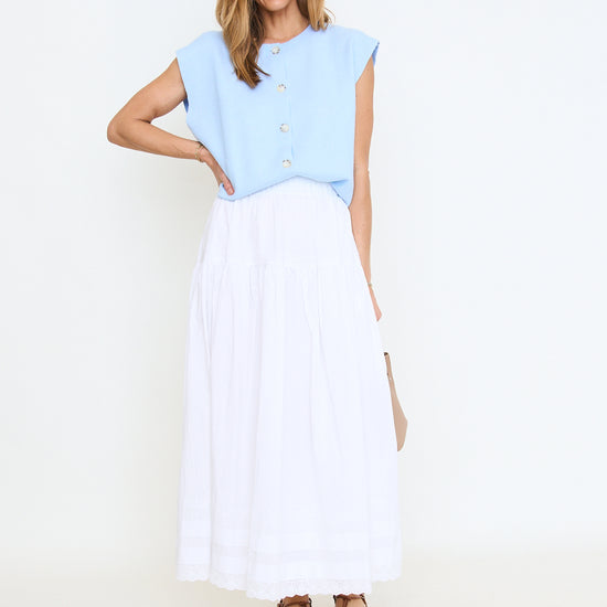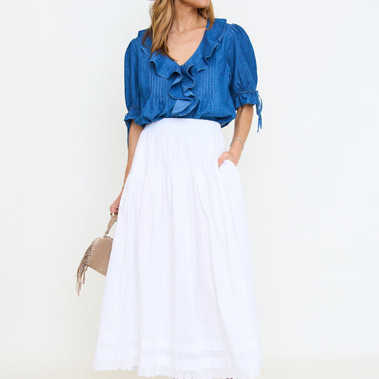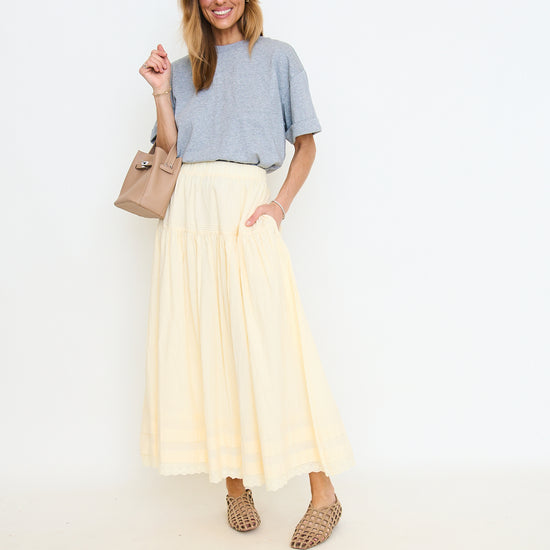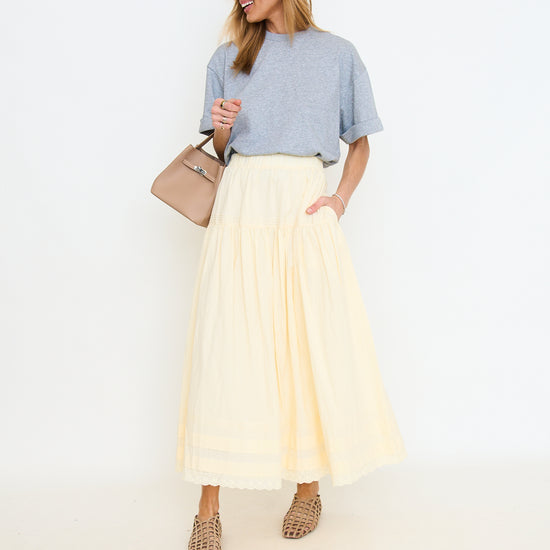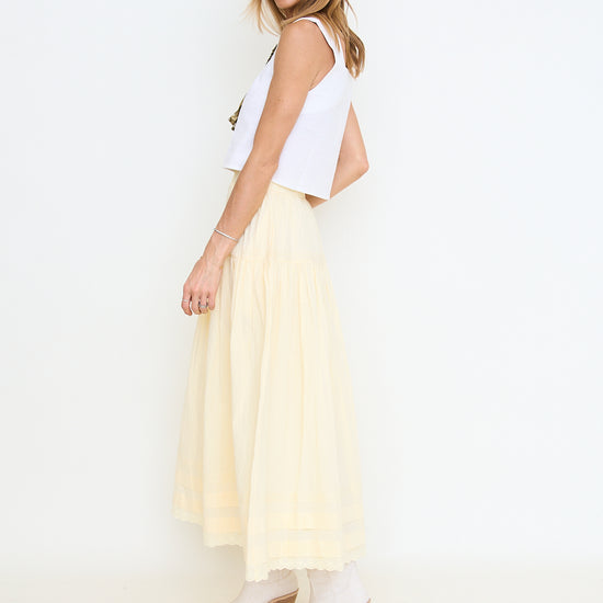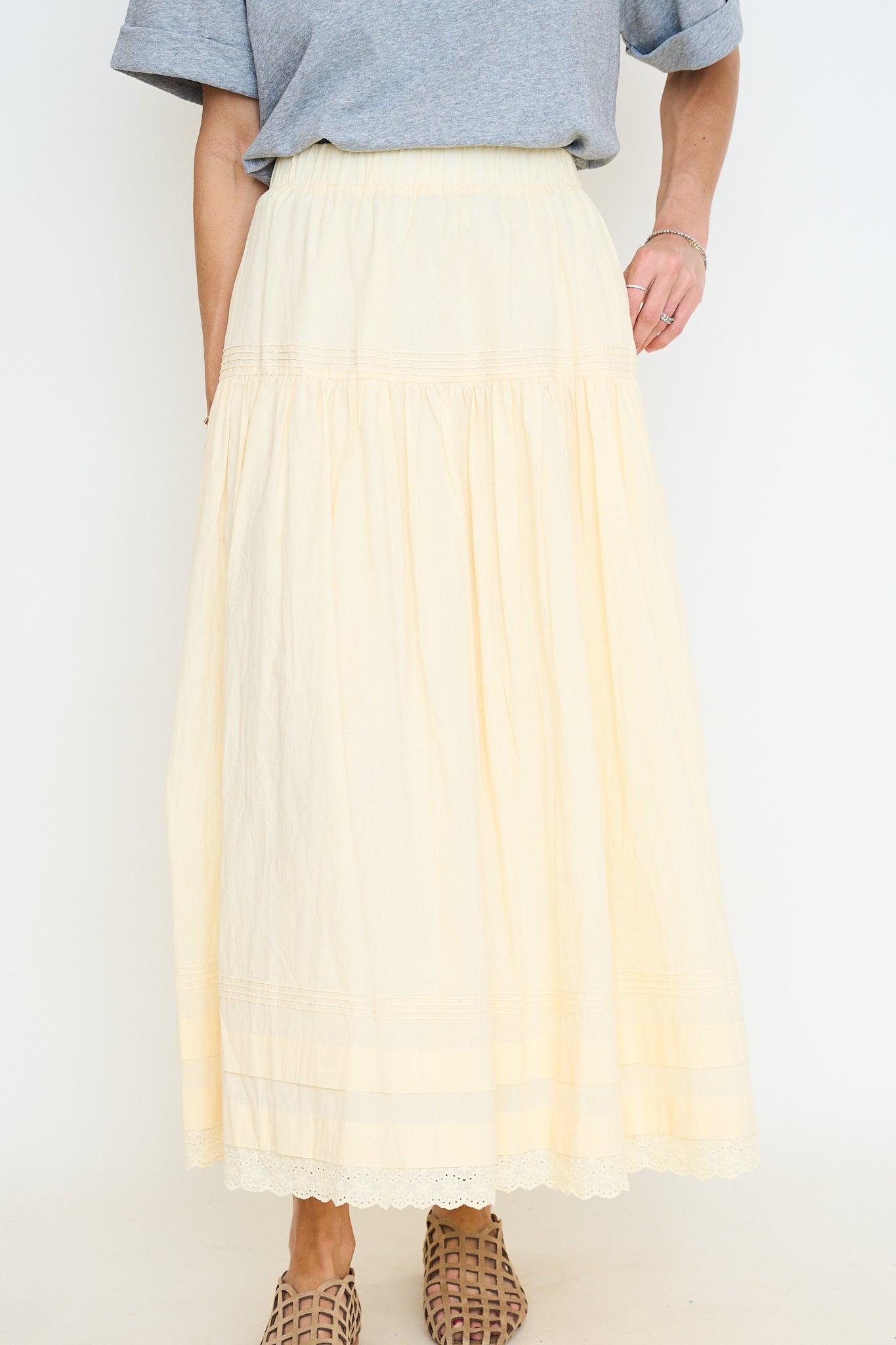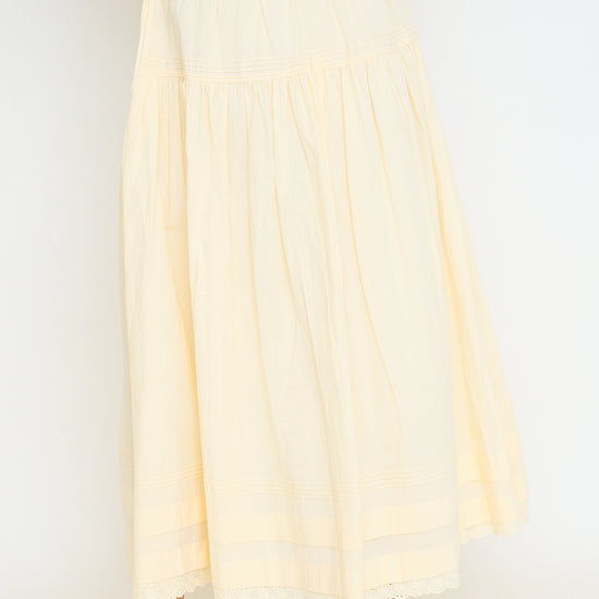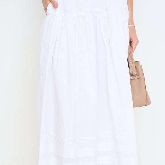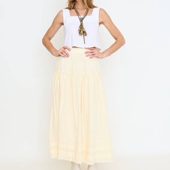 Tiered Pintuck Eyelet Lace Trimmed Midi Skirt