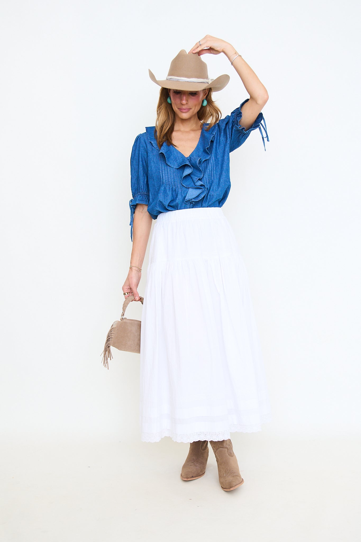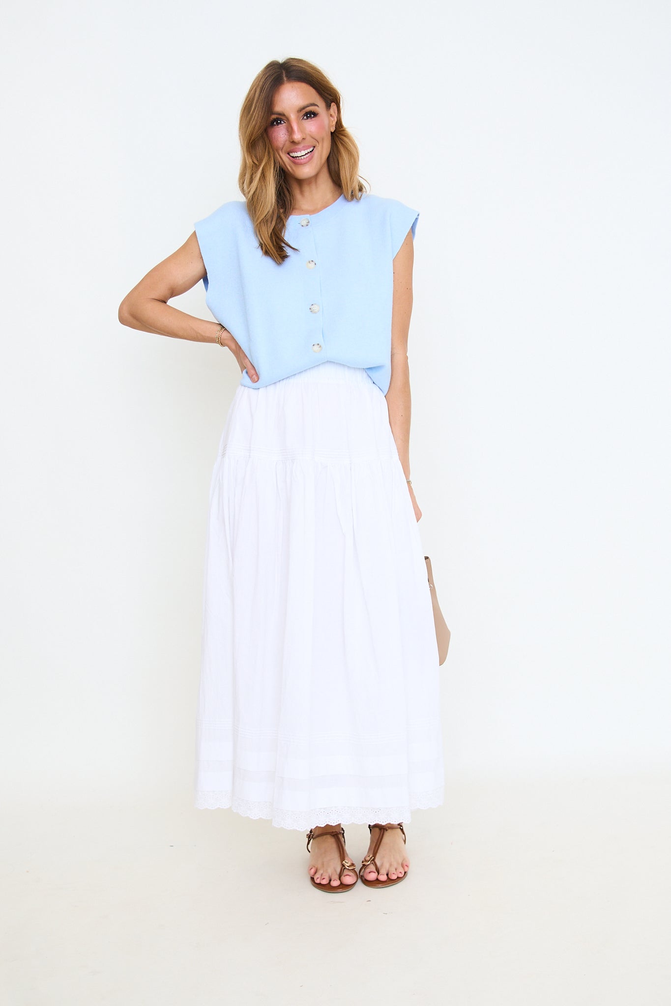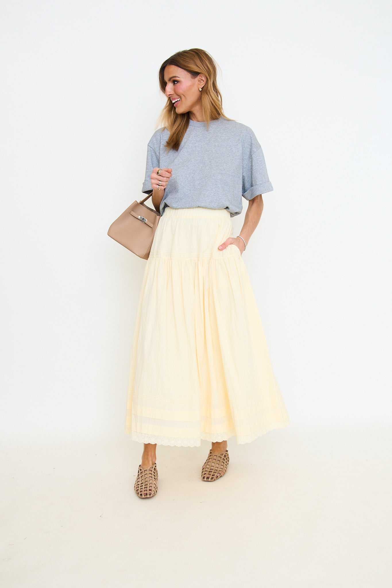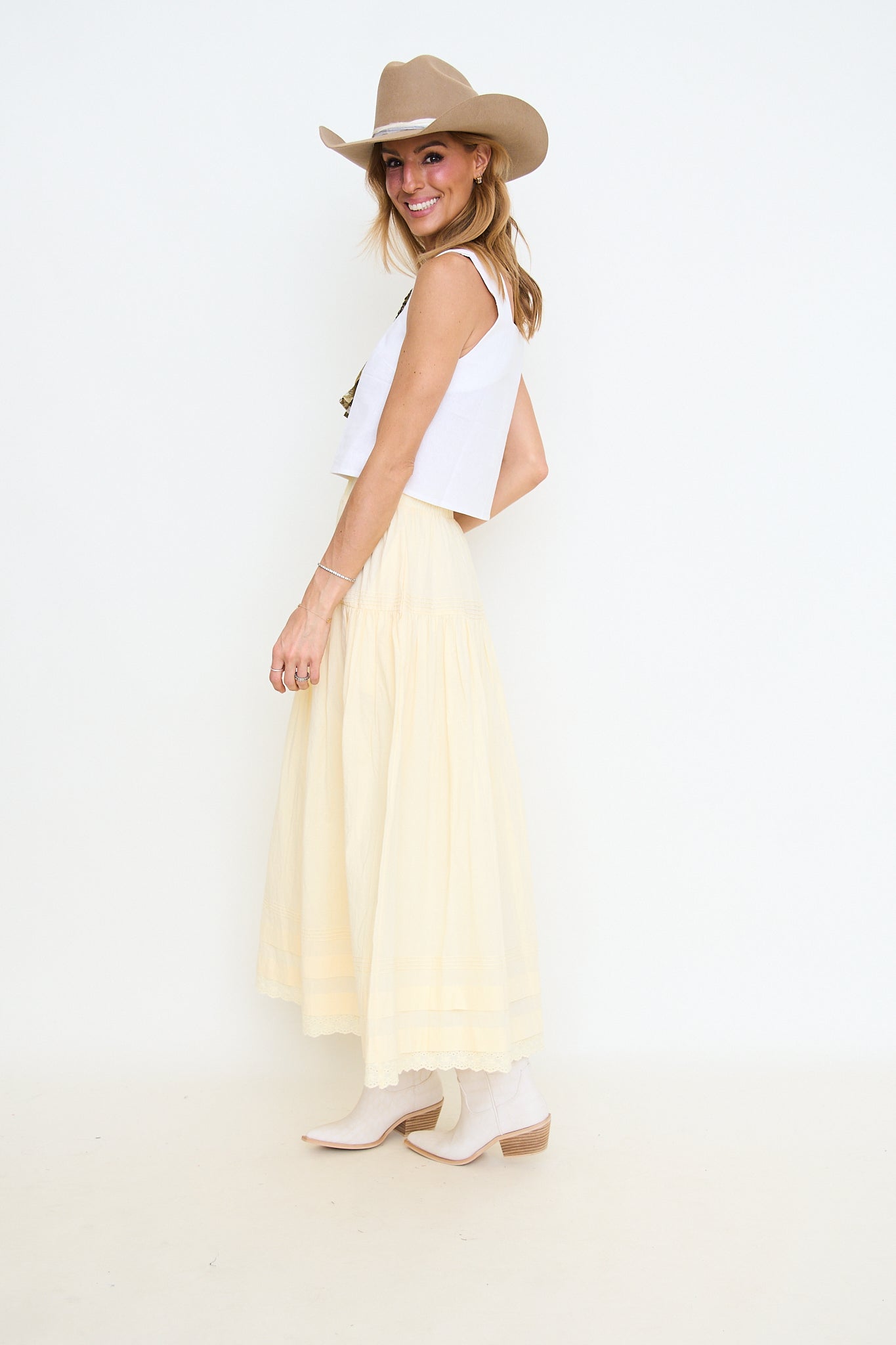 Tiered Pintuck Eyelet Lace Trimmed Midi Skirt