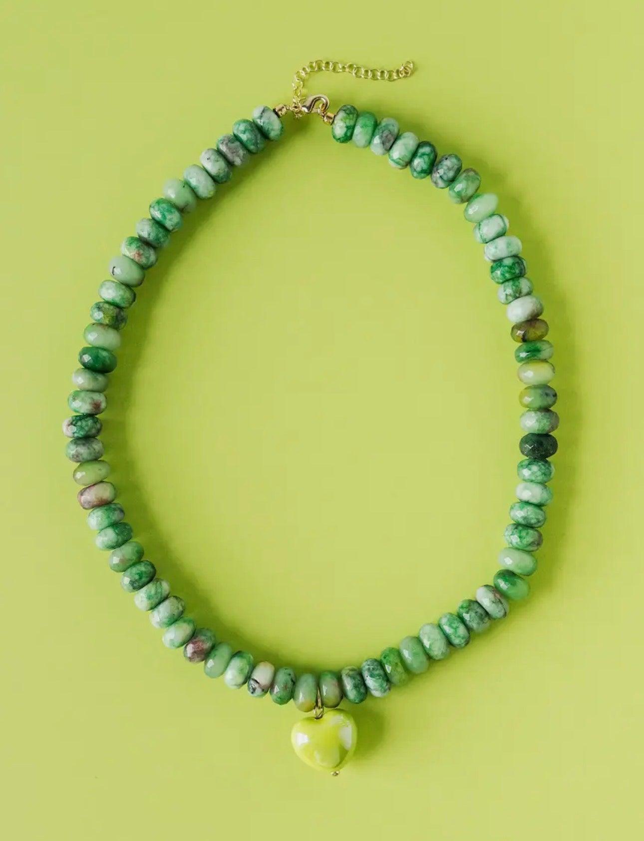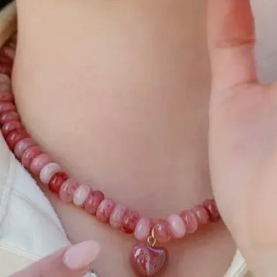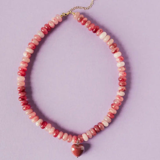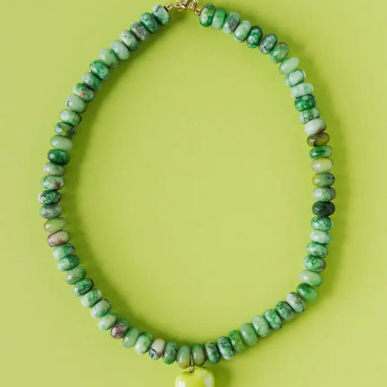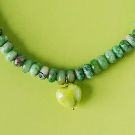 The Alice Necklace combines natural stone with an elegant ceramic heart charm, available in vibrant green or pink. Each piece showcases the unique character of genuine stone, paired with a delicate handcrafted heart that adds a touch of refined sentiment. Perfect for layering or wearing alone, this necklace brings understated sophistication to any ensemble while celebrating individuality through its natural variations and thoughtful design.