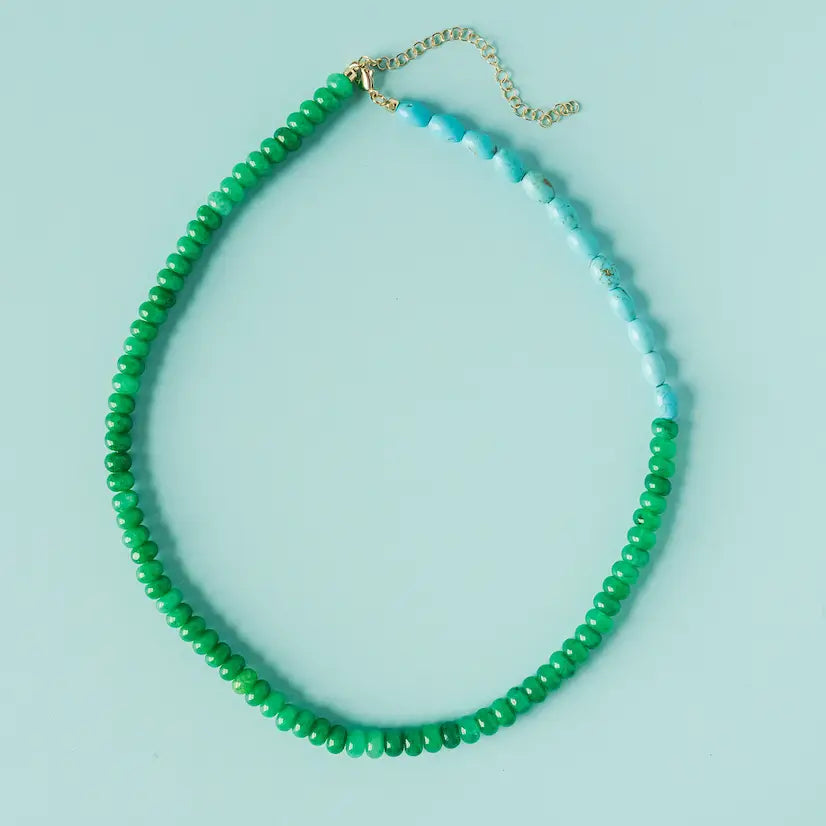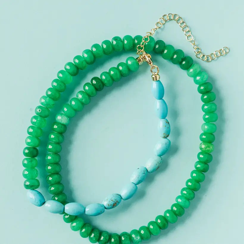 Elevate your everyday elegance with the Reef Necklace, a striking composition of natural stones in captivating aqua and vibrant green hues. Each carefully selected stone brings its own character to this refined piece, creating a harmonious blend that evokes the serene beauty of coastal waters. The sophisticated color palette makes it's versatile enough to compliment both casual and polished looks, while the natural variations in each stone ensure your necklace is truly one-of-a-kind. A timeless accessory for those who appreciate understated luxury and the organic allure of nature's gemstones.