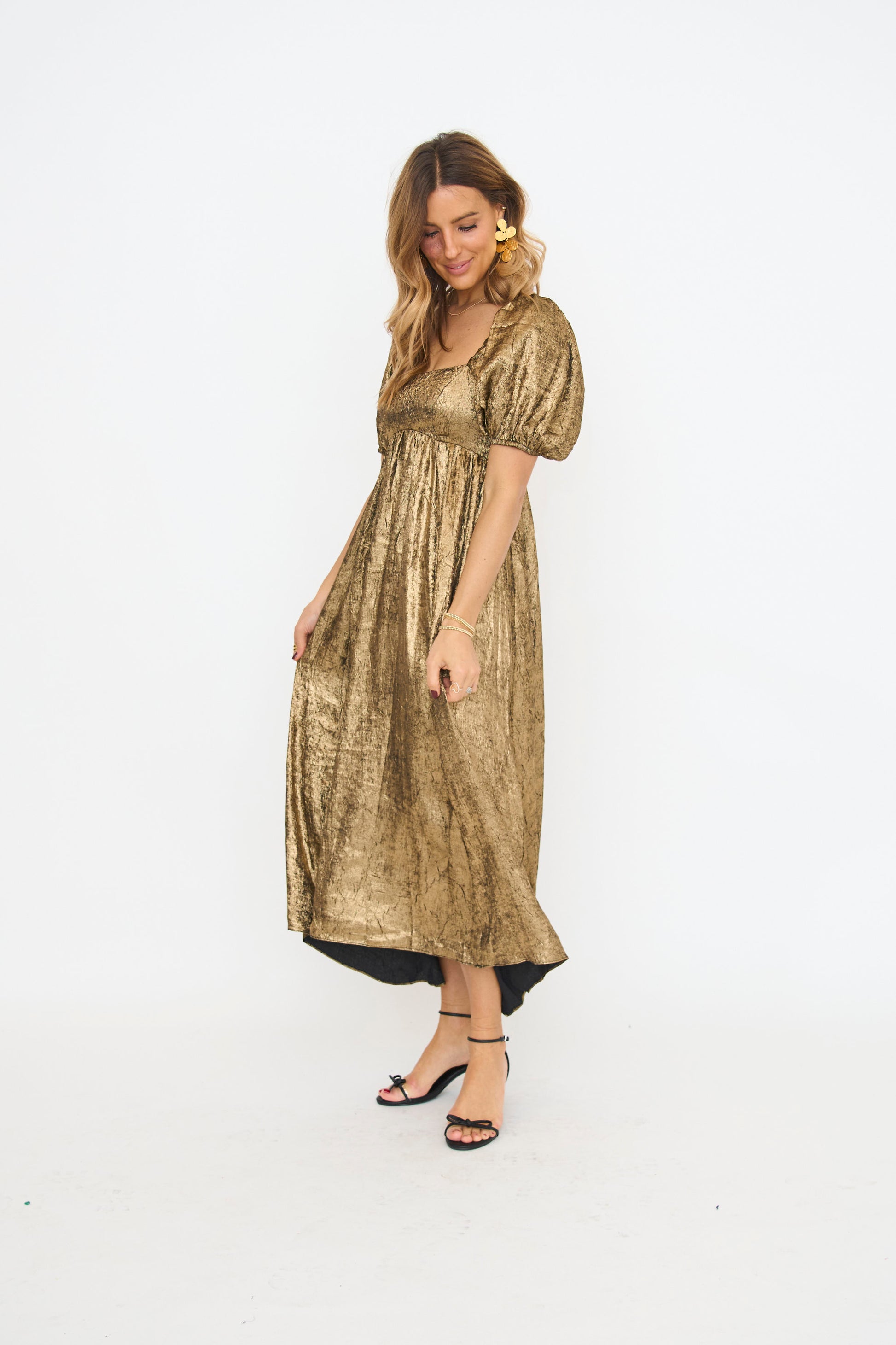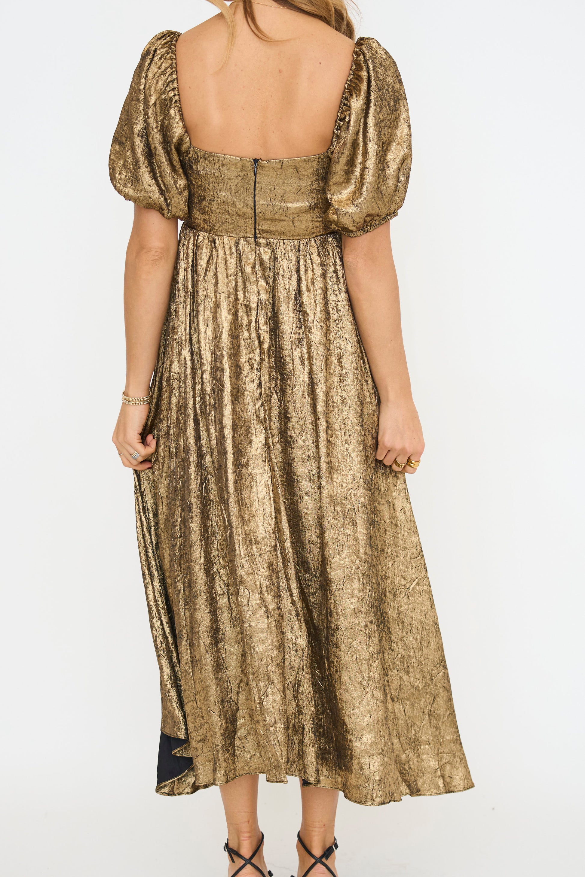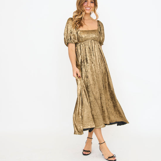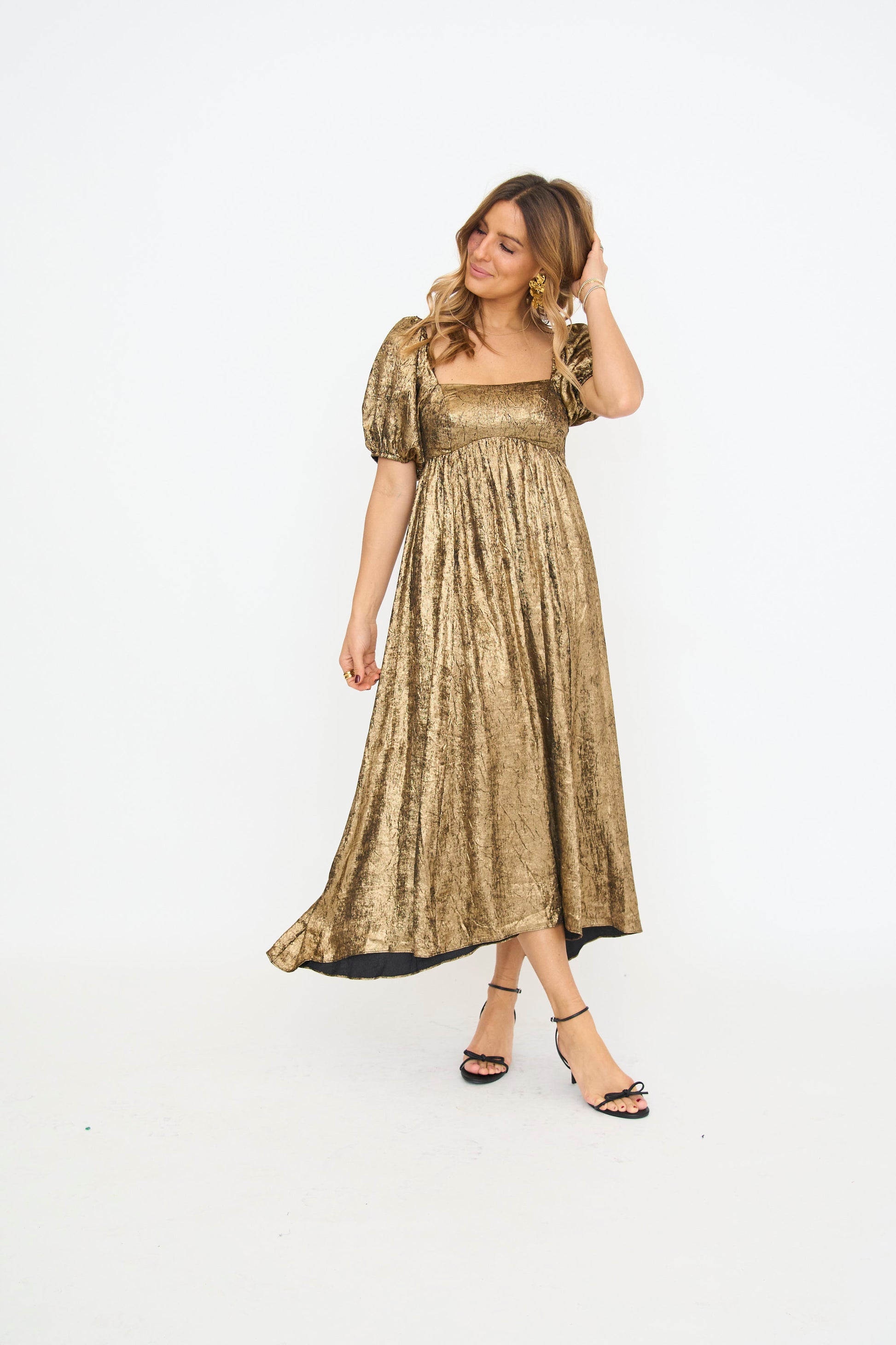 Charming puff sleeves and an Empire waist enhance the romantic silhouette of this striking metallic midi.