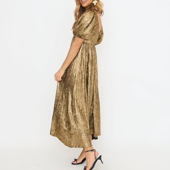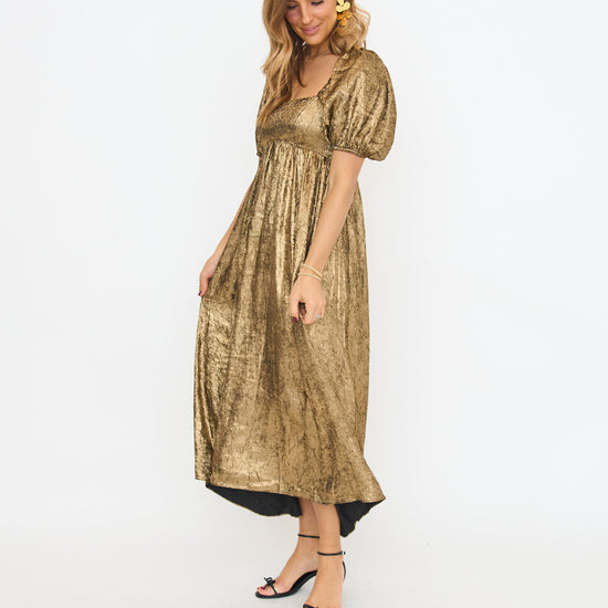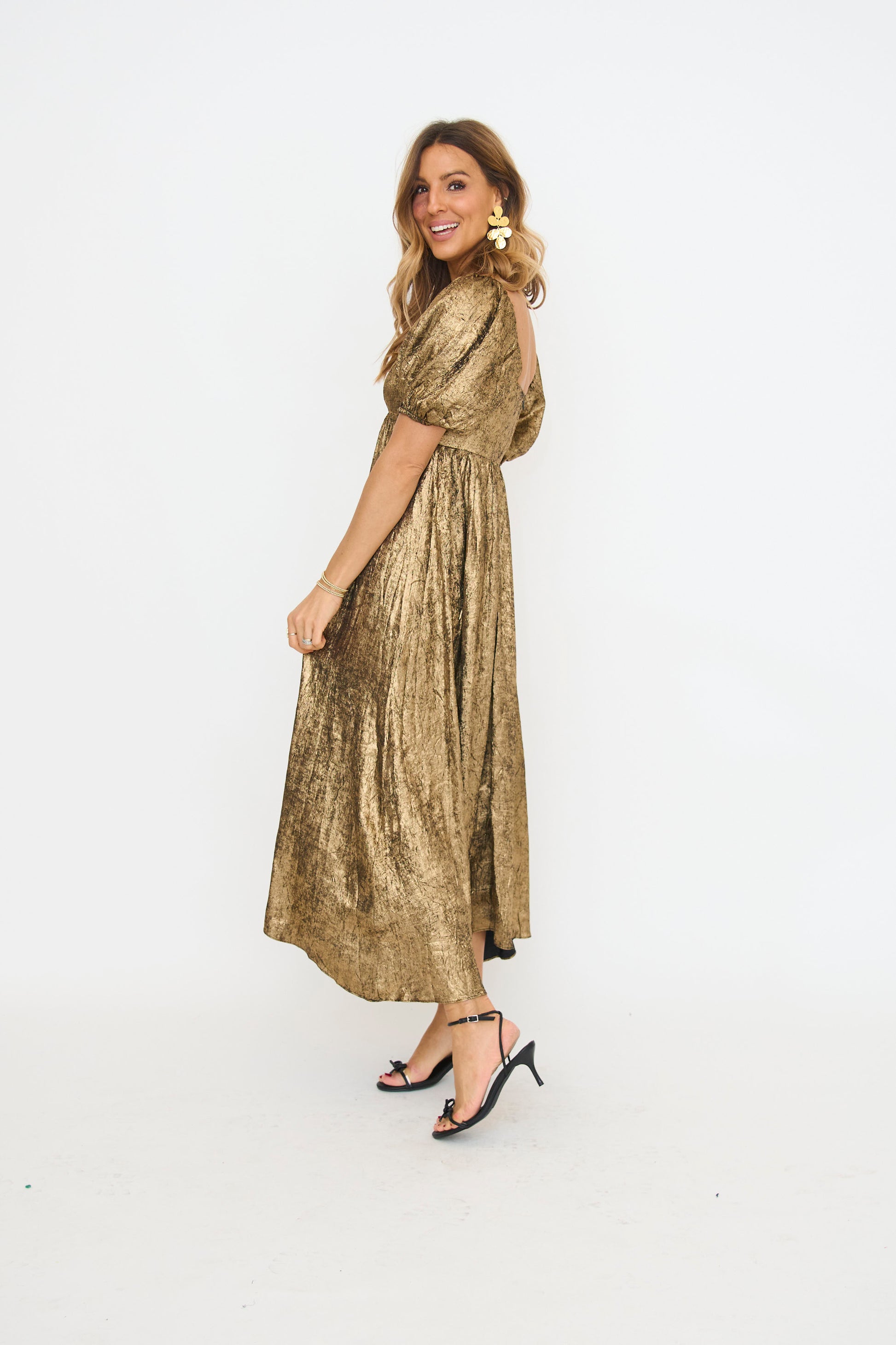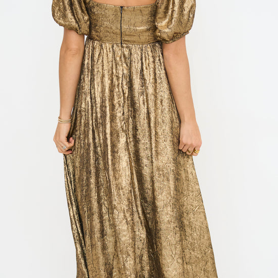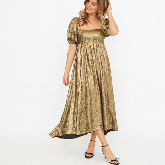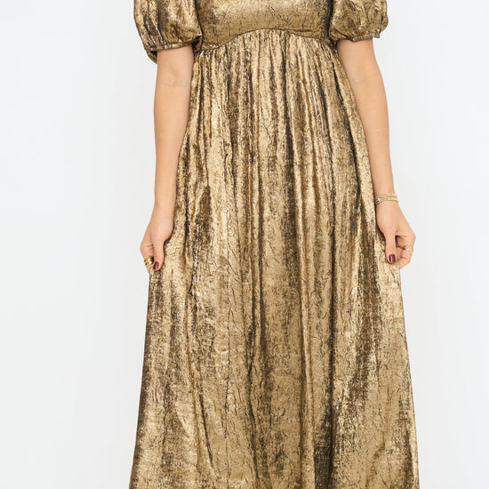 Charming puff sleeves and an Empire waist enhance the romantic silhouette of this striking metallic midi.