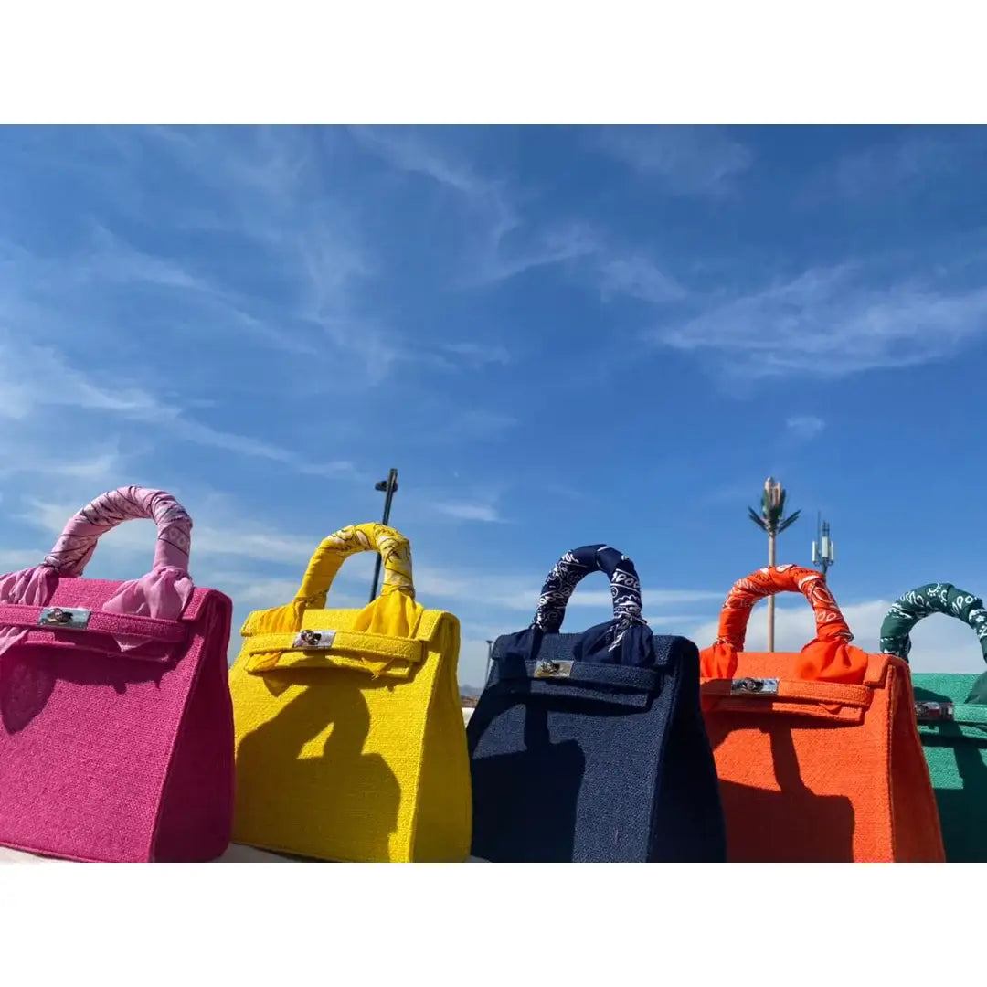 Kelly bag in died jute with handles covered with bandana and shoulder strap.