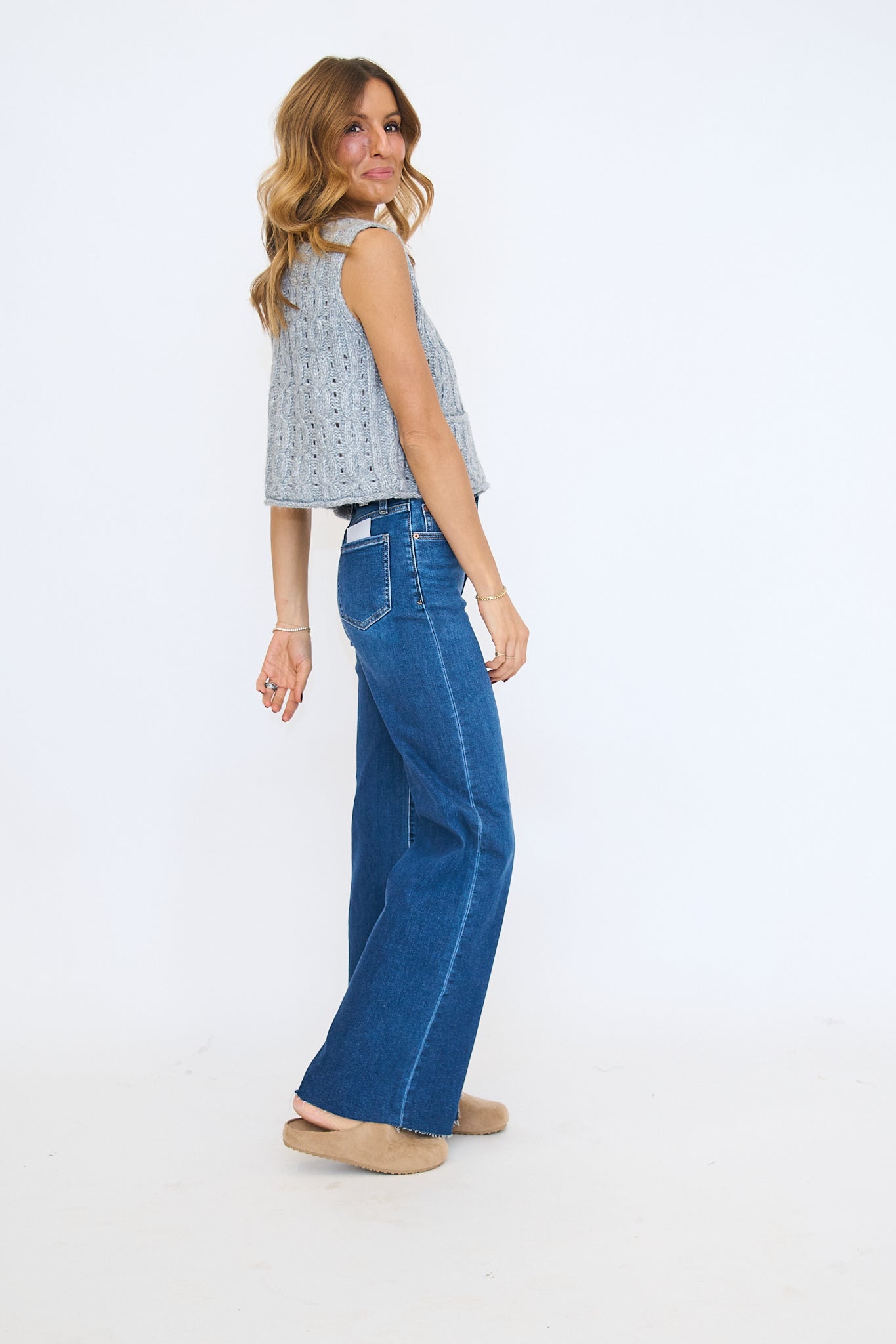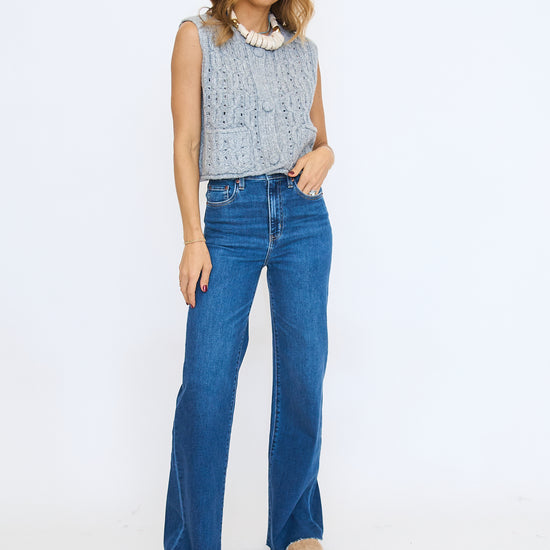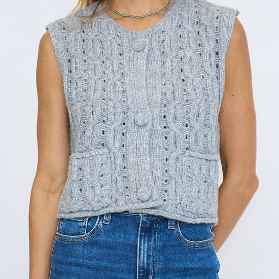 A cozy cable knit vest featuring a classic round neckline and button front closure. Designed in a sleeveless silhouette with textured knit detailing and front pockets, this heather grey style adds a soft, handmade touch to any look. Perfect for layering in transitional seasons.