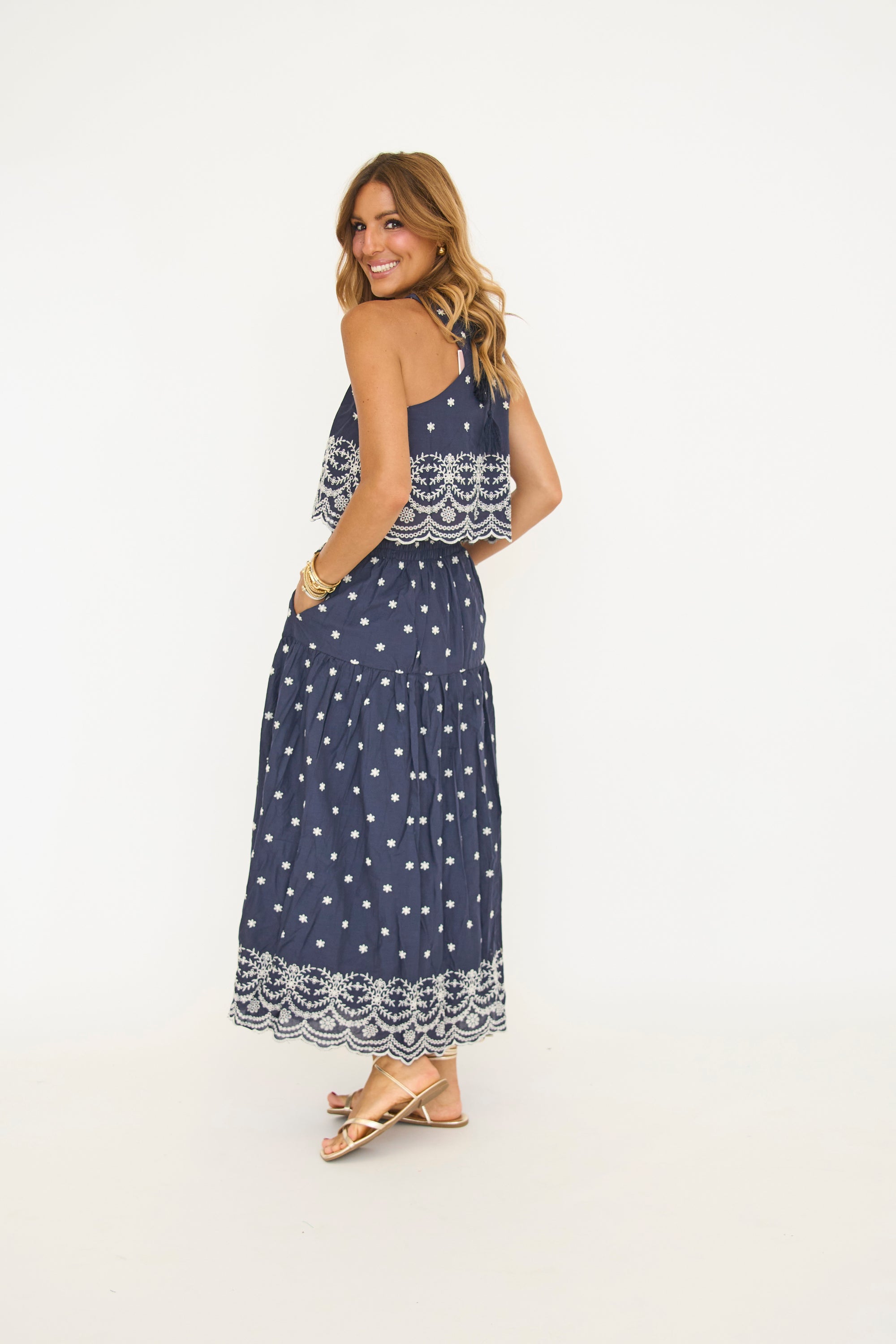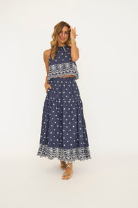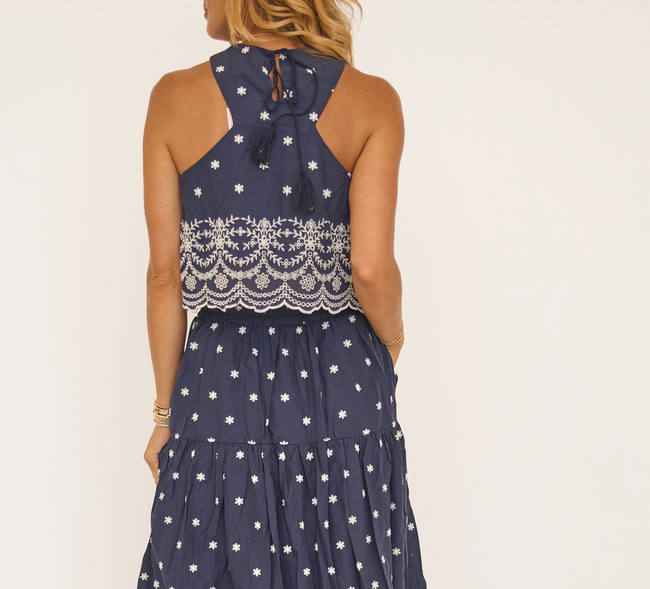 The Nara Top is your perfect summer companion with its playful cropped fit and classic navy hue. Featuring charming white eyelet details, it brings a fresh Nantucket vibe to your warm-weather wardrobe. Light, breezy, and effortlessly stylish, this top is ready to brighten your sunny days.