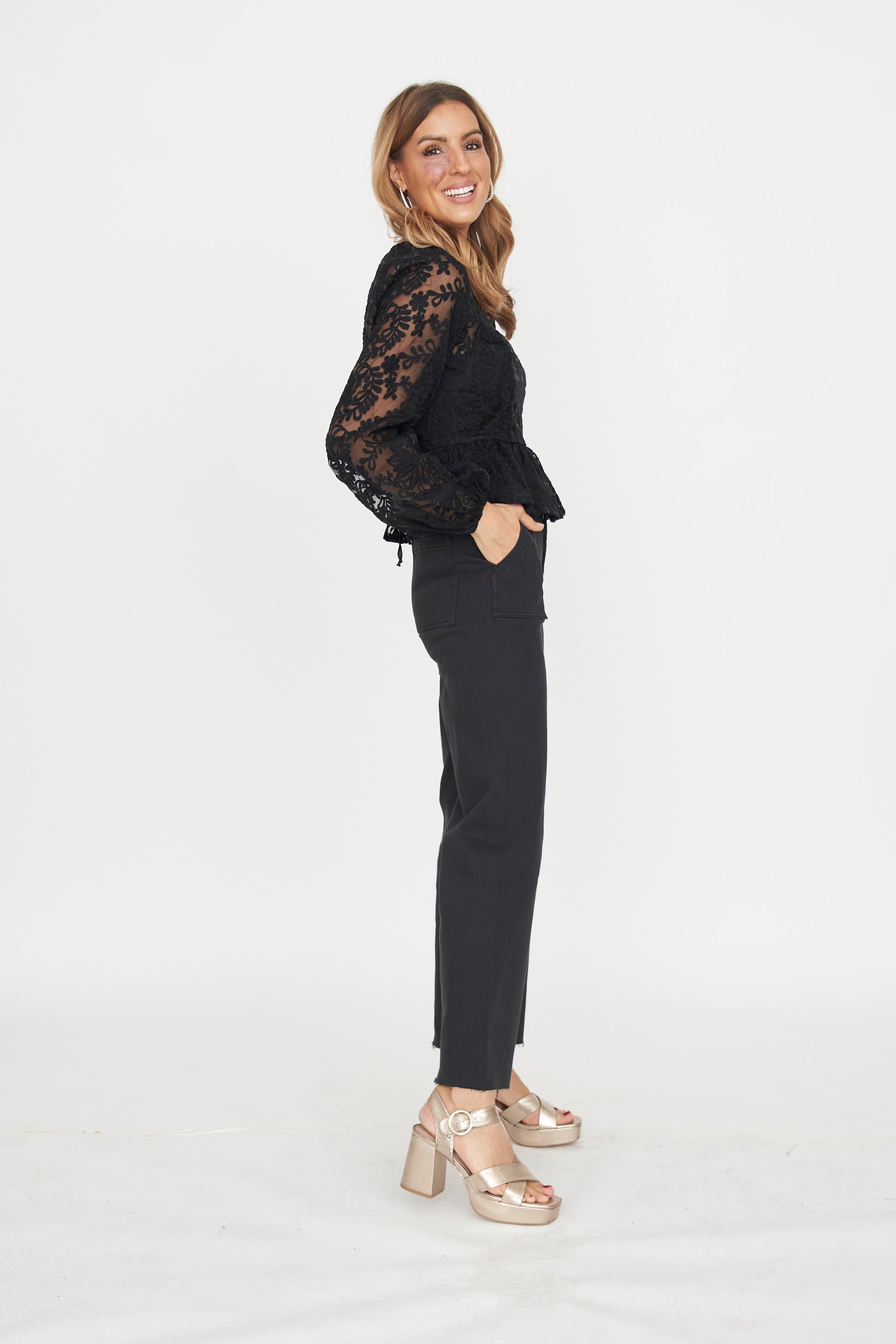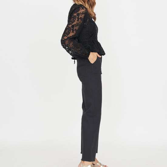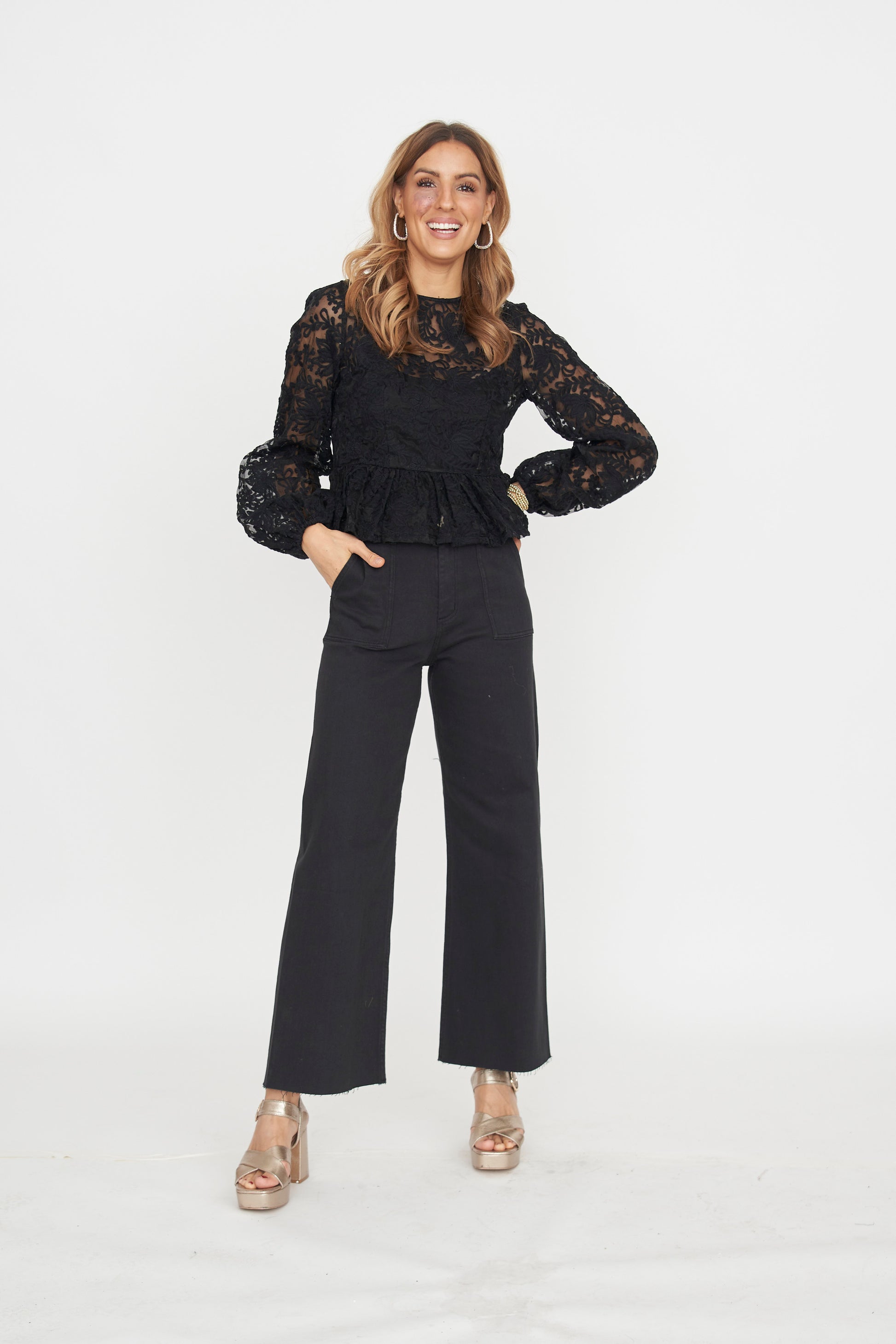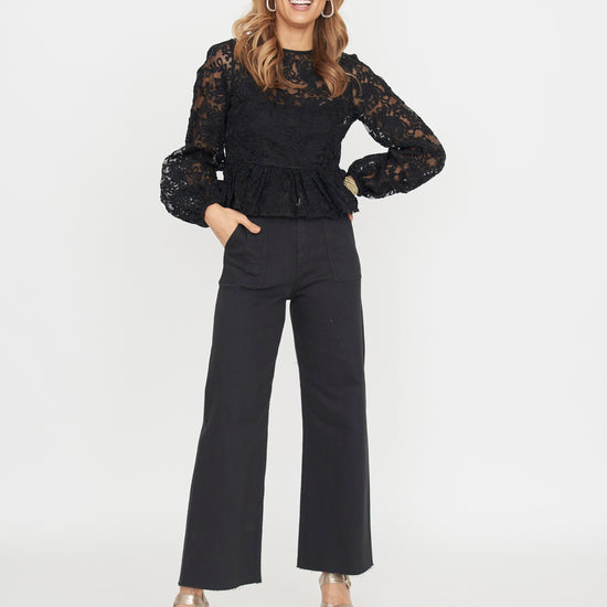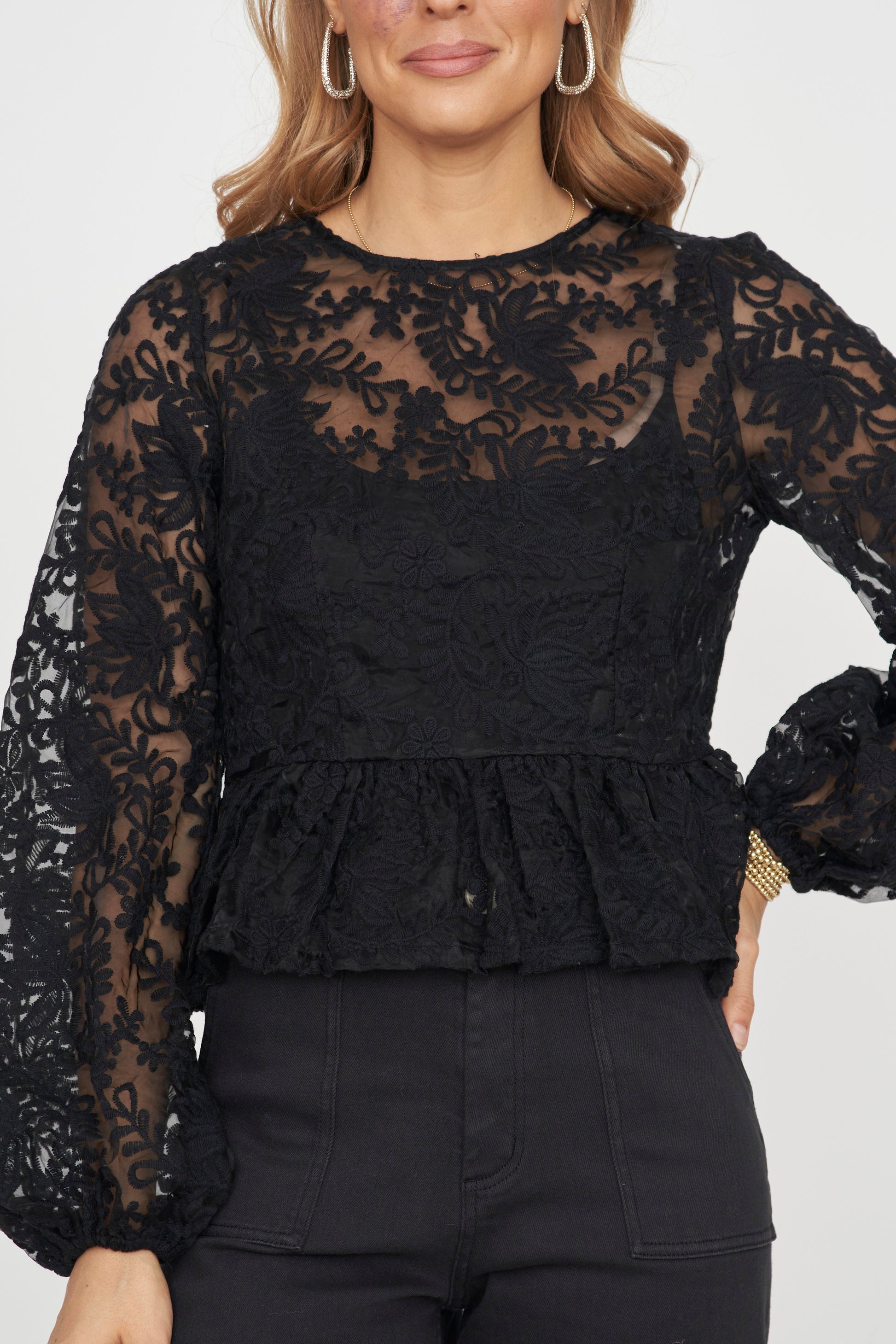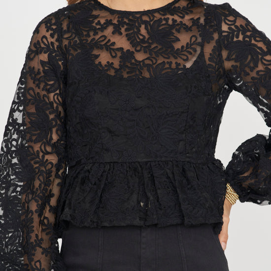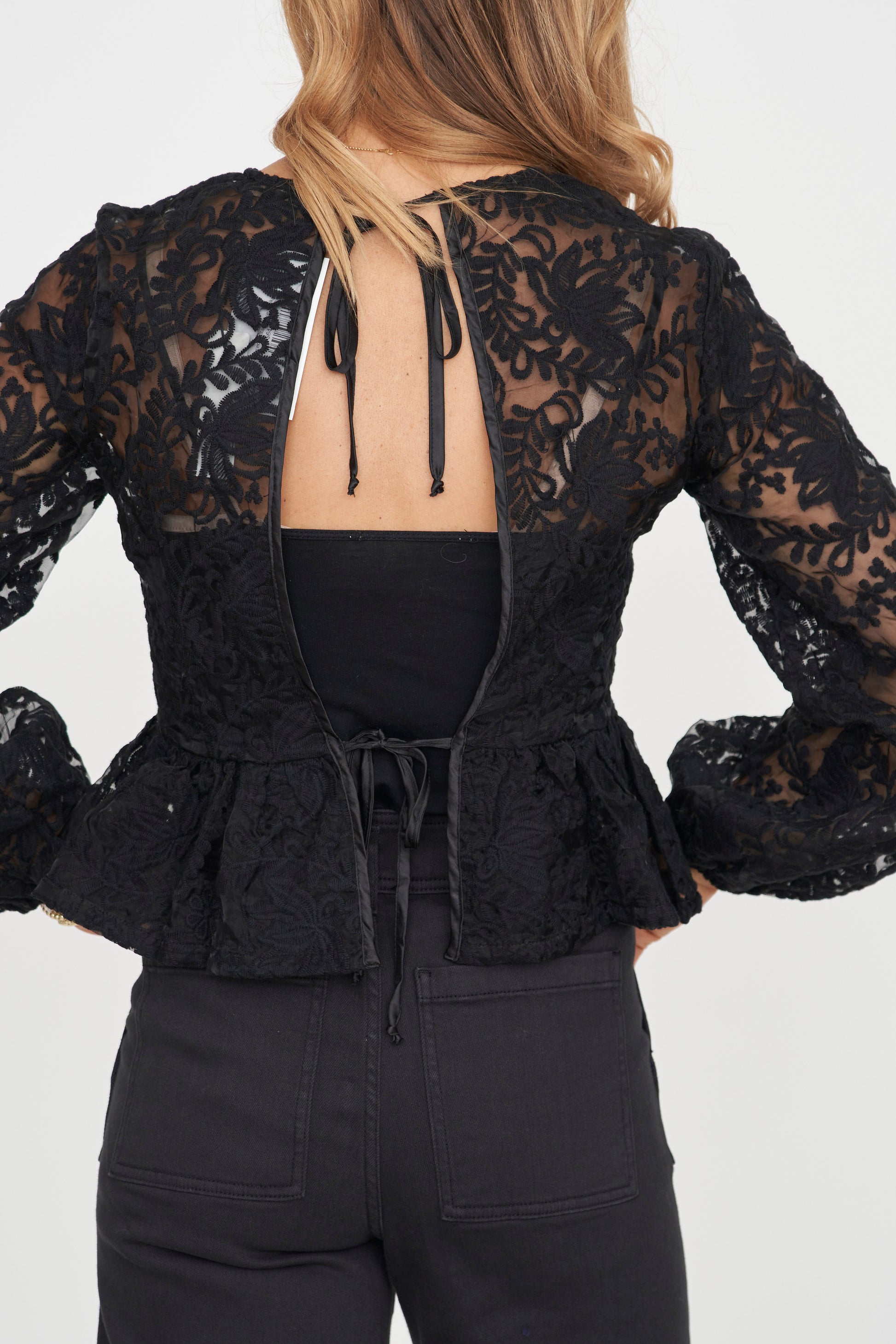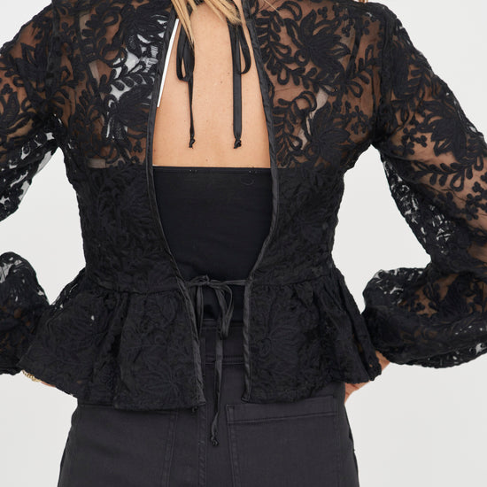Our Jenna Top features a puff sleeves and a center back tie Embroidered lace detailsSheerPeplum style