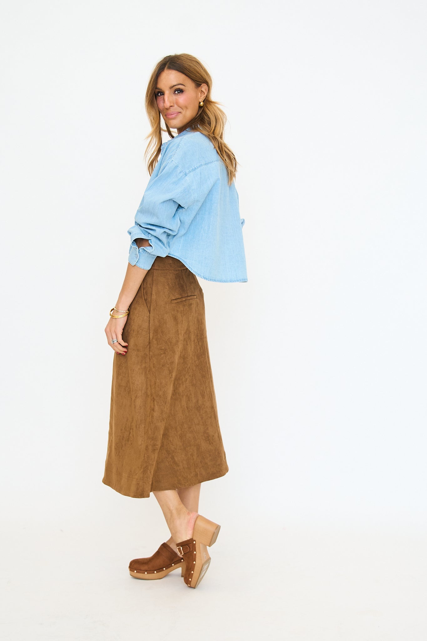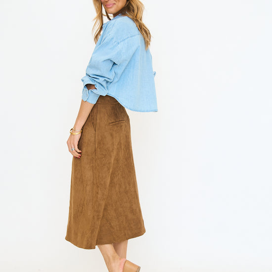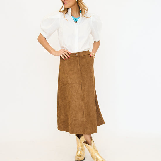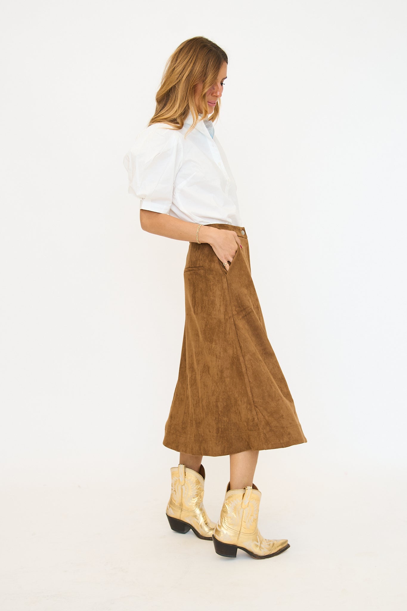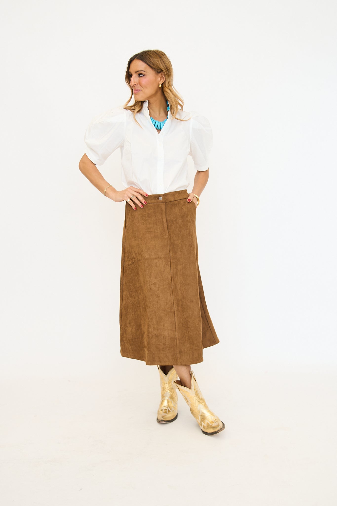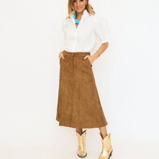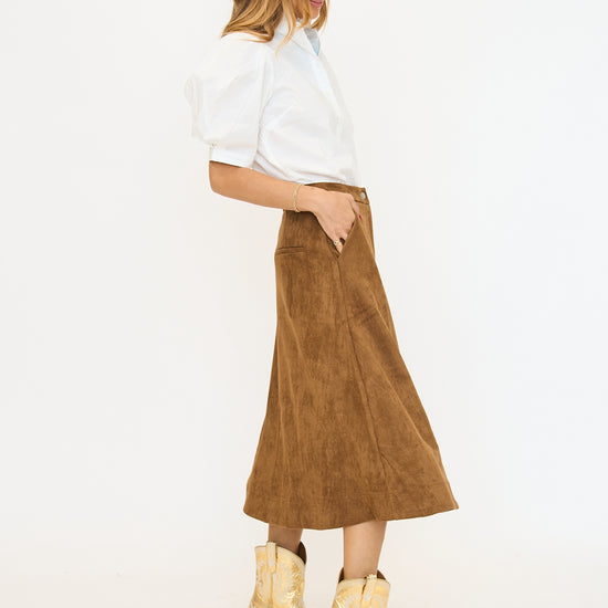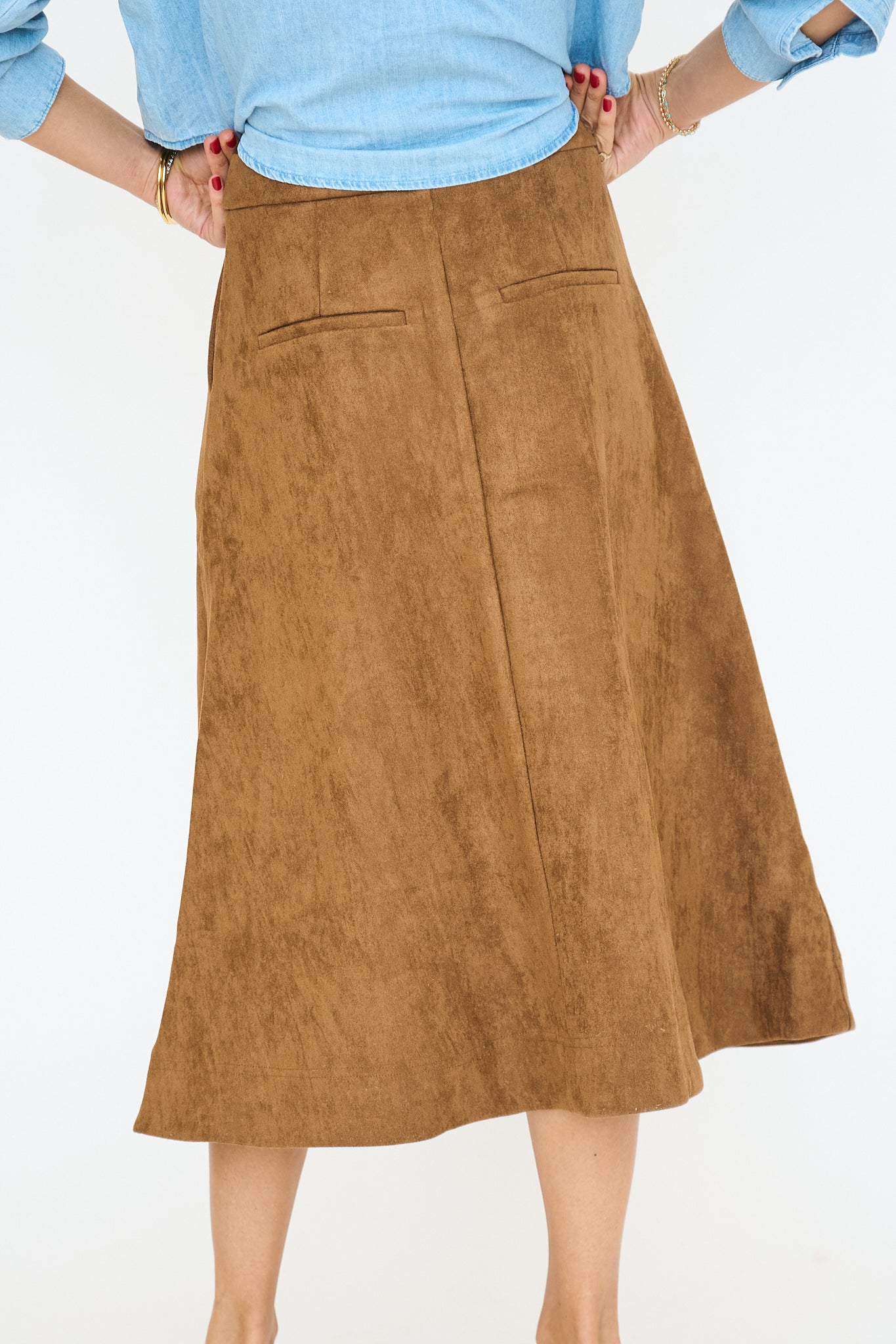 Our Myah Maxi Skirt features a buckle closure and an A line shape.