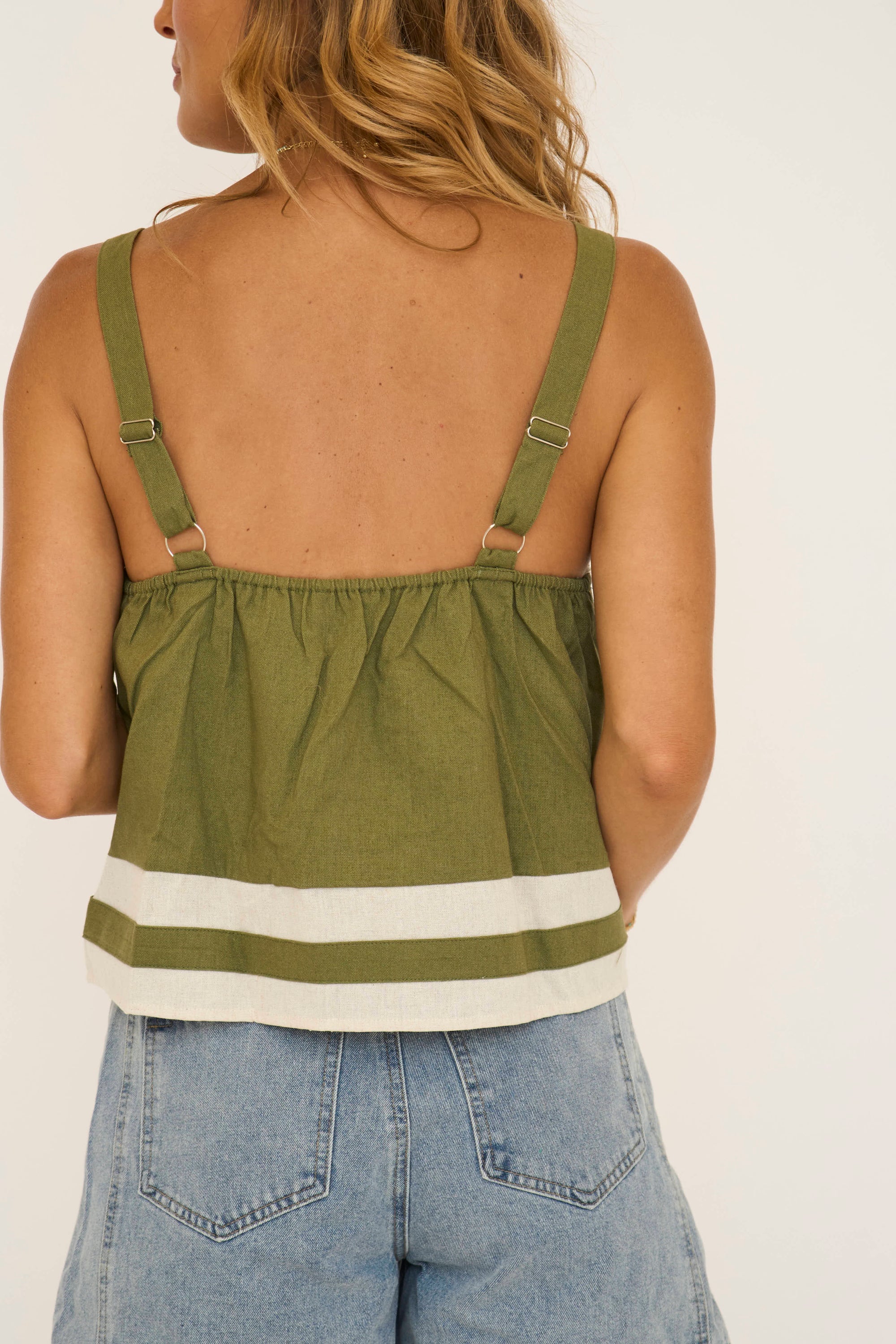 Solid adjustable wide shoulder strap pullover top featuring contrast accented abstract border. Elasticated back. Lined. Woven. Non-sheer. Lightweight.