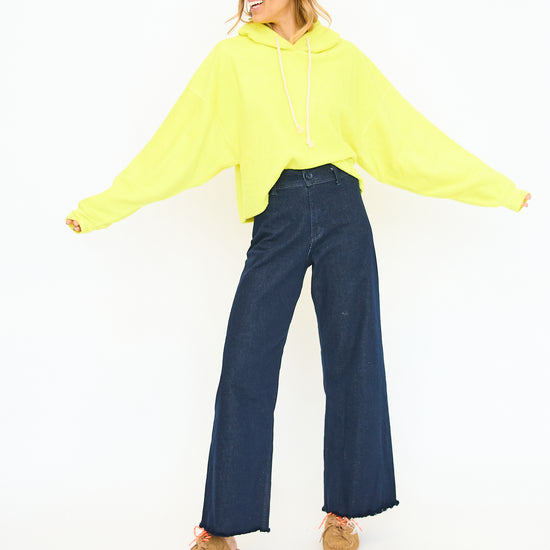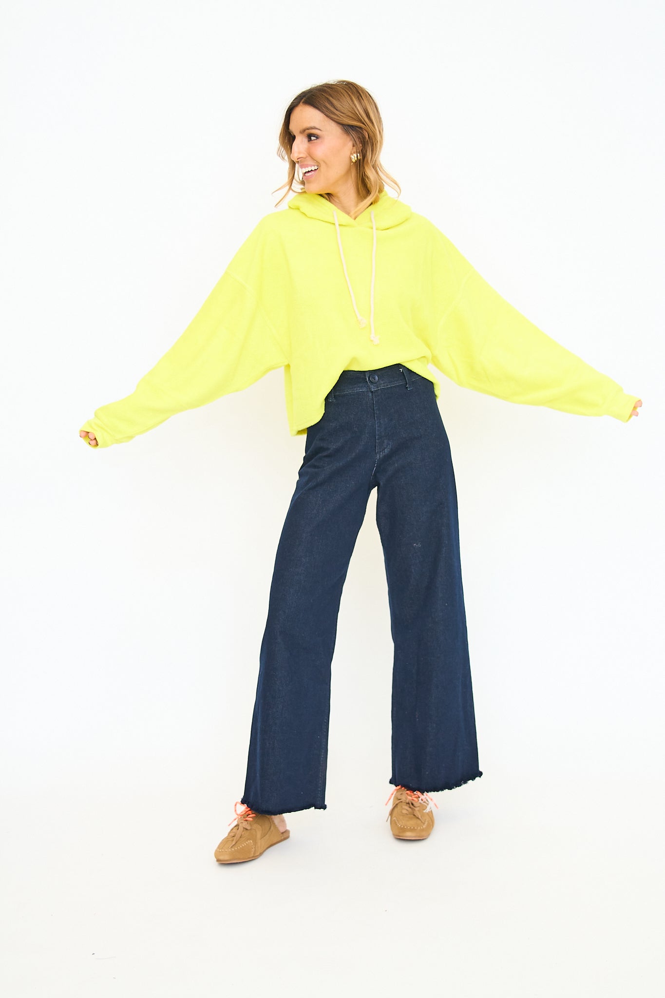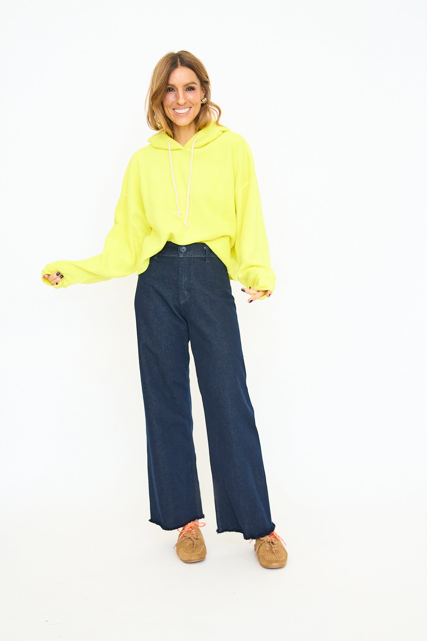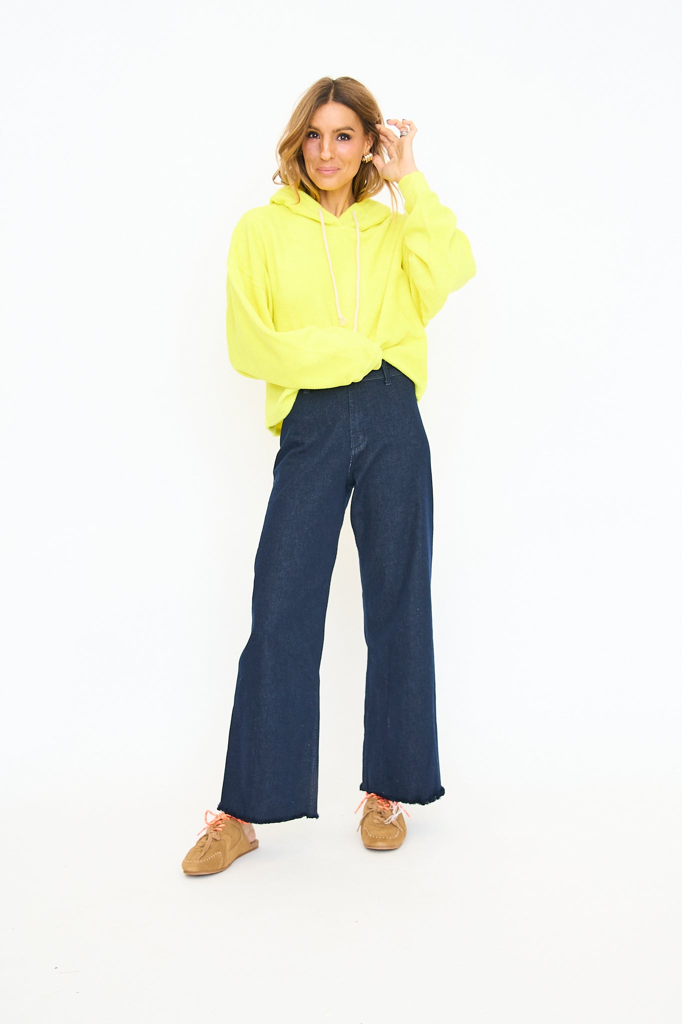 Relaxed fit hoodie with a drawstring hood and drop shoulders. Features long sleeves with ribbed cuffs and a soft, cozy material. Perfect for lounging or casual wear. Paired with high-waisted jeans for a laid-back look.