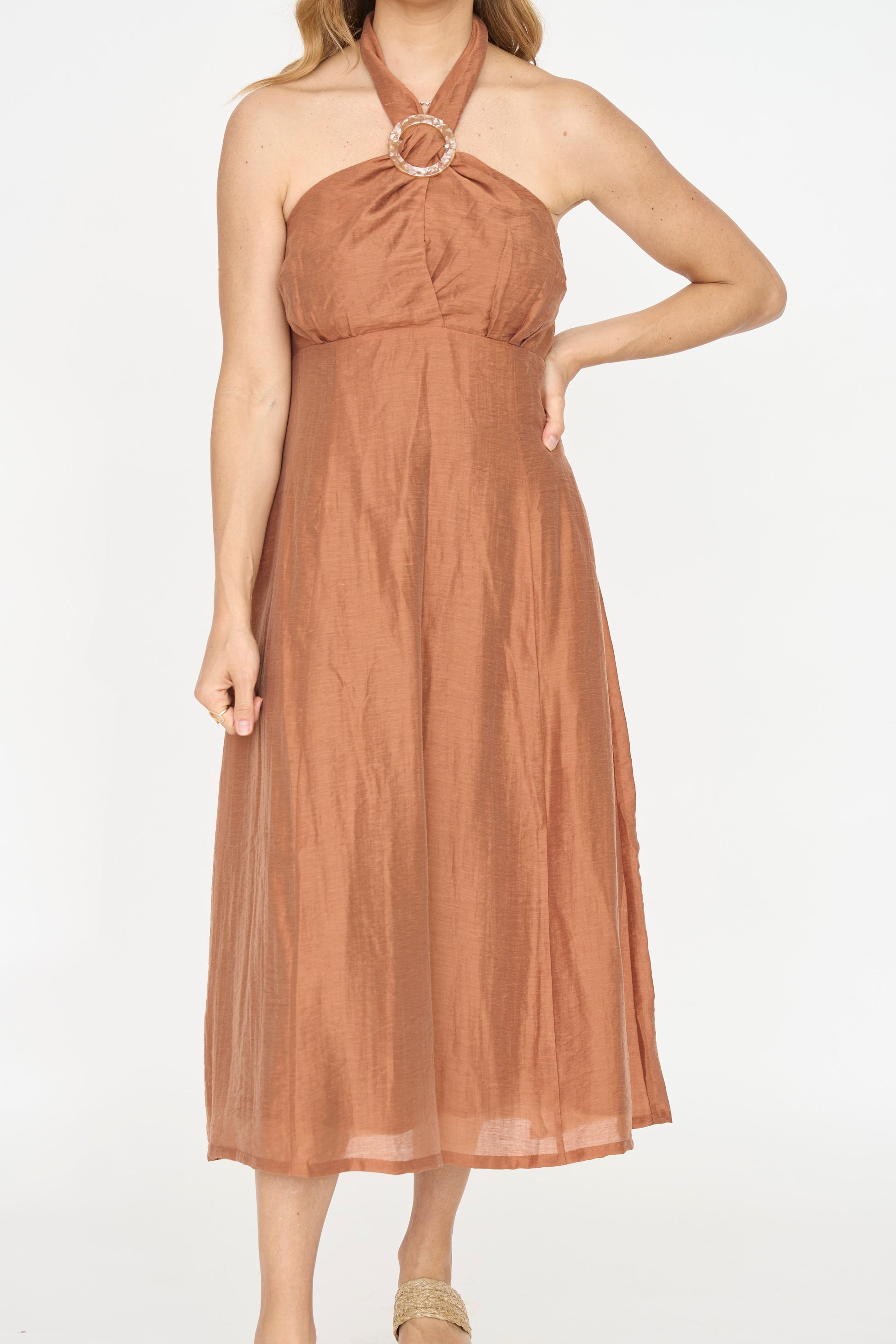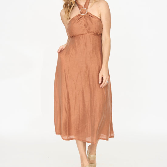 Light up the night in the Pacific Grove Midi Dress! This dress is perfect for elegant occasions as the bust criss crosses to create a peek-a-boo detail and halter with an added buckle detail. The empire waist silhouette and shiny fabric brings a girly glam to this stunning style. Complete with neck buttons and back zipper for closure. The smock detailing also ensures a friendly fit for larger bust sizes.