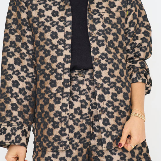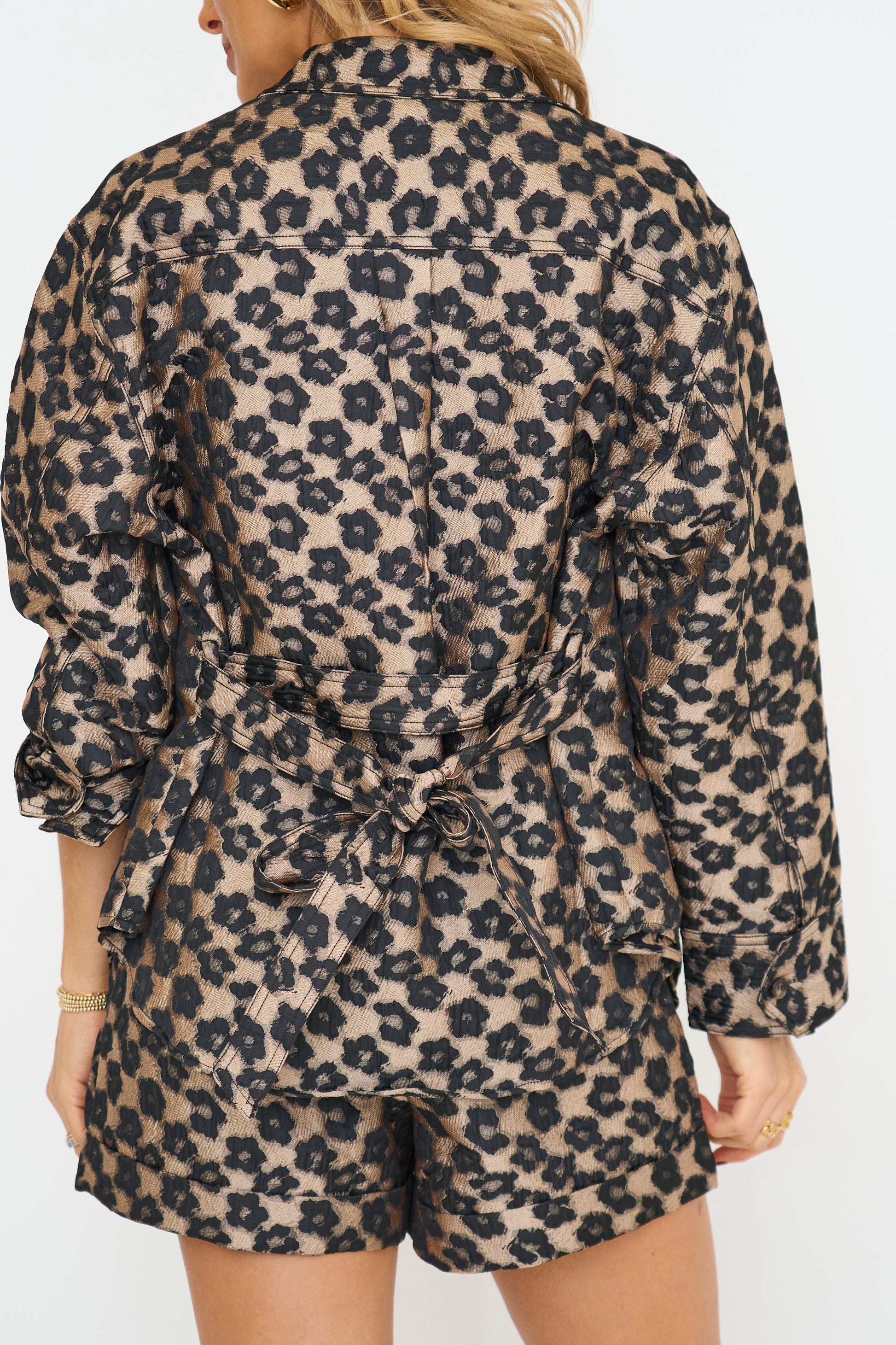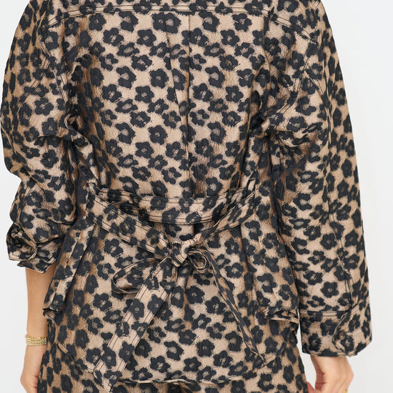 Discover the ultimate in versatility and style with the Pandore Overshirt. This button up jacket features a belted waist for a flattering silhouette, and a textured leopard print that adds a touch of sophistication to any outfit. Perfect for any occasion, this overshirt is a must-have in your wardrobe.