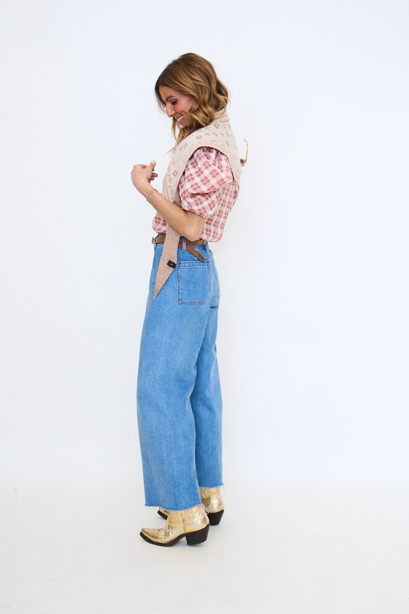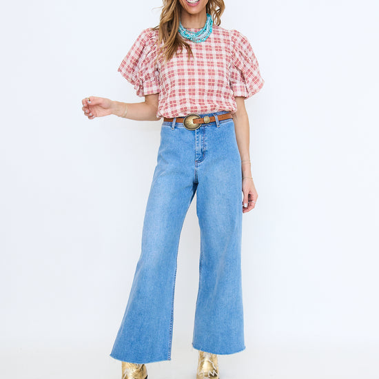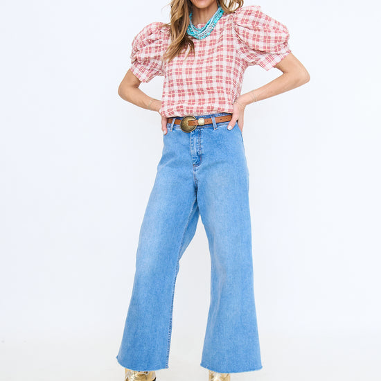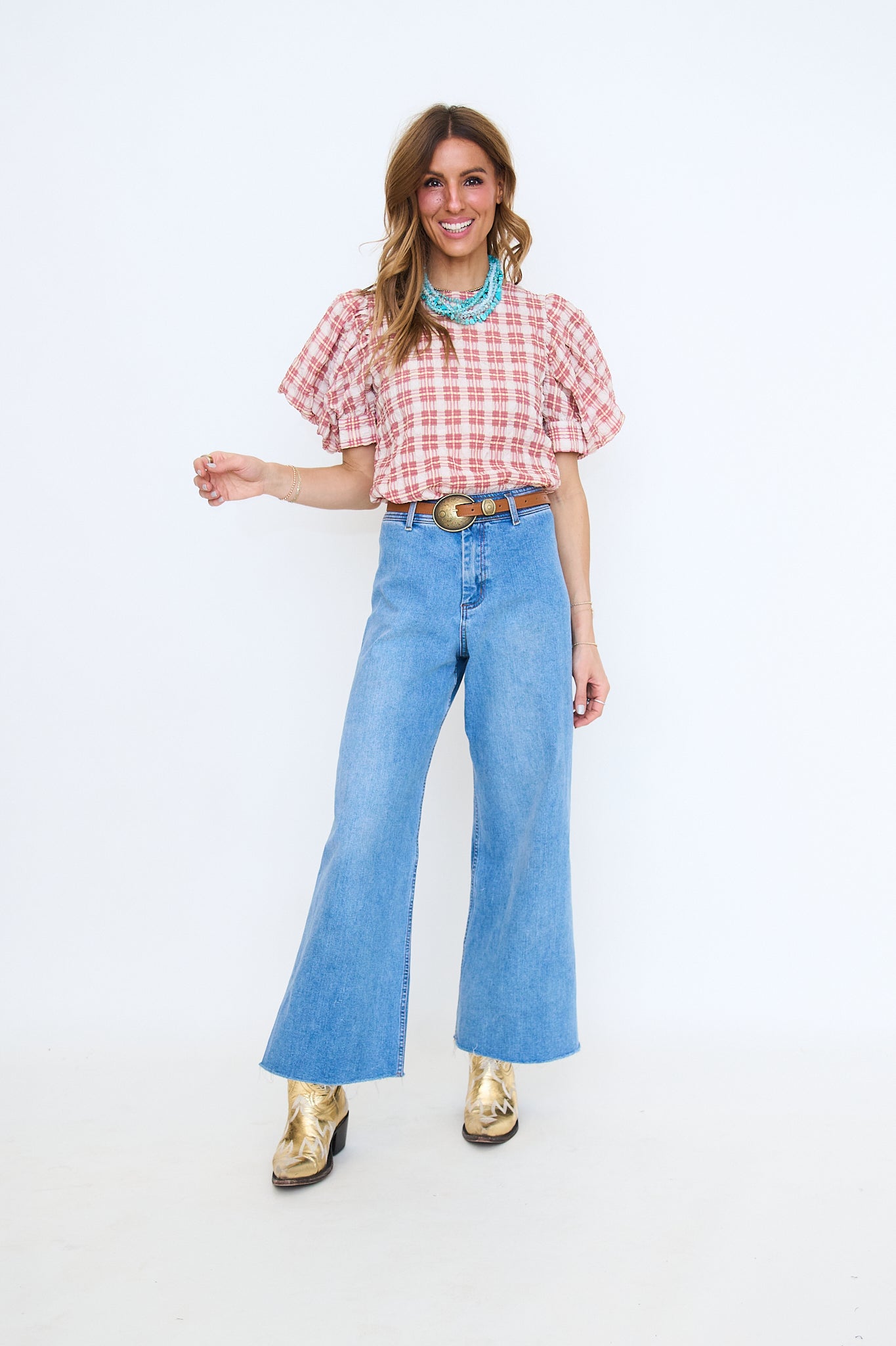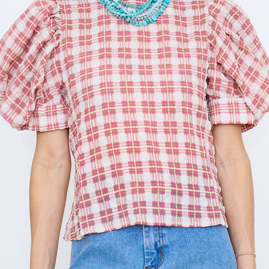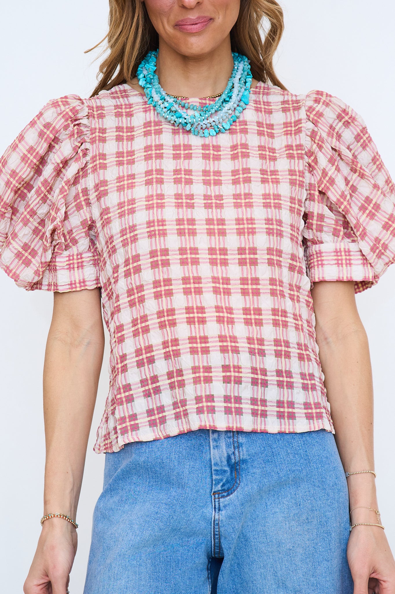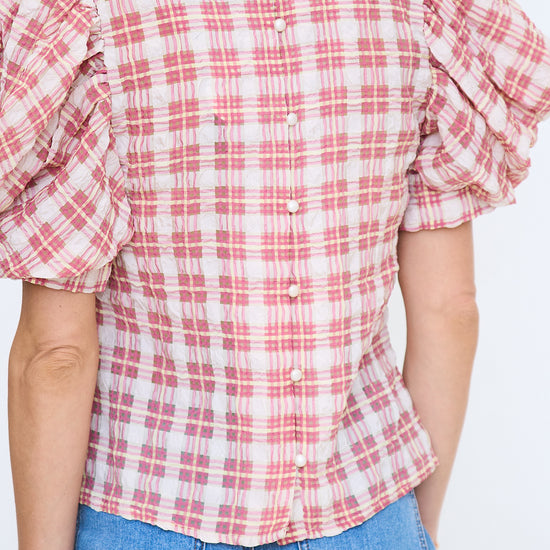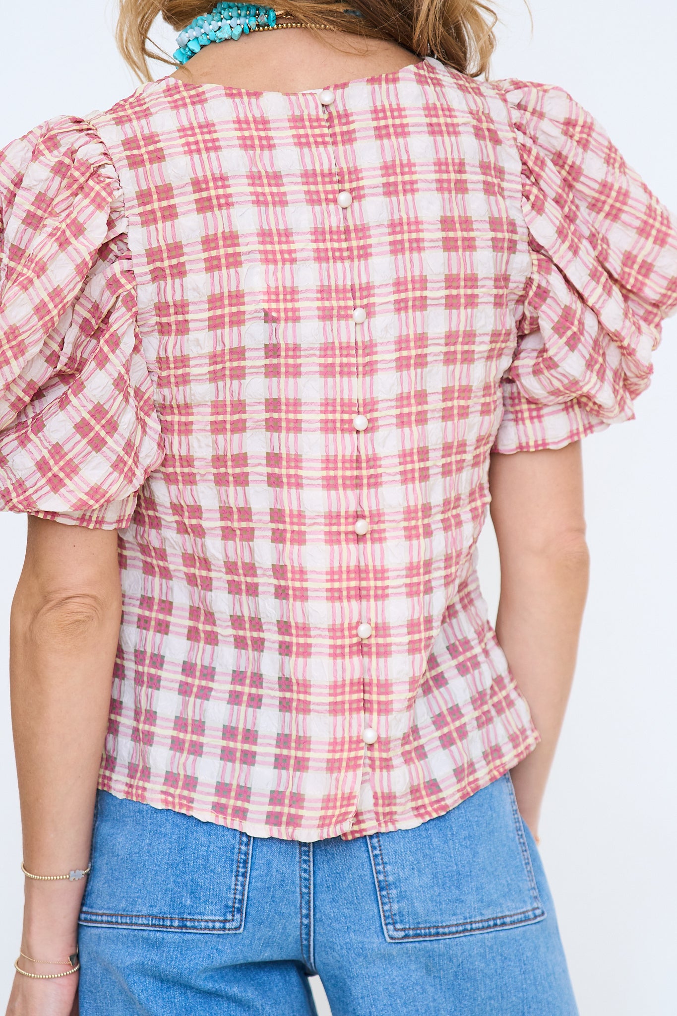 A charming check pattern top featuring puff sleeves and a back button closure. Designed with a lightweight feel and an easy, flattering fit for effortless everyday styling.