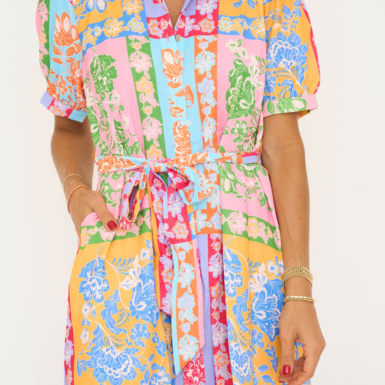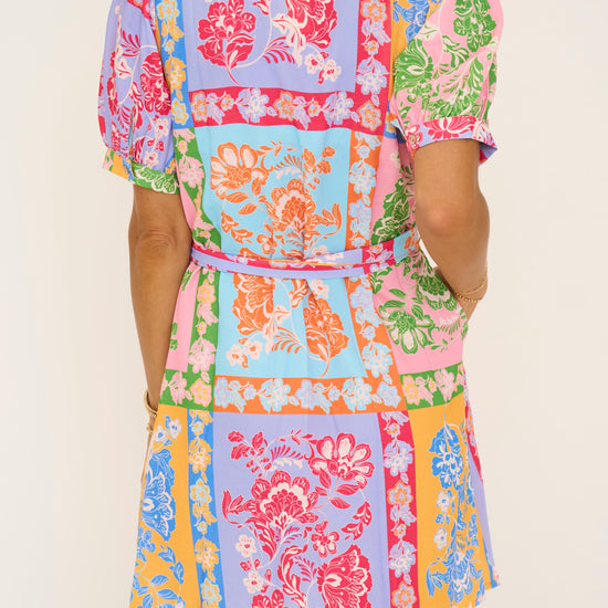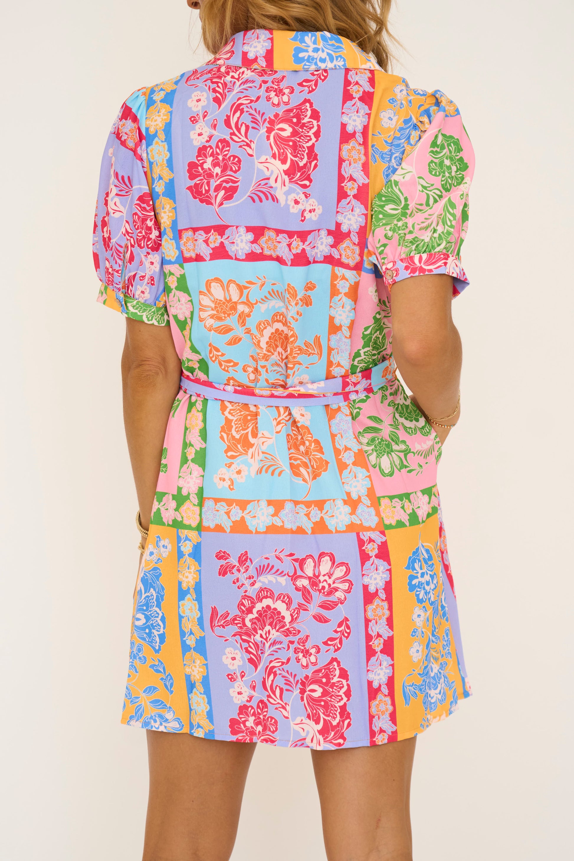Patchwork print dress with open collared neck, front buttoned closure, belted waistline, short sleeves, band cuffs, and side pockets.