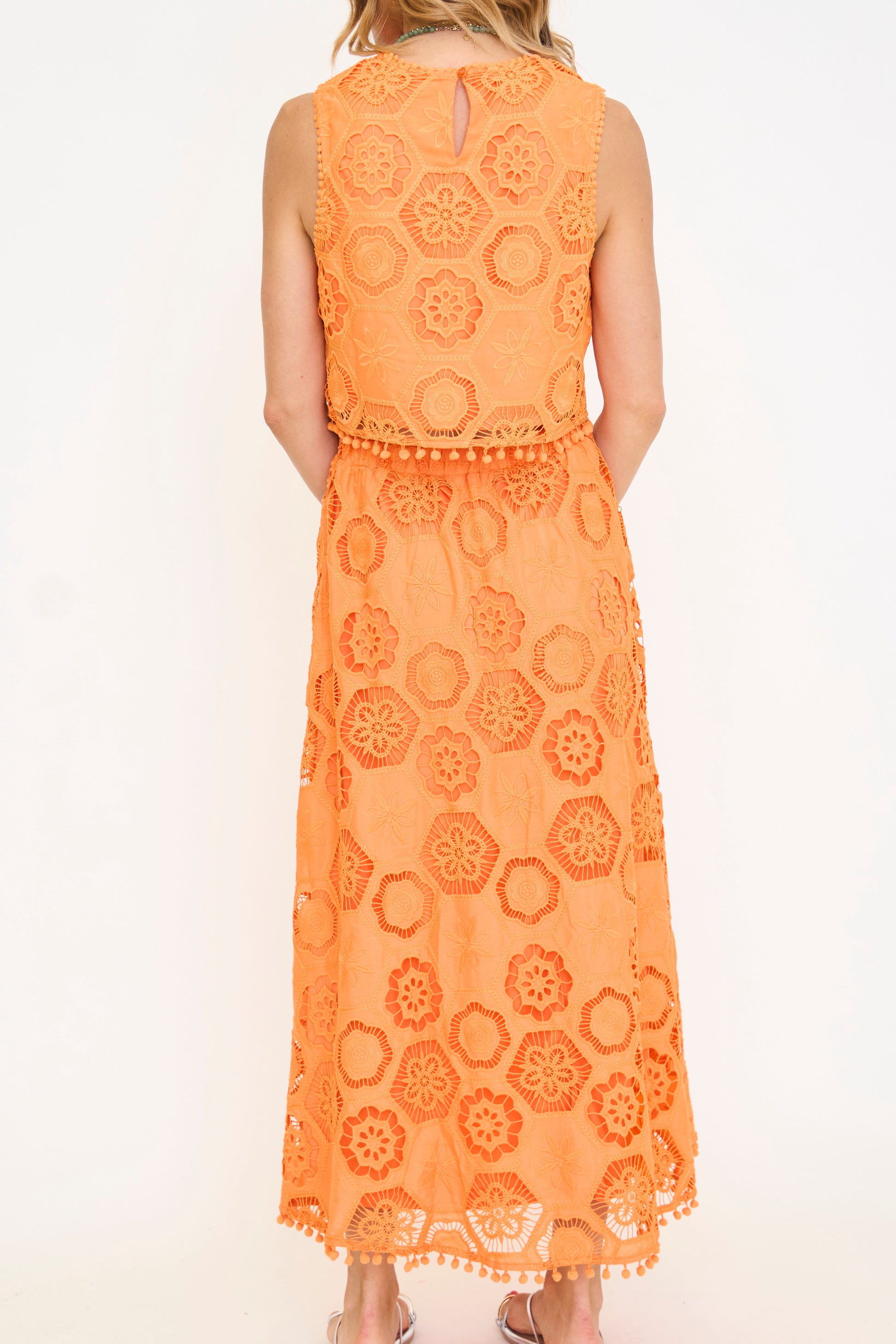Elevate your warm-weather wardrobe with this delightful cropped top featuring a round neckline, elegantly adorned with a circle crochet trim that adds a touch of artisanal charm to both the neckline and sleeves.