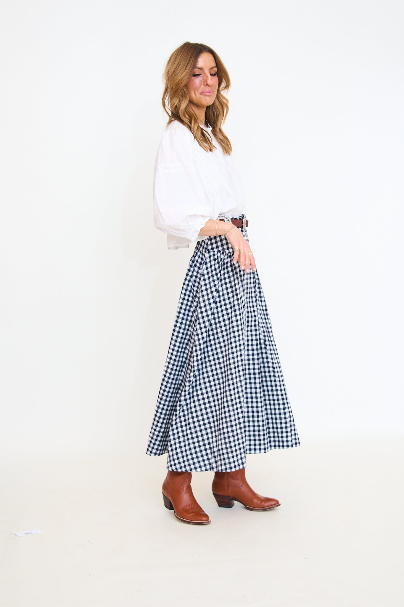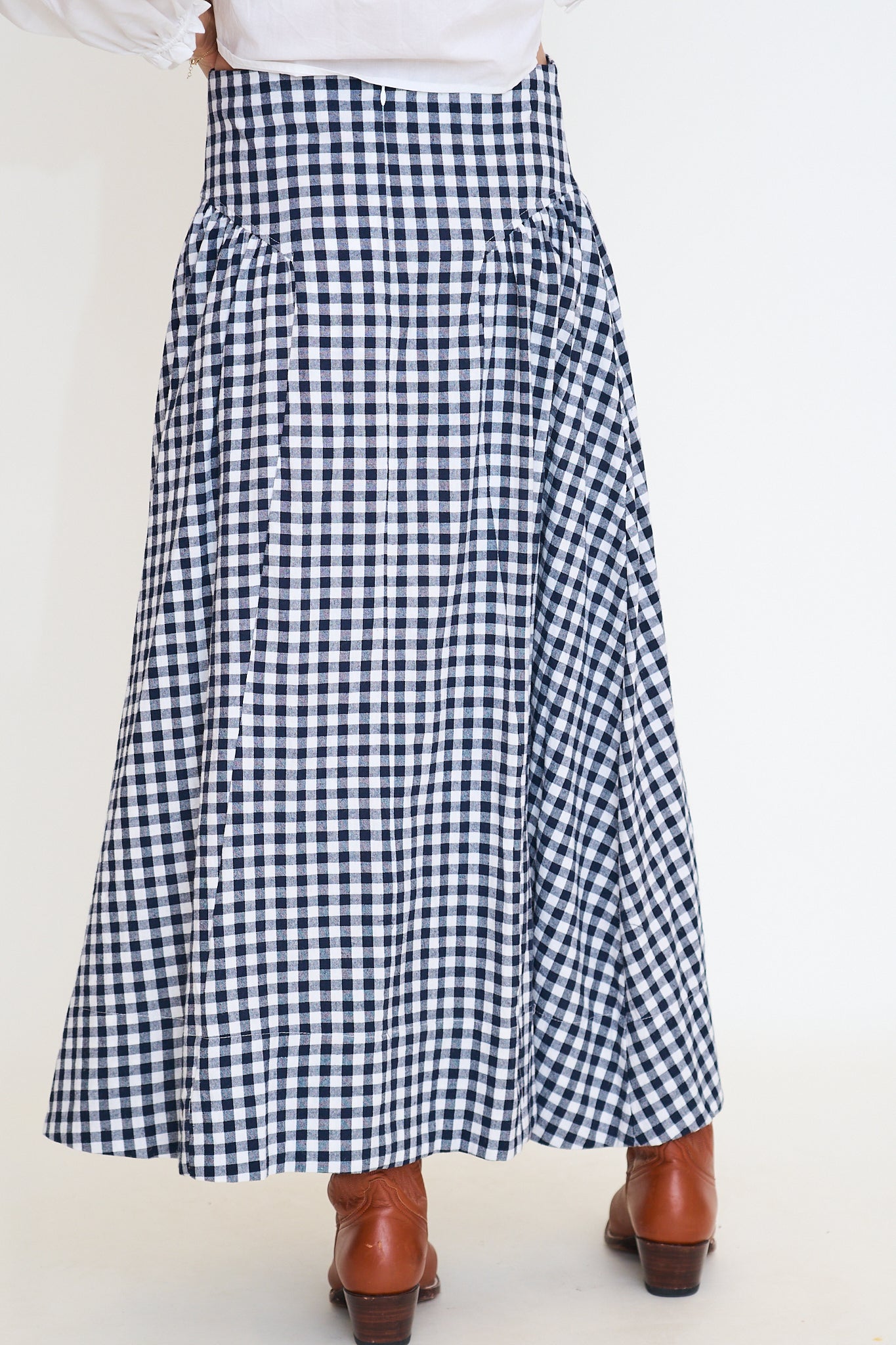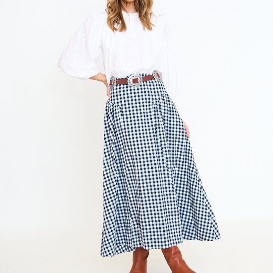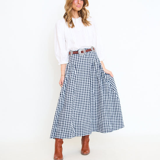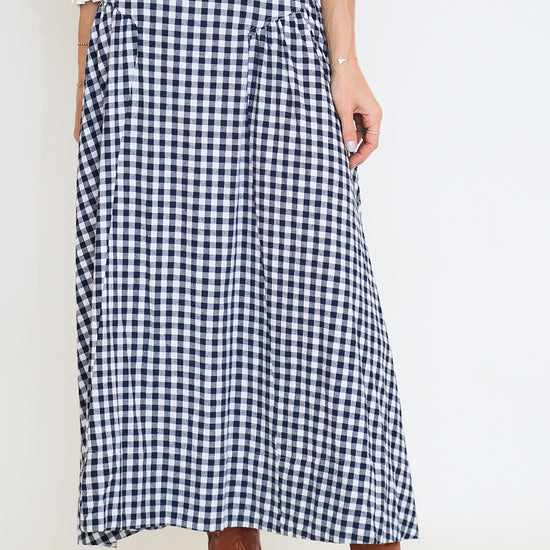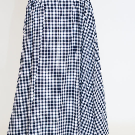 A timeless gingham maxi skirt designed with a structured high waist and gently gathered side panels, creating a feminine and elongated silhouette.