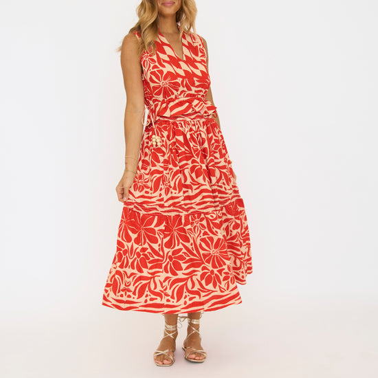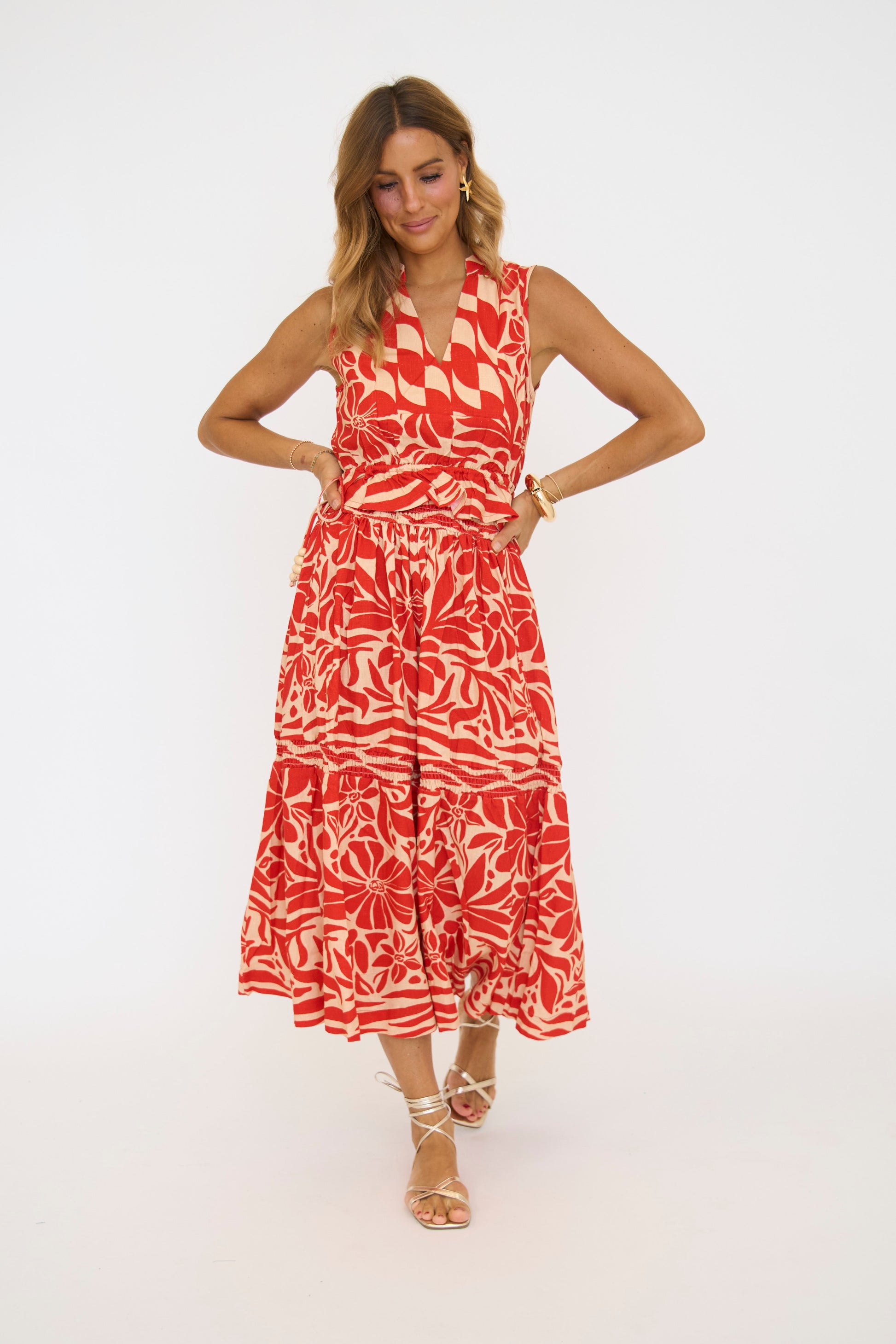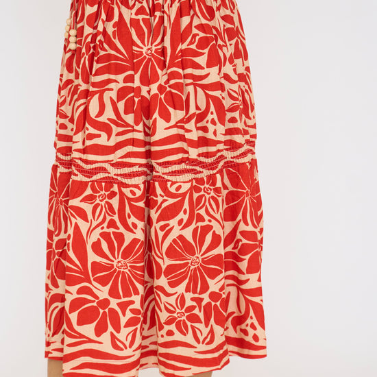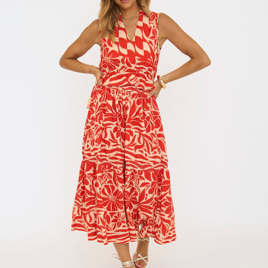 This red and tan patterned midi skirt features a comfortable stretch waistband for an easy fit. Perfect for adding a stylish touch to your everyday wardrobe.