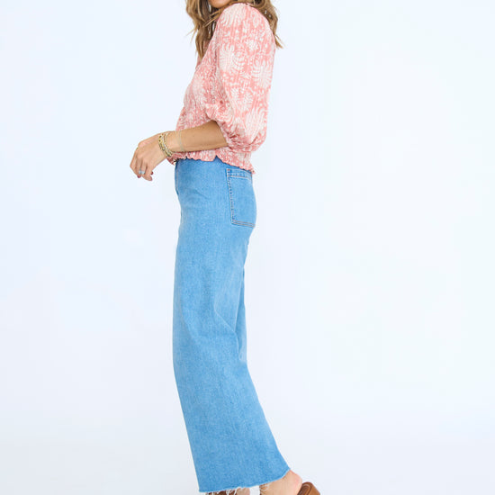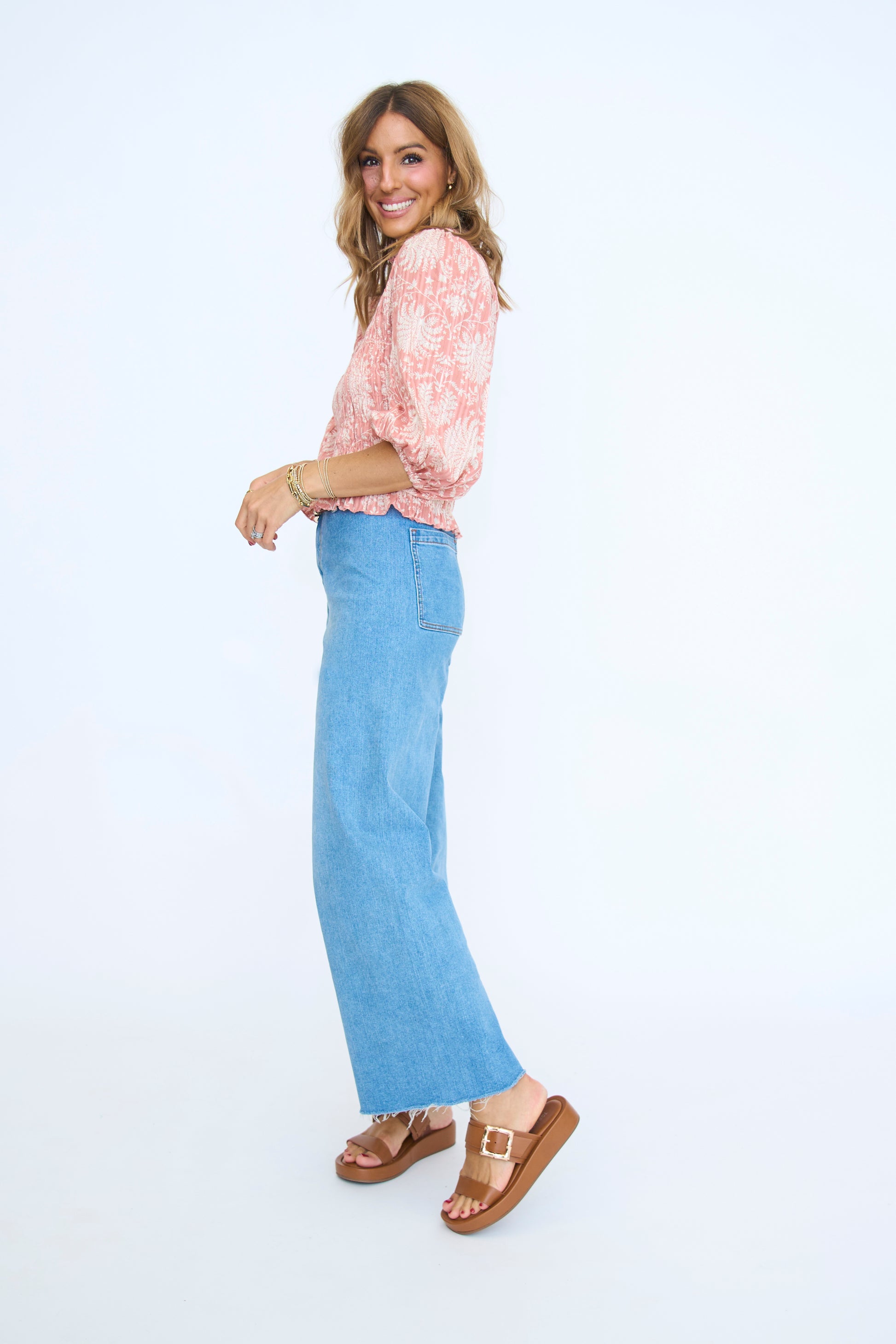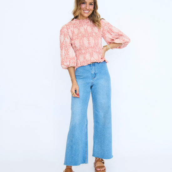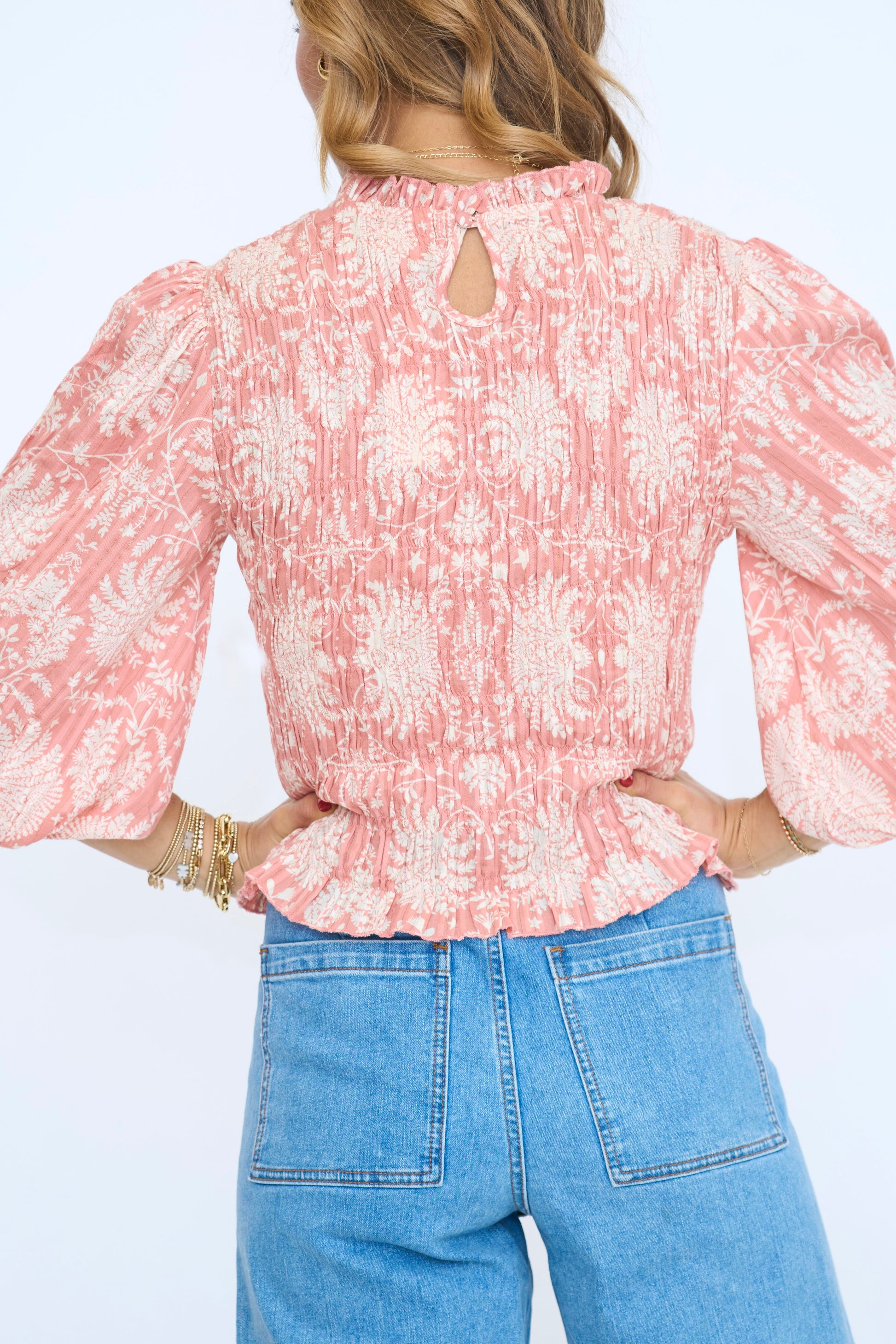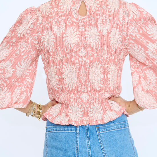 The Rose Gilded Palm Hali Top exudes elegance with its delicate palm print in soft rose hues and shimmering accents. Featuring pleated details and voluminous sleeves, it’s a refined choice for both daytime and evening occasions.
