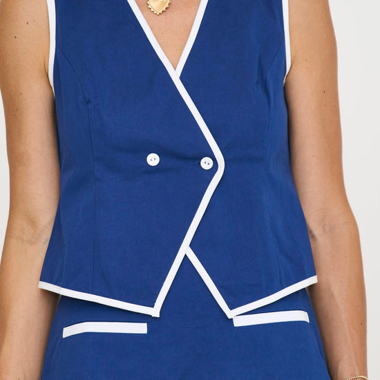 Enhance your wardrobe with our Sailor's Voyage Vest Top, featuring a sophisticated navy and white contrast design, perfect for a nautical vibe. Made with cotton twill fabrication, this versatile top is perfect for mixing with denim or pairing with a skirt for a stylish look. Get ready to set sail in style.