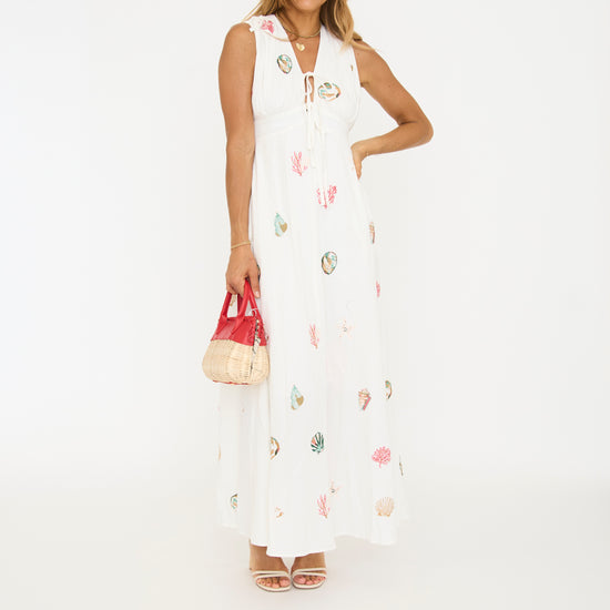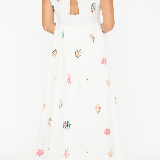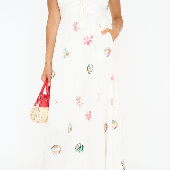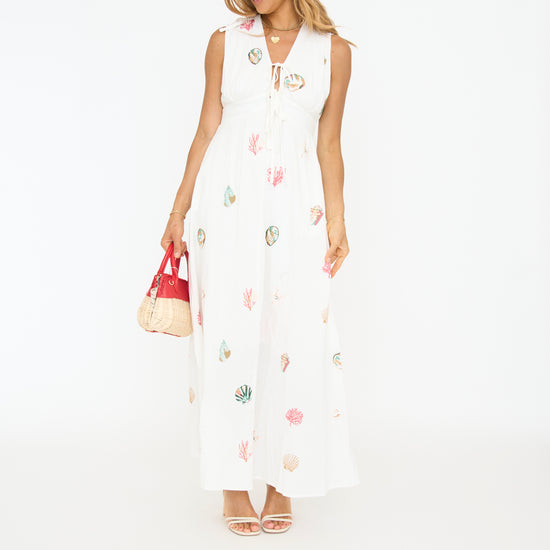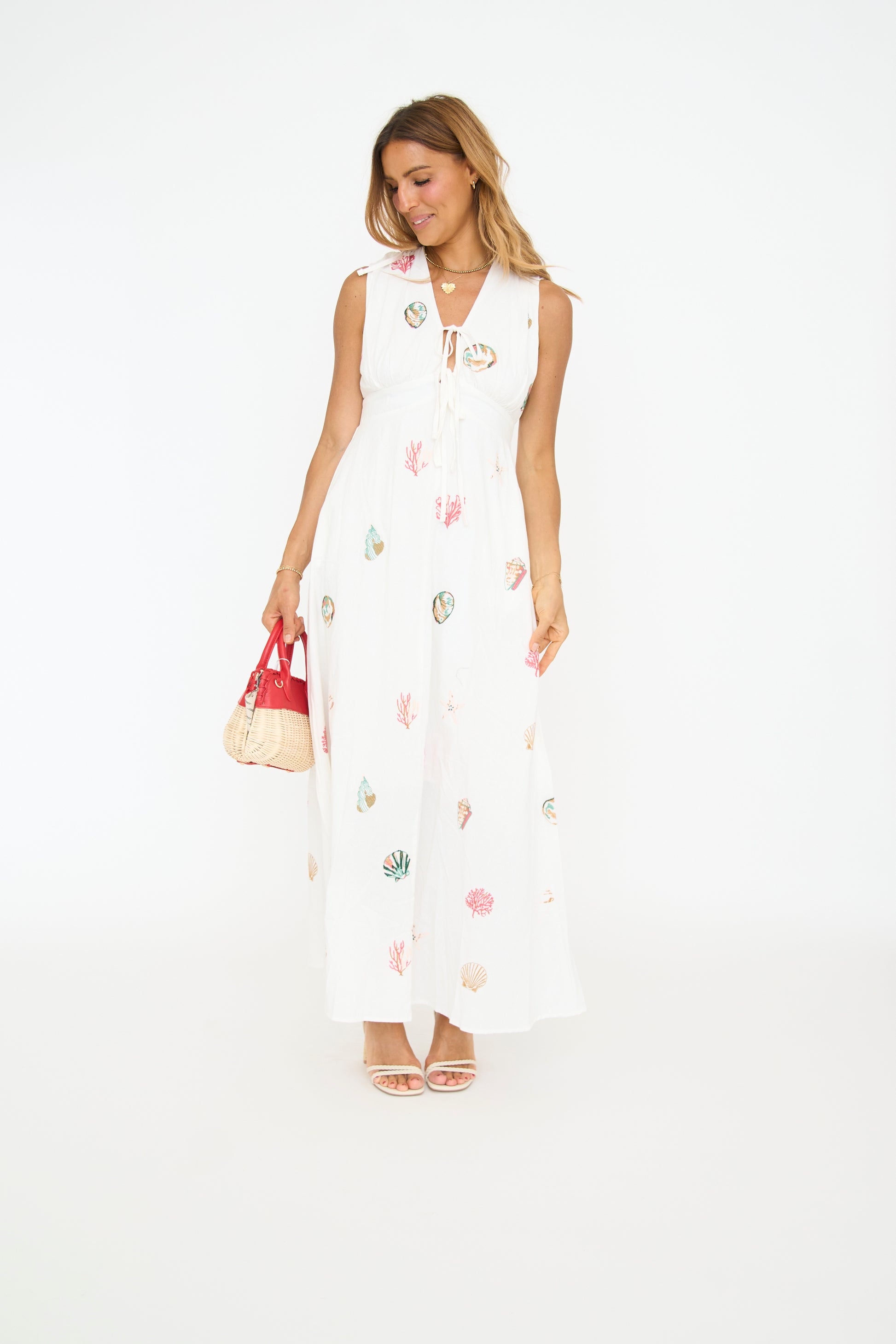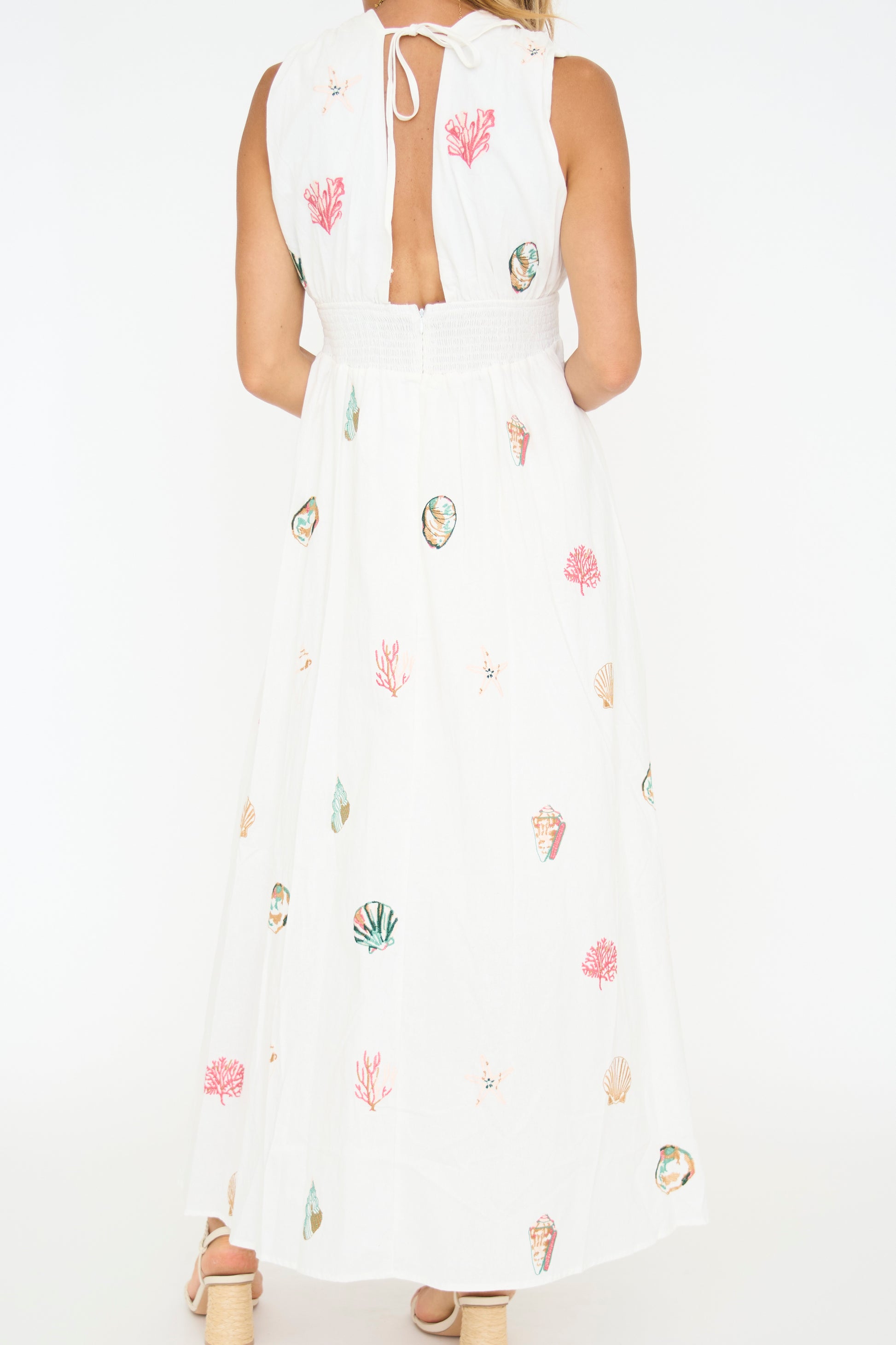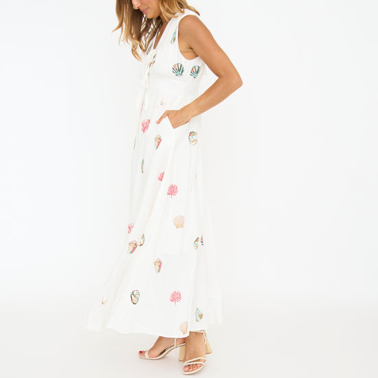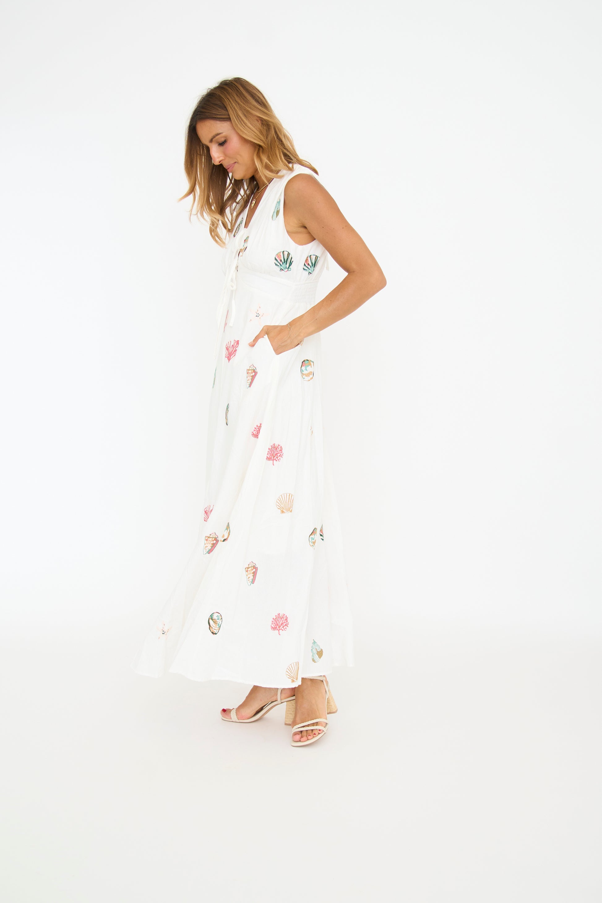 Whimsical embroidered seashell motifs enliven this linen feel 100% cotton designed with a ruched bodice and plunged neckline in a maxi length and spaghetti tie front.