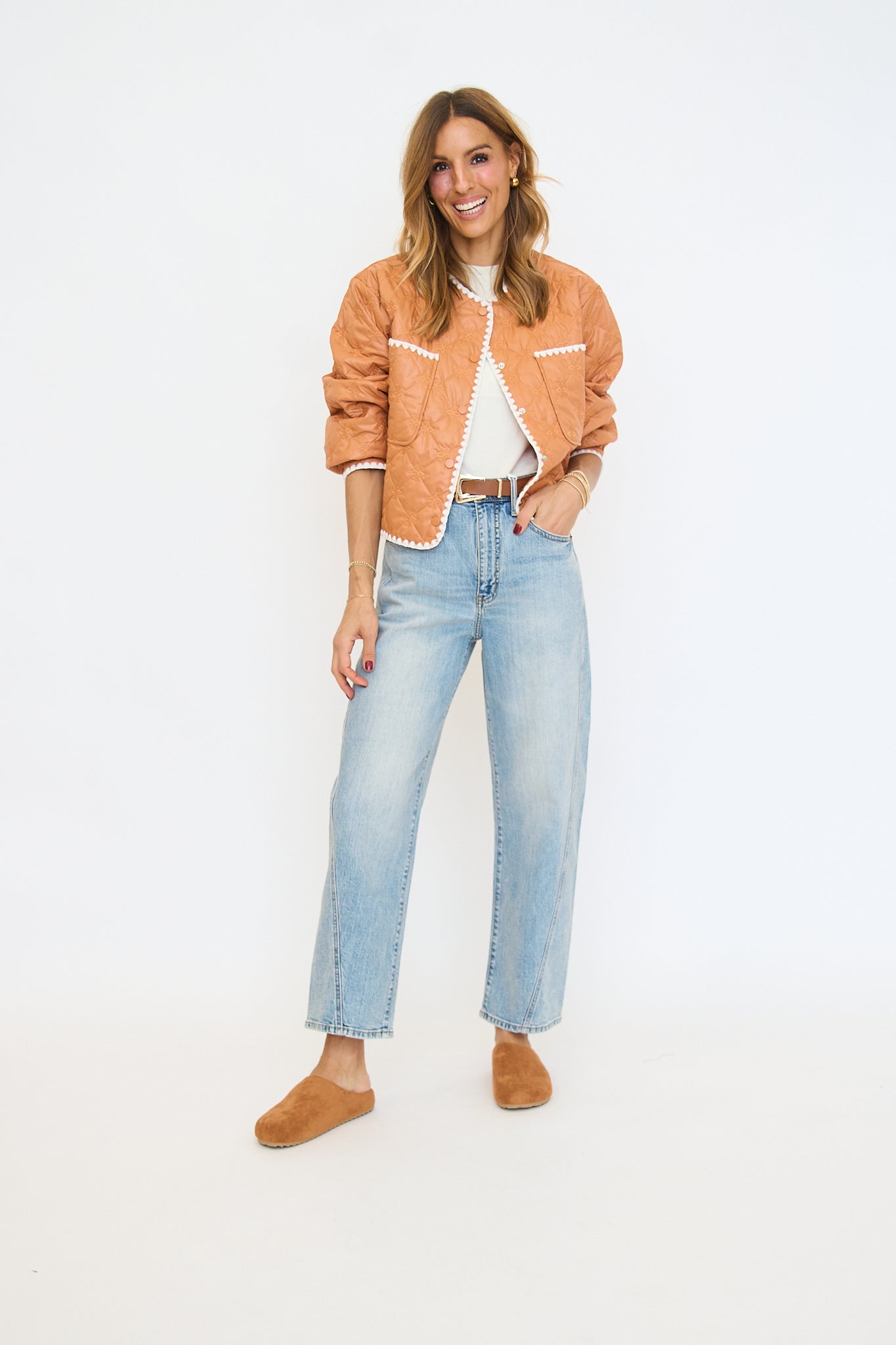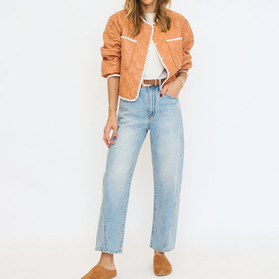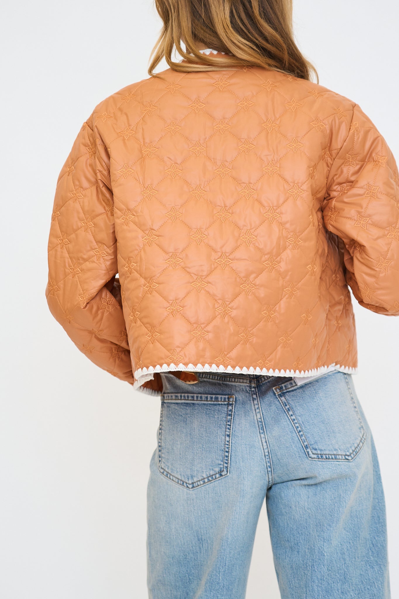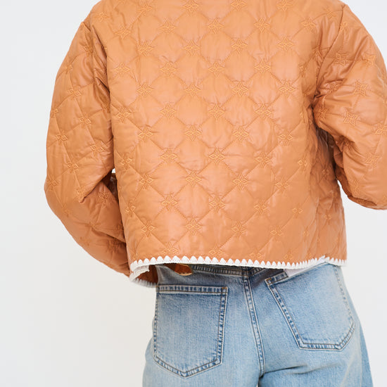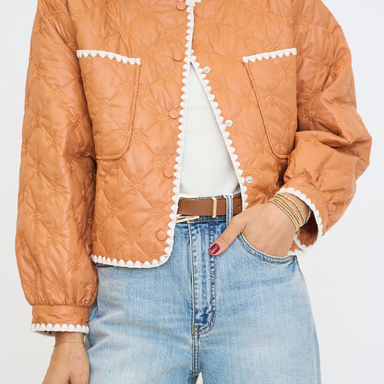 This quilted jacket features an allover diamond stitch pattern and a boxy, cropped silhouette for a modern, cozy vibe. It's accented with contrast scallop trim along the neckline, button placket, cuffs, and pockets for a charming touch. Finished with front patch pockets and snap button closures, it's the perfect blend of cute and functional.